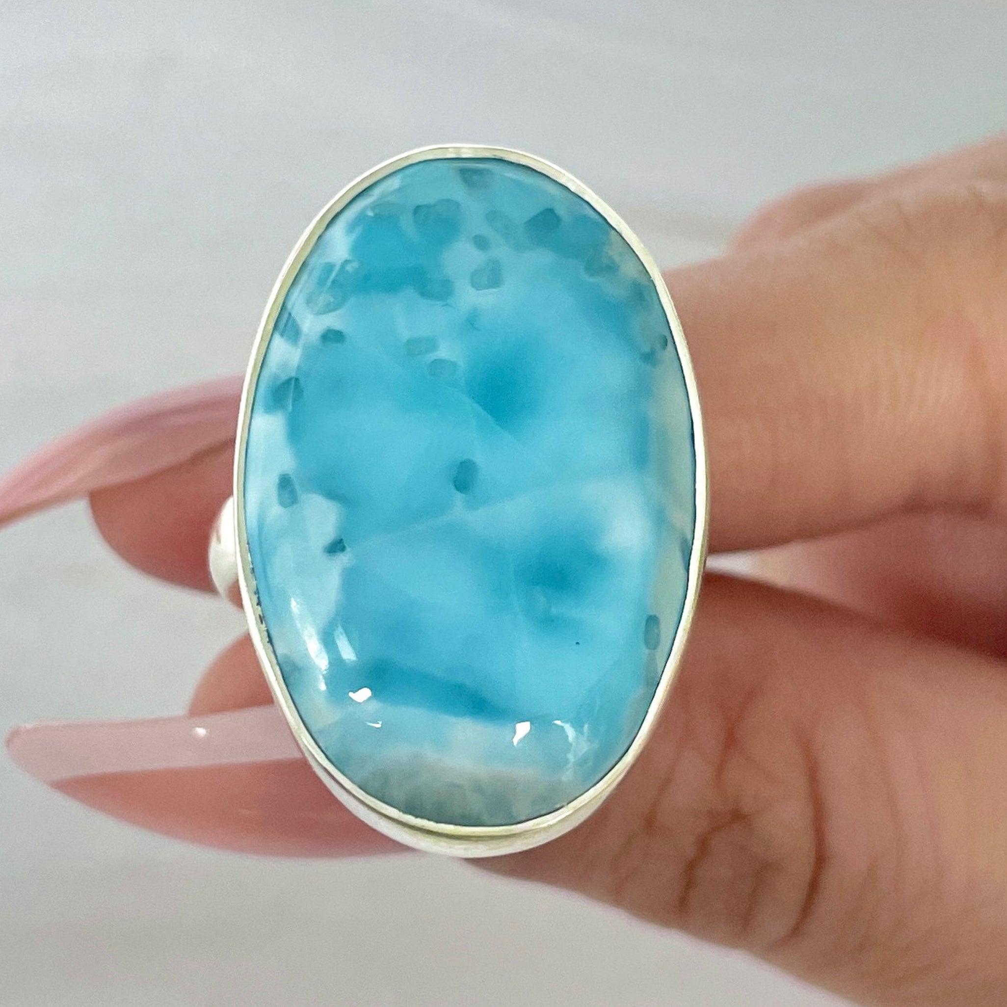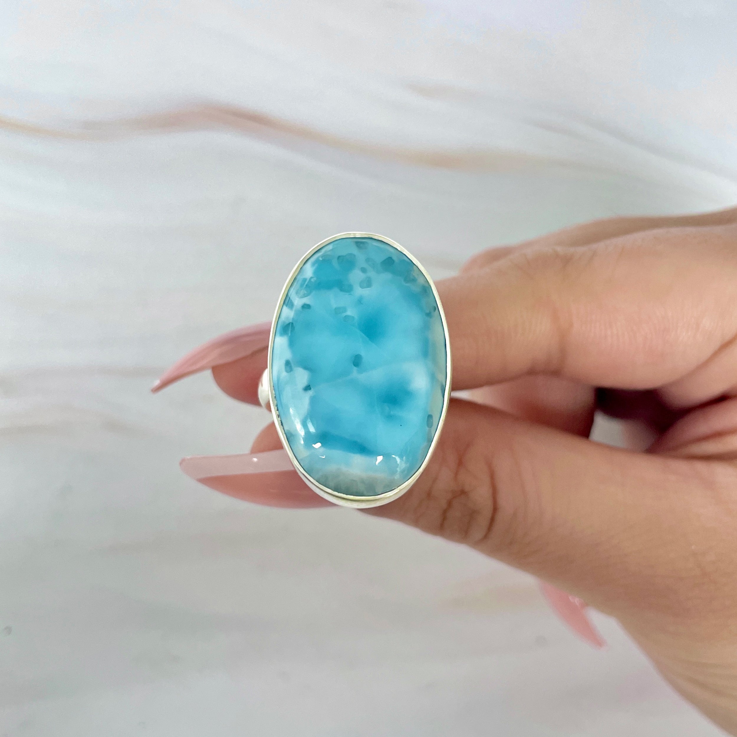 Un inel unicat din larimar natural, cunoscut drept piatra cerului și a oceanului. Nuanțele sale de albastru acvatic, cu reflexii albe ca valurile mării, aduc liniște interioară și o senzație de libertate infinită.