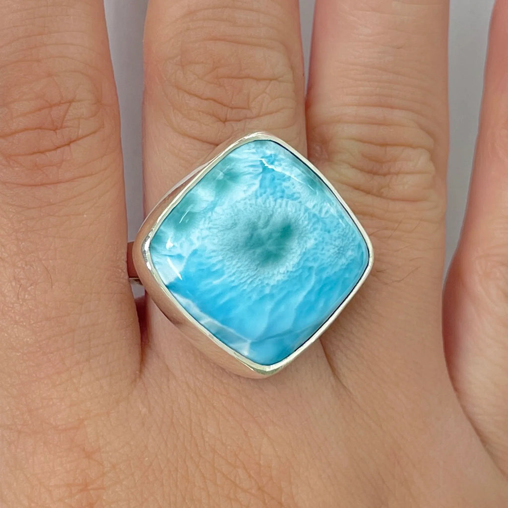 Poartă acest inel cu Larimar natural pentru a aduce în viața ta frumusețea oceanului și liniștea interioară – o bijuterie rară, unică, născută din natură și desăvârșită în argint.