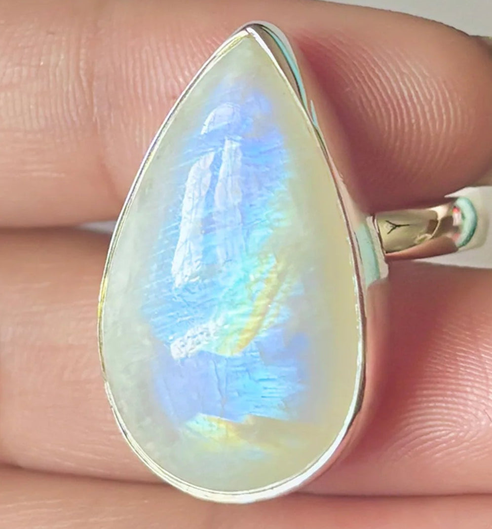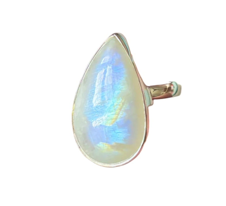 Un inel unicat cu piatră a lunii curcubeu, care emană mister și rafinament. Reflexele albastre și aurii se dezvăluie în valuri delicate de lumină, asemenea unei eclipse care dansează între umbră și strălucire.