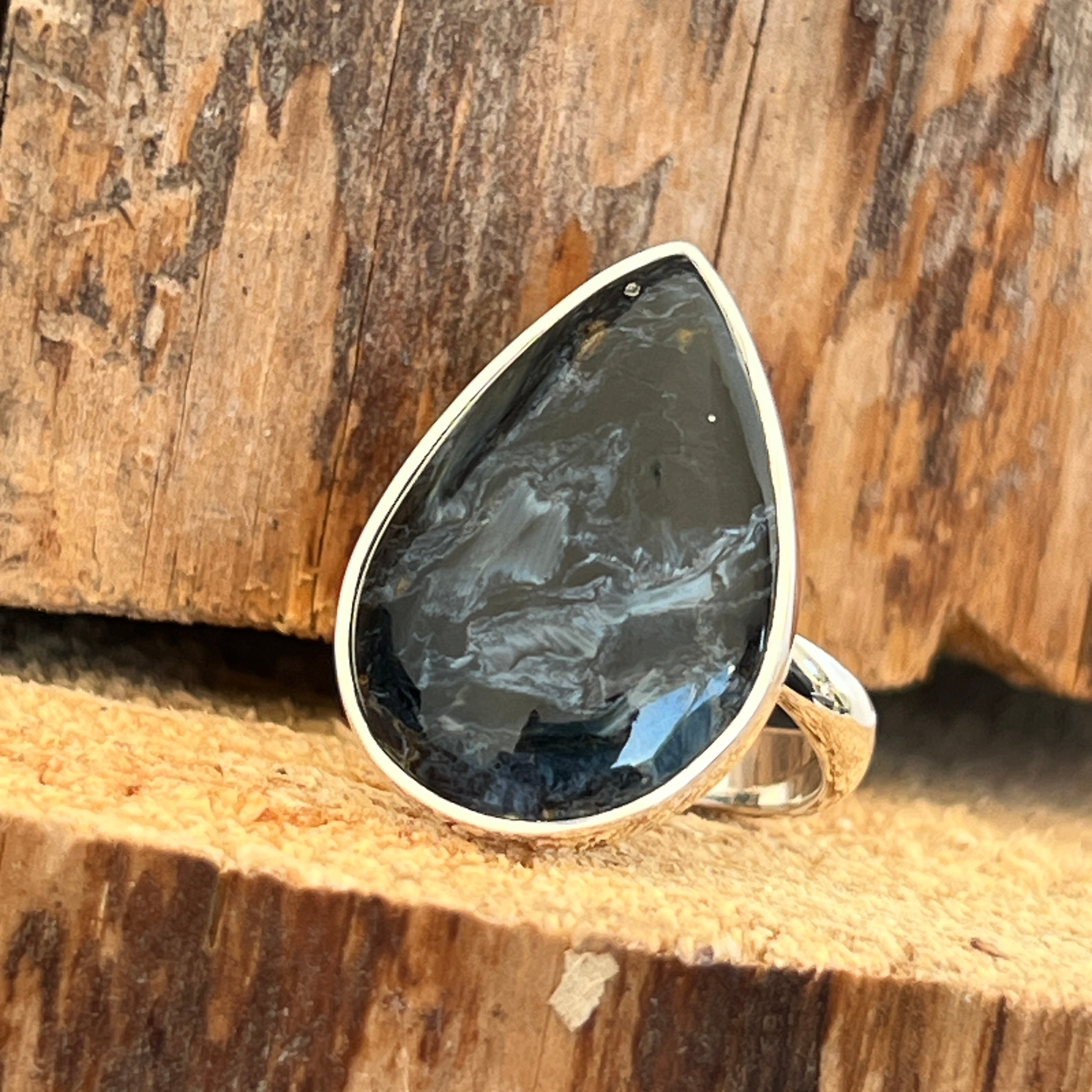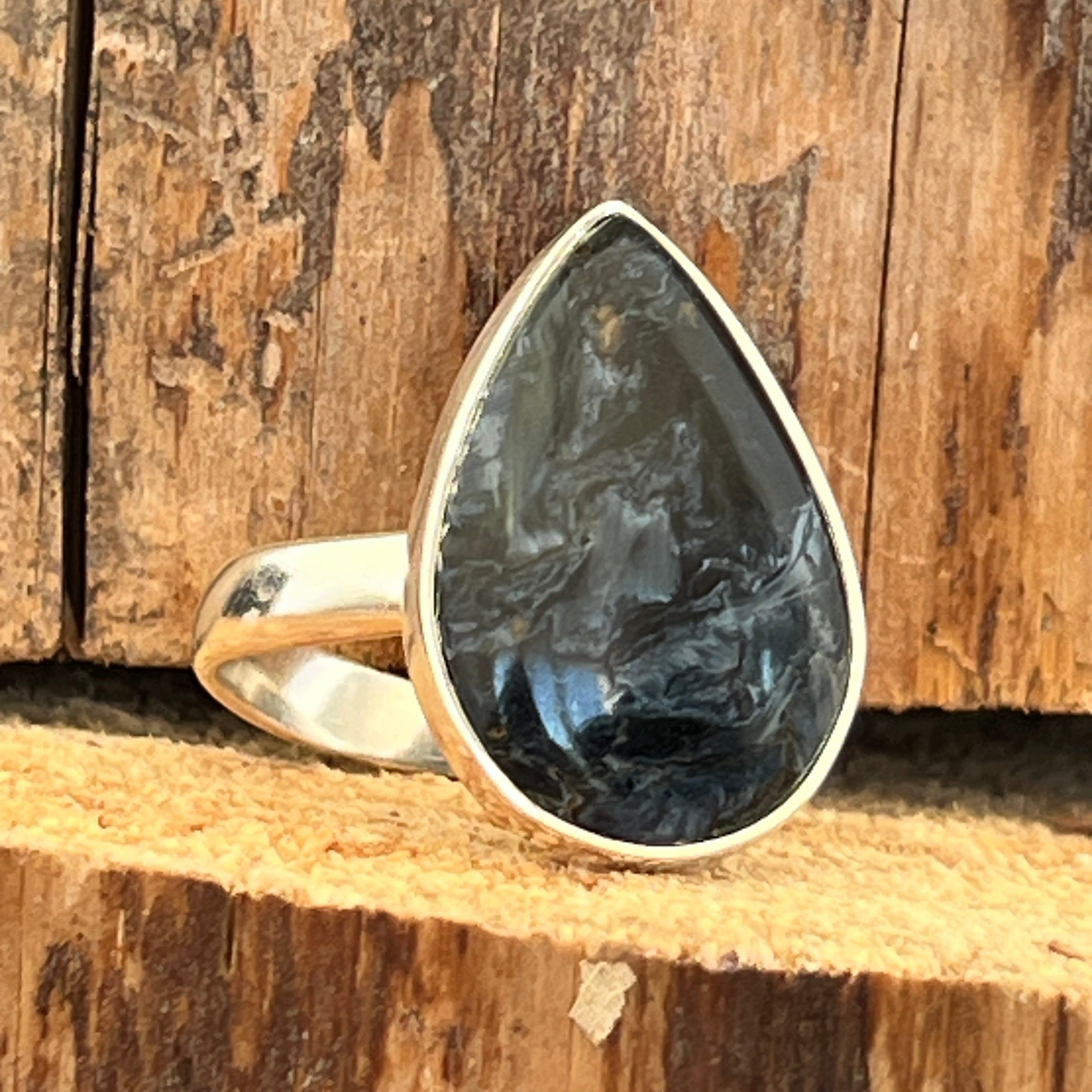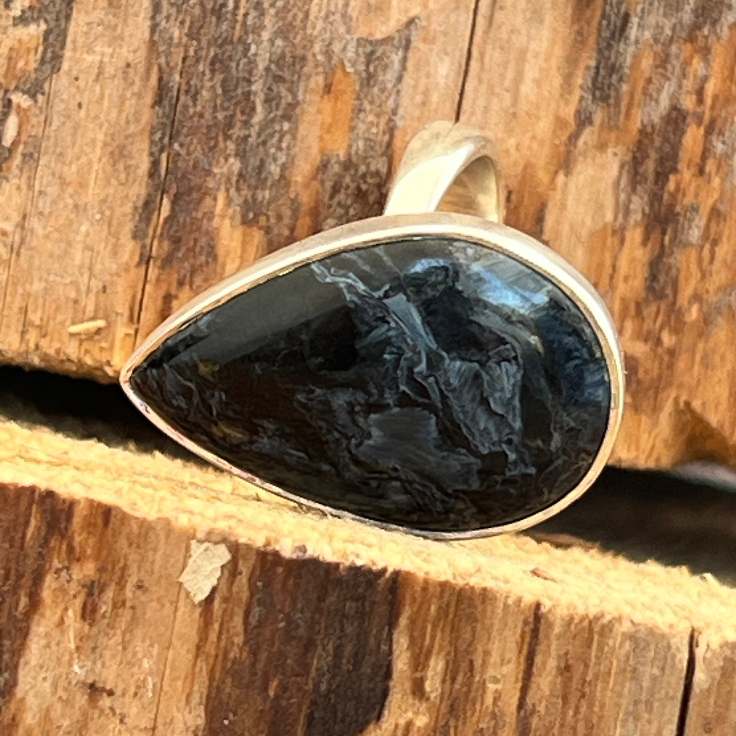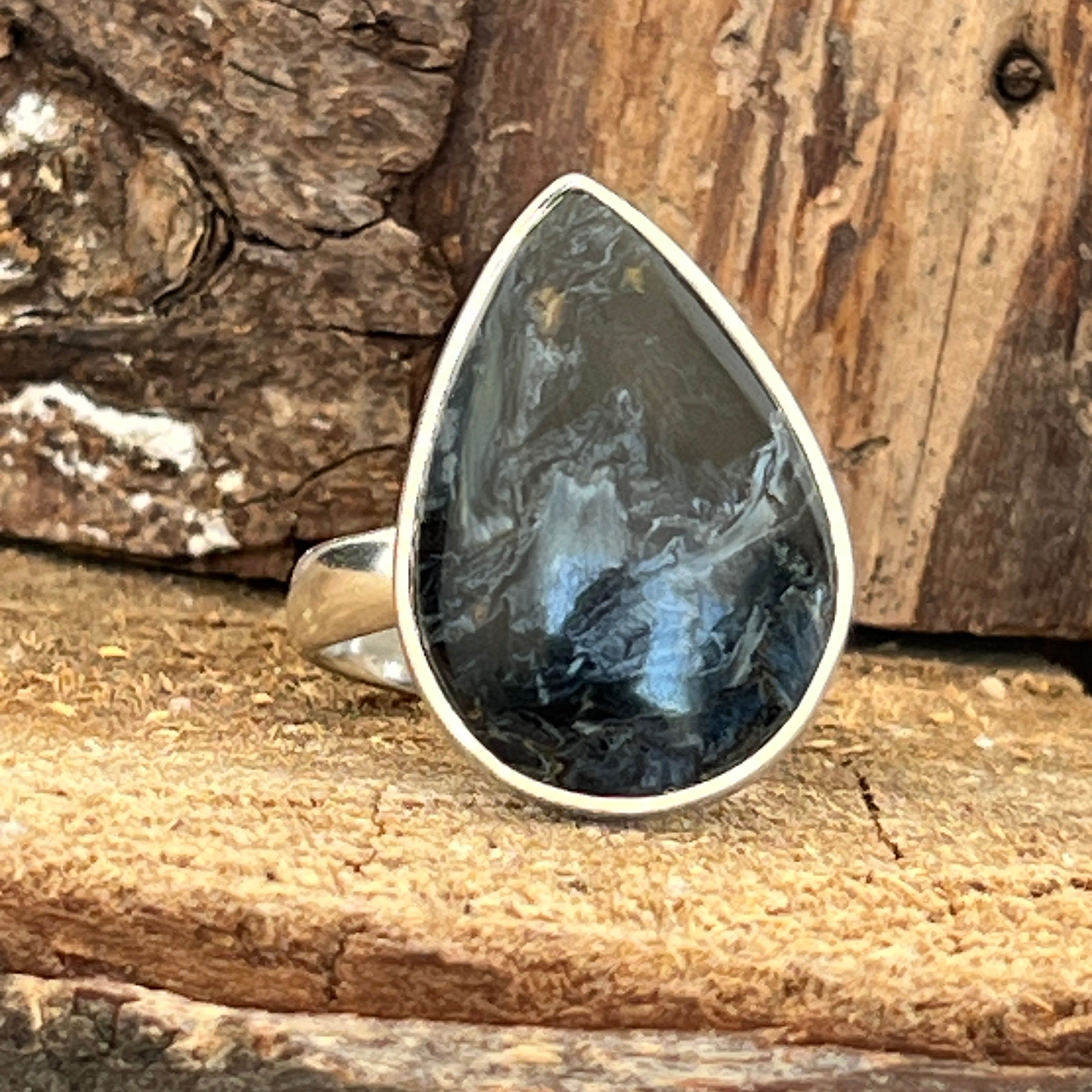 Acest inel impresionant, realizat din argint 925, este împodobit cu un cabochon de pietersit natural în formă de drop. Textura pietrei dezvăluie nuanțe profunde de albastru, negru și reflexe aurii, ce amintesc de vârtejul unei furtuni privite pe cerul nopții.