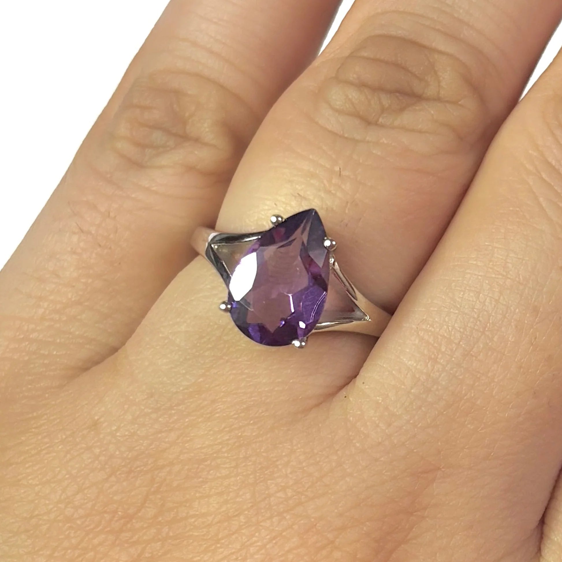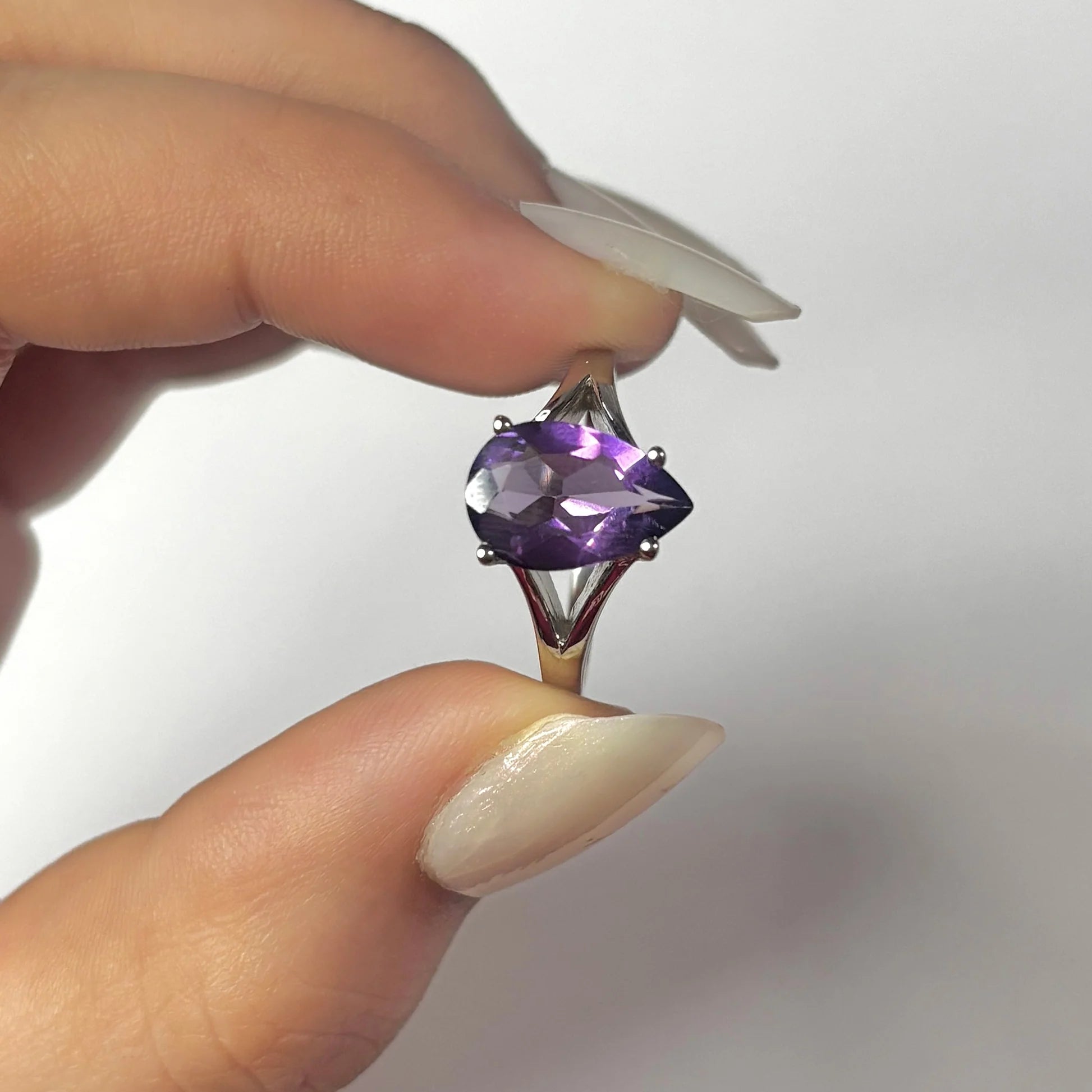 Inelul Wisdom din argint 925 cu ametist natural este o bijuterie ce poartă eleganța în forma sa pură. Tăietura în formă de pară a pietrei creează o strălucire unică, care pune în valoare nuanța sa violet profund, asociată dintotdeauna cu spiritualitatea și înțelepciunea.