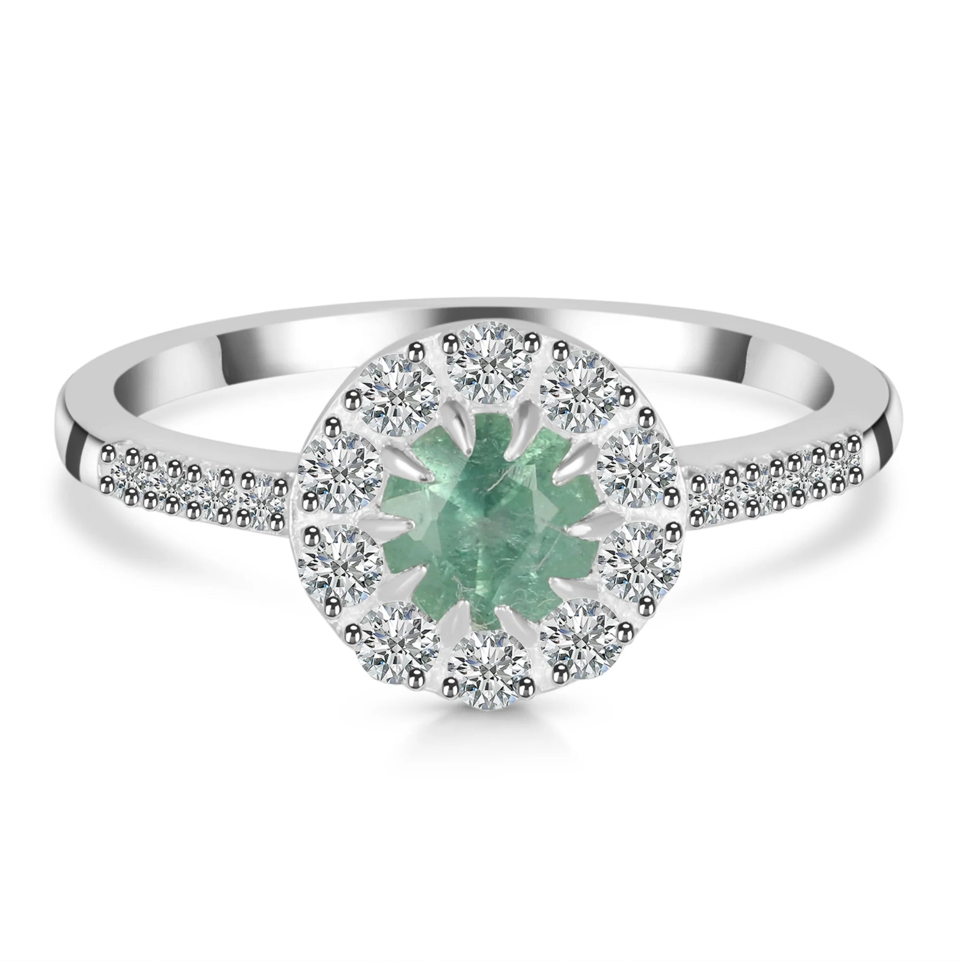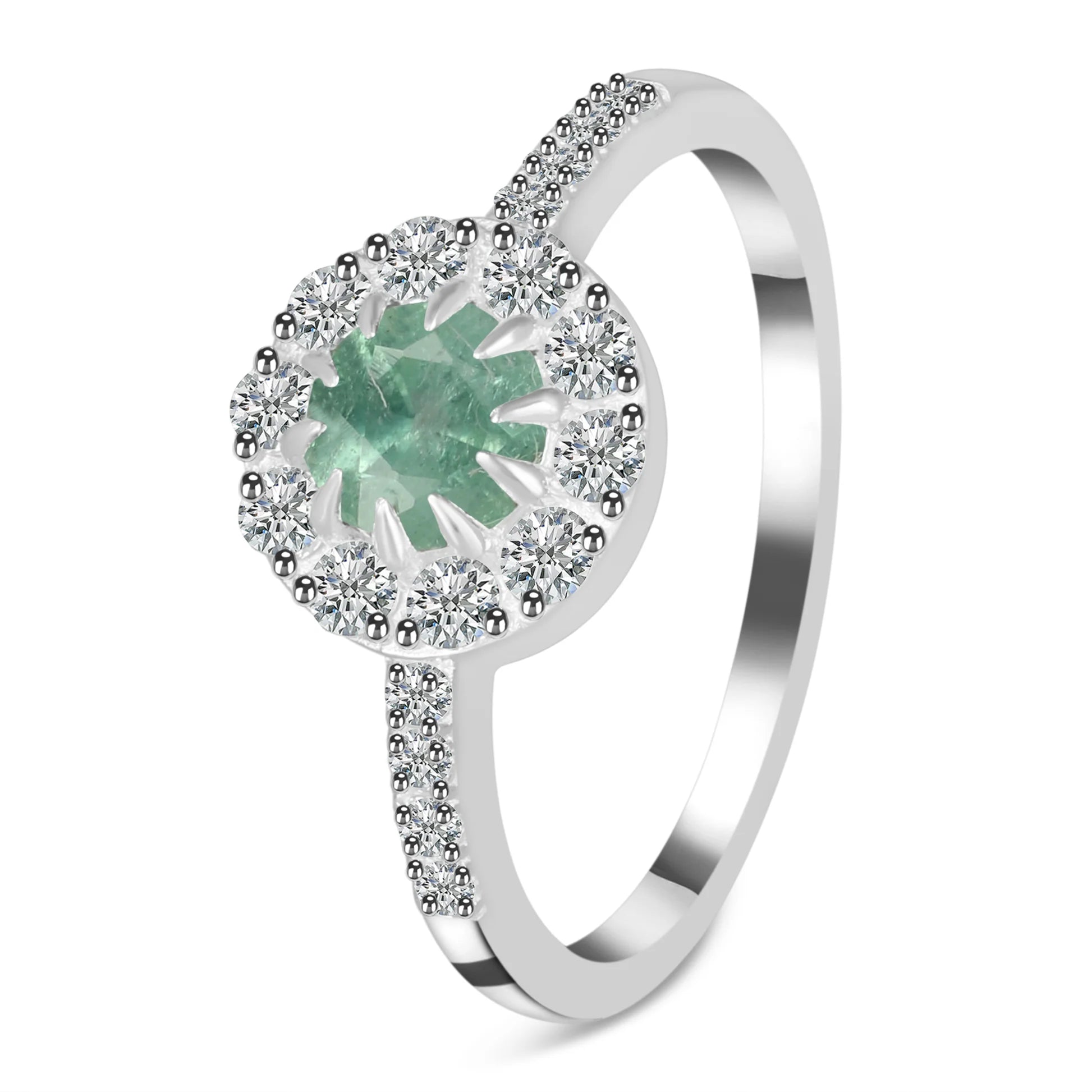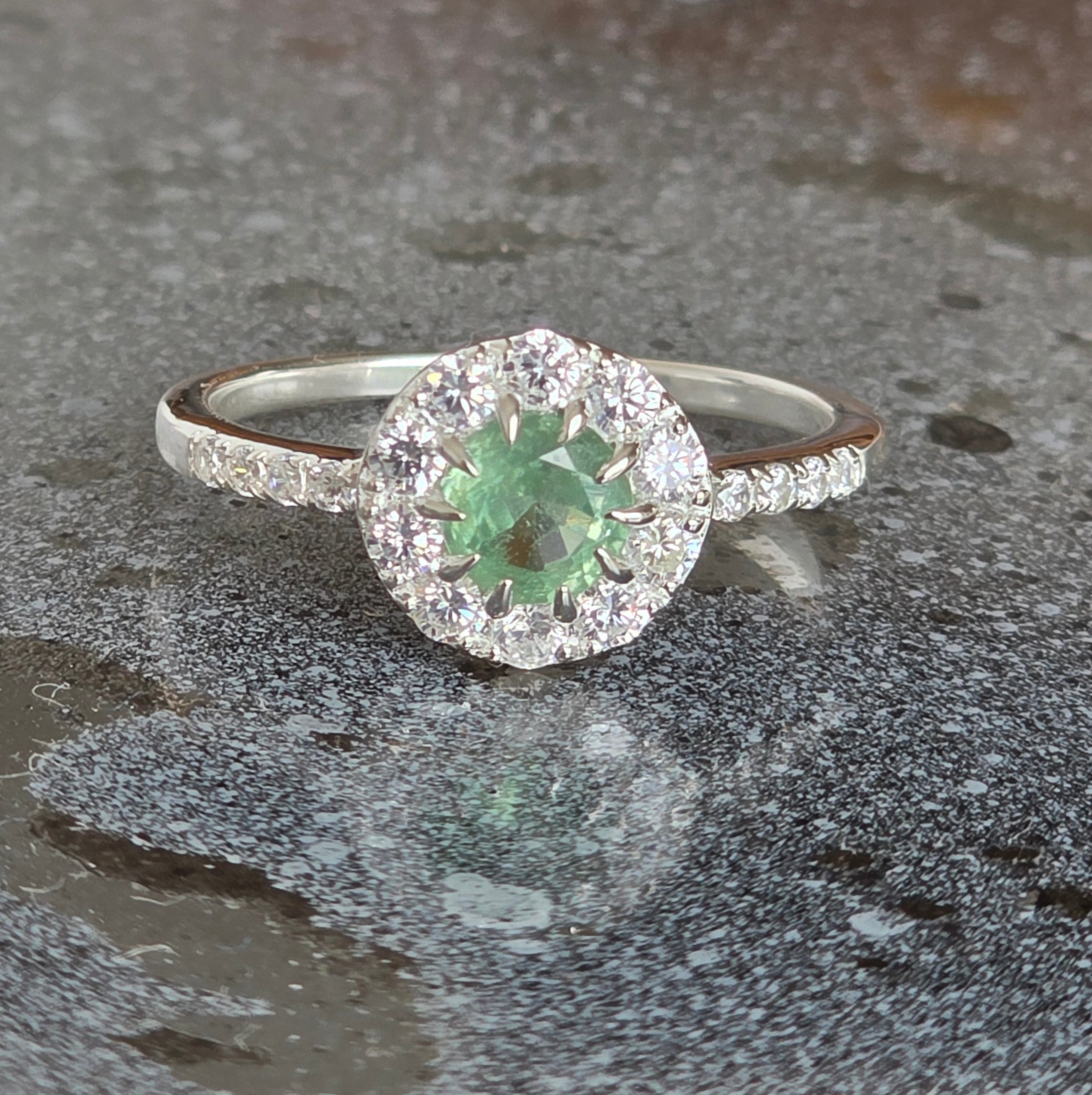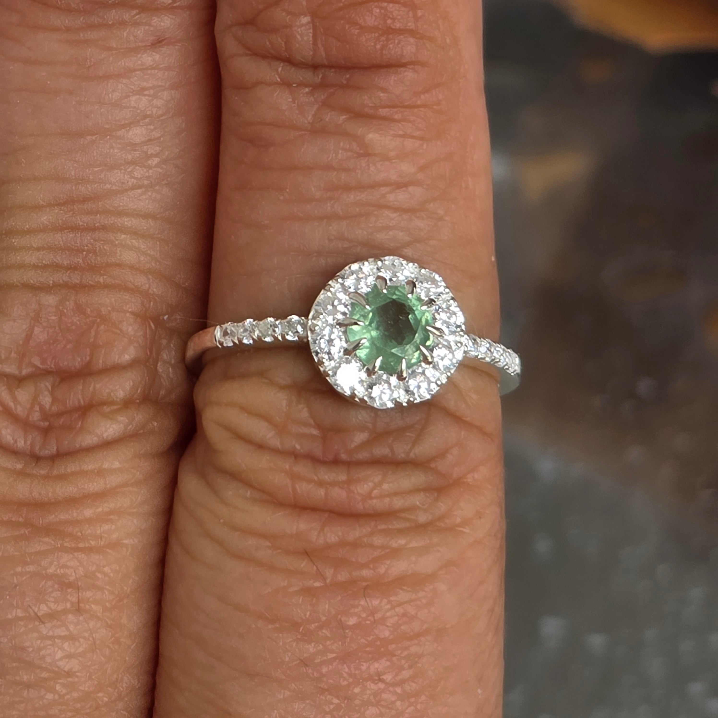Piatra centrală atrage privirea prin nuanța sa verde subtilă, în timp ce topazele albe adaugă luminozitate și pun în valoare fiecare detaliu al monturii. Brațul inelului, decorat discret, completează armonios întregul design.