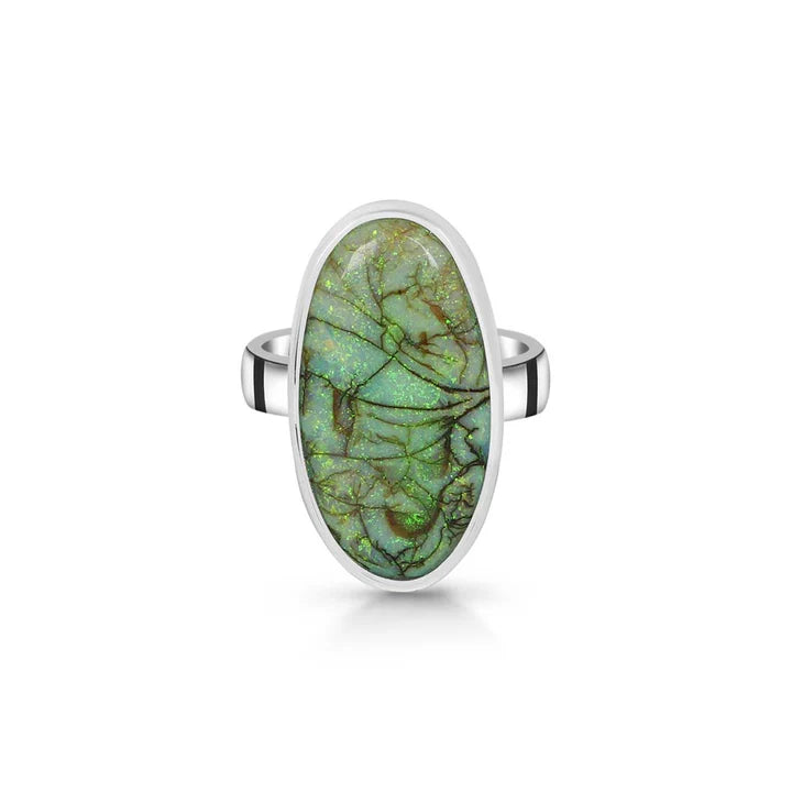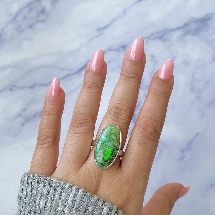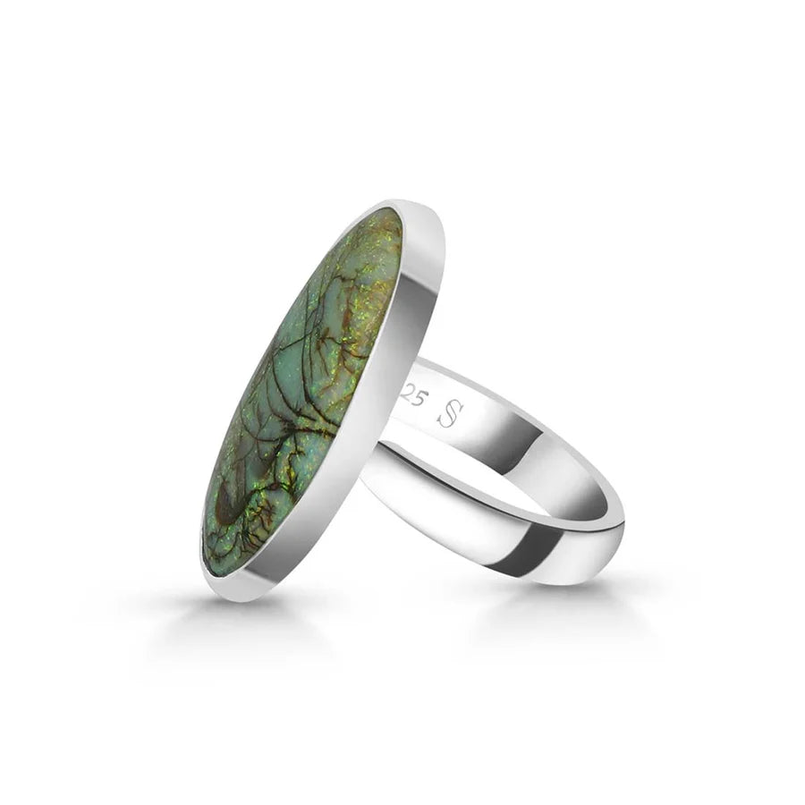 Un inel elegant și rafinat, realizat din argint 925, cu o piatră naturală de opal etiopian, cunoscută pentru reflexele sale irizante în nuanțe de verde, roșu și albastru. Designul minimalist permite pietrei să fie în centrul atenției, captând lumina din orice unghi.