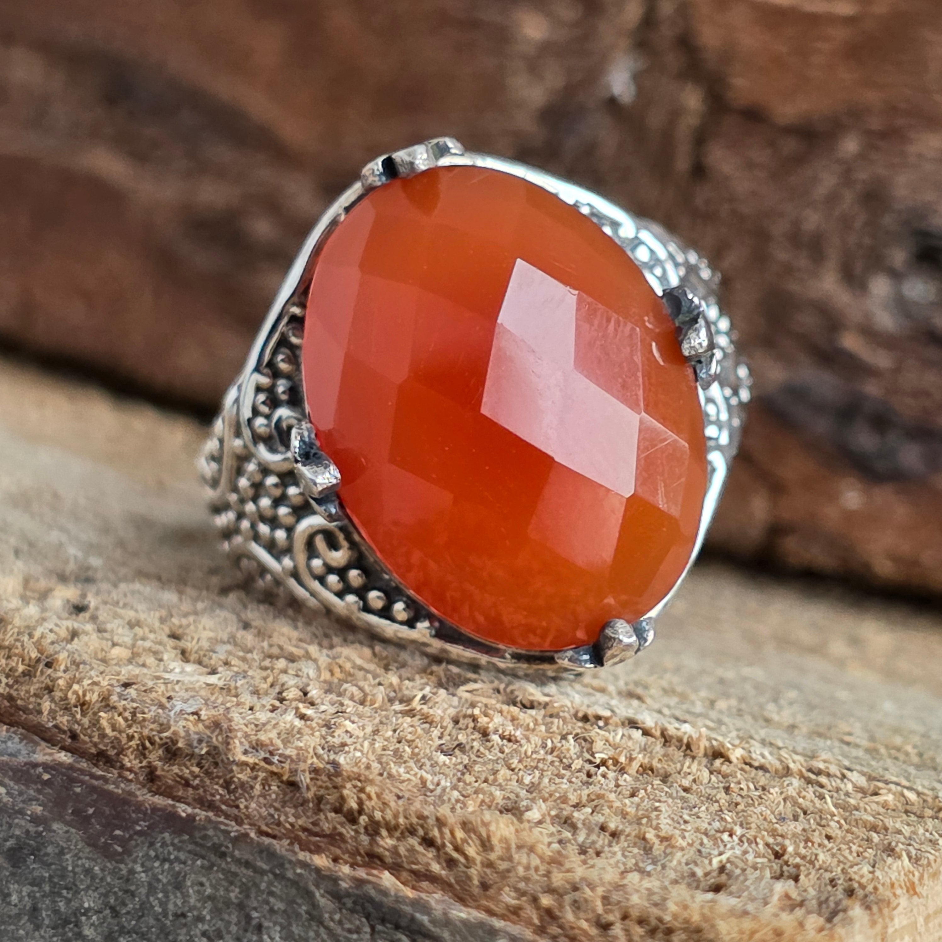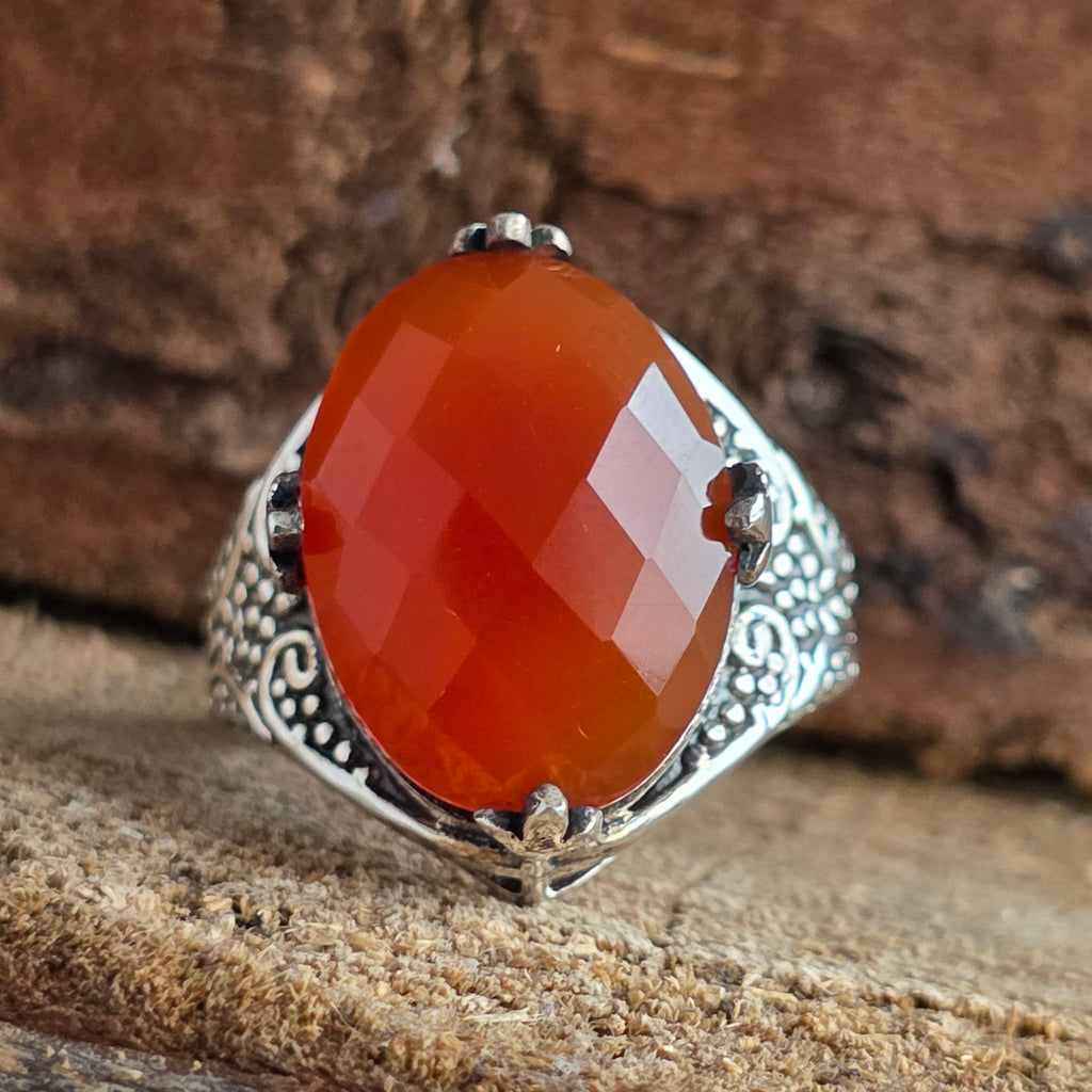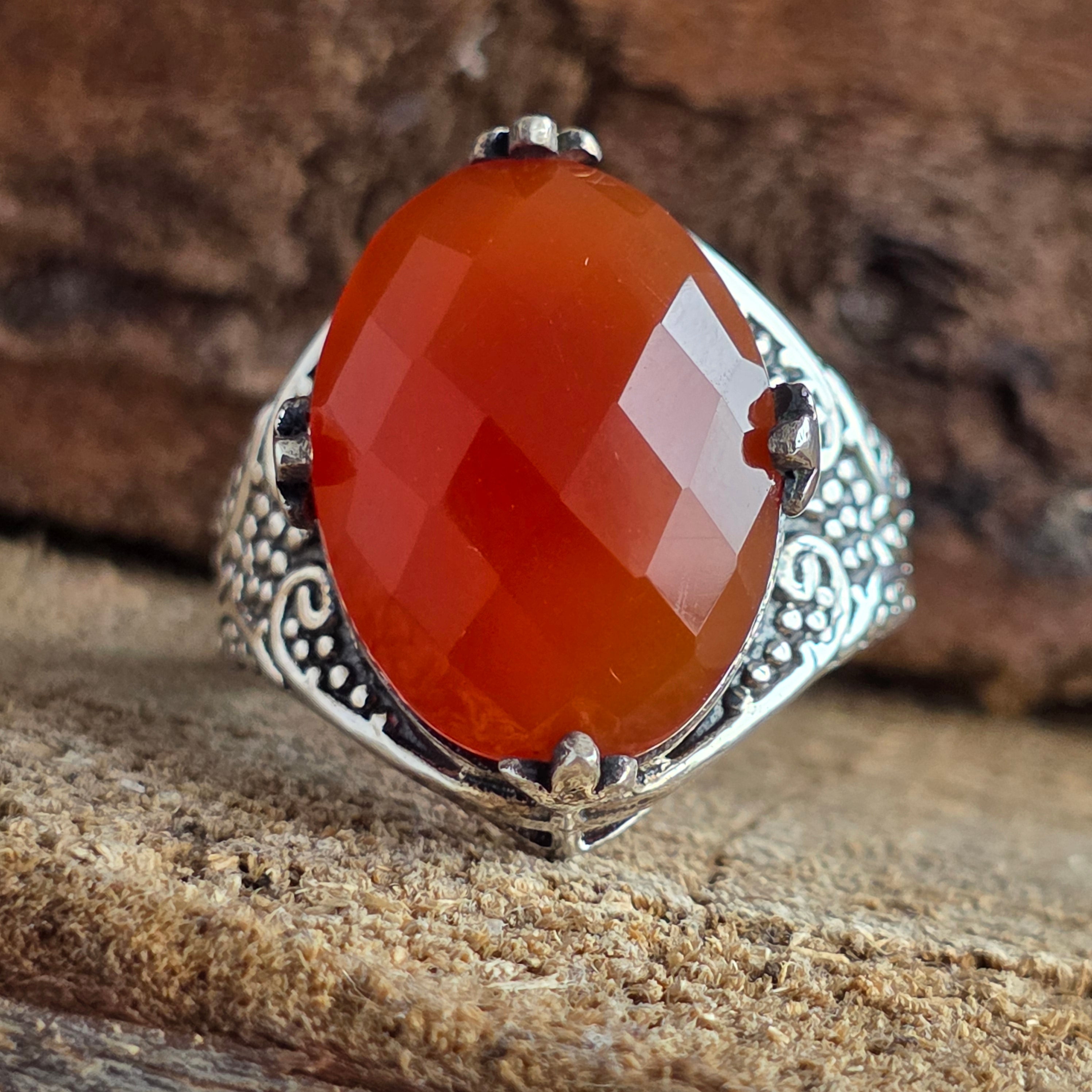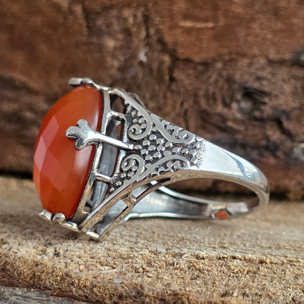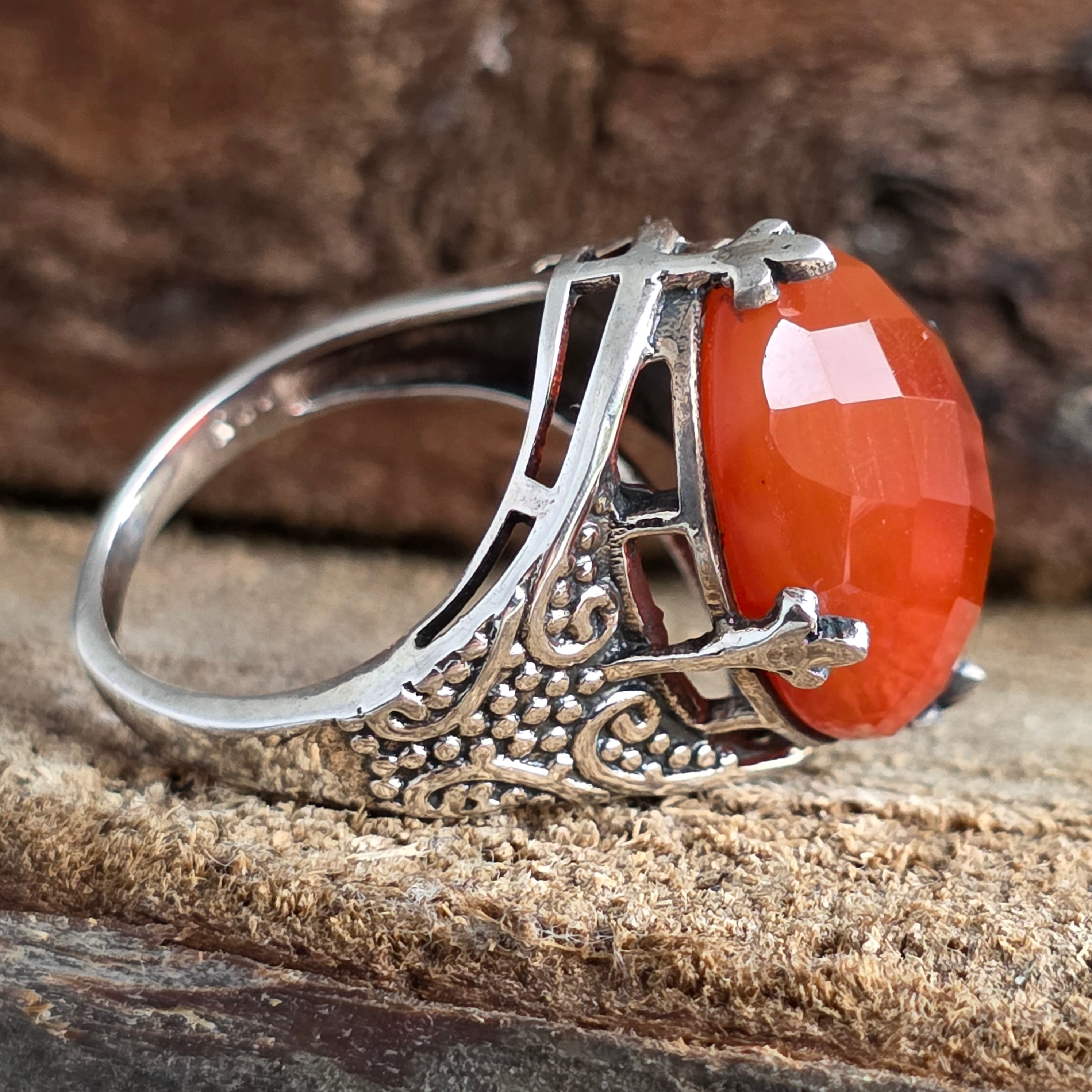 Puternic și vibrant, acest inel din argint 925 celebrează căldura pământului prin intensitatea carneolului natural, o piatră a curajului, vitalității și energiei solare.