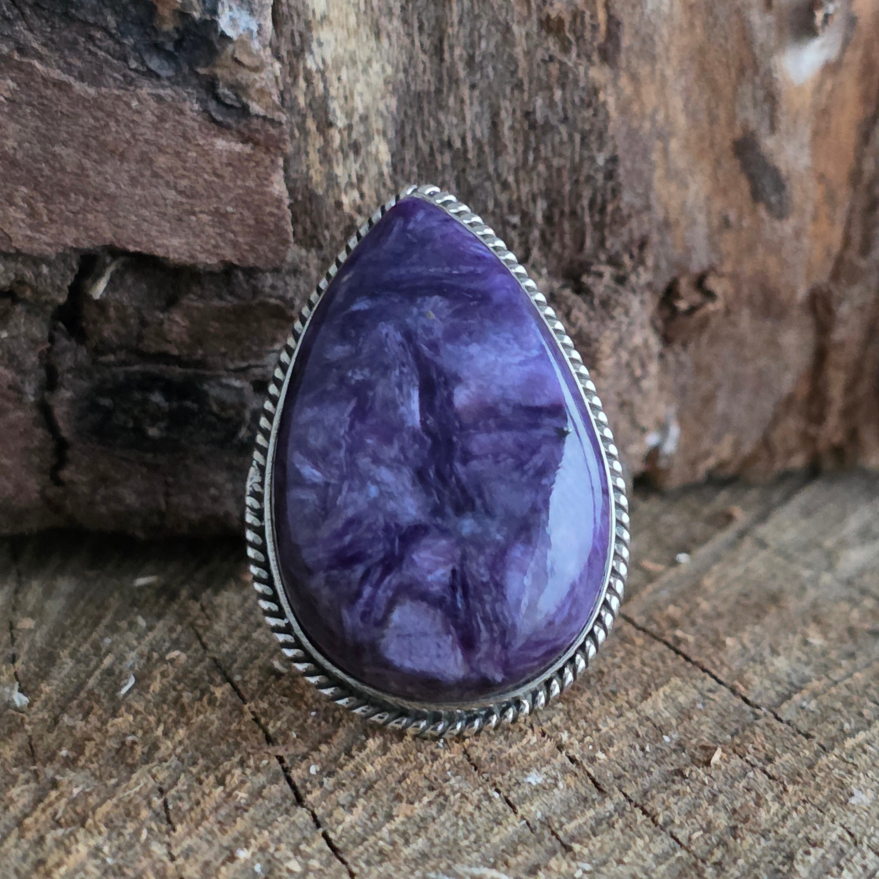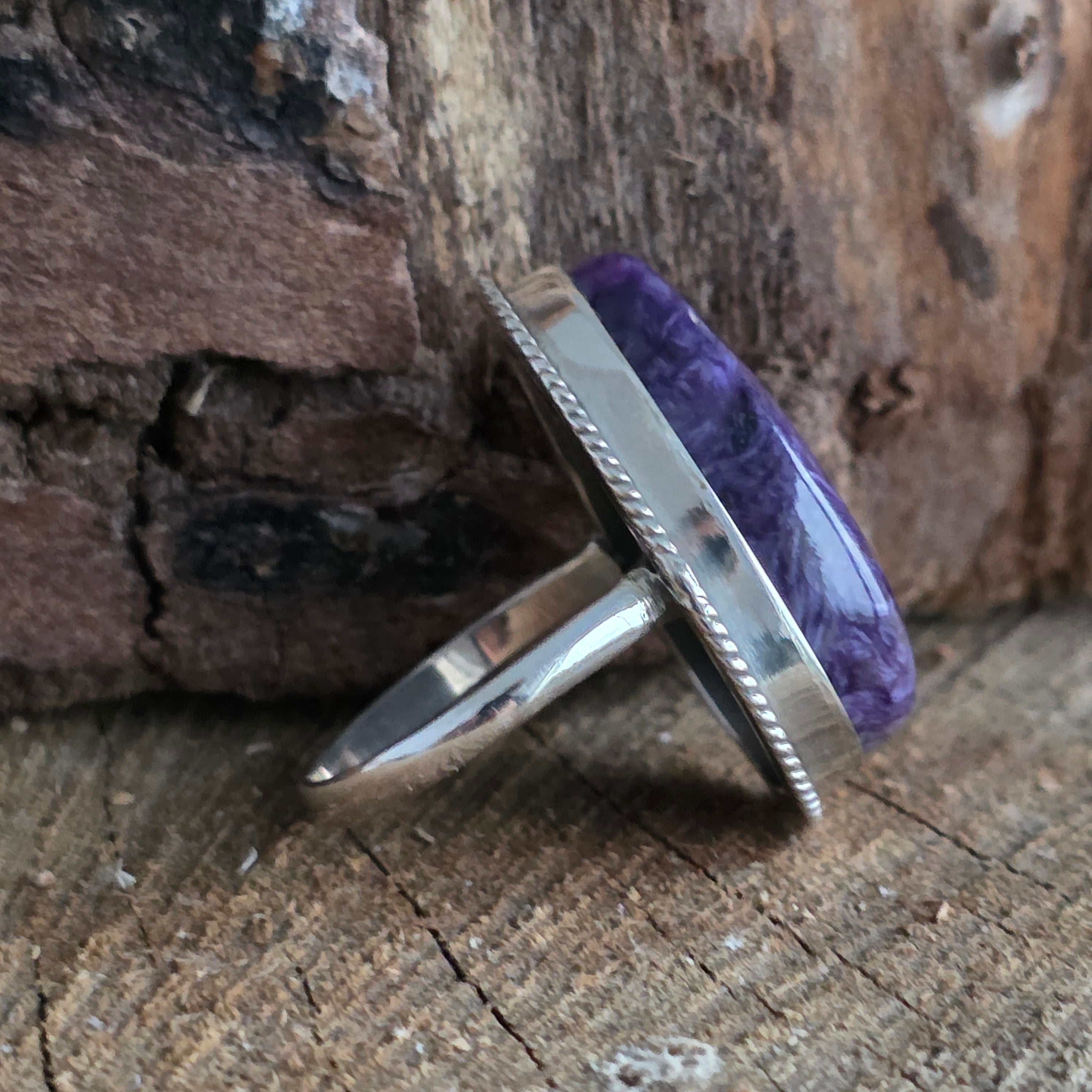 Un inel masiv, lucrat manual din argint 925, ce adăpostește o piatră naturală de Charoit, cu nuanțe vibrante de violet și reflexe mătăsoase ce amintesc de o pictură cosmică. Rama decorativă în stil twisted wire work adaugă profunzime și rafinament, echilibrând eleganța modernă cu măiestria tradițională.