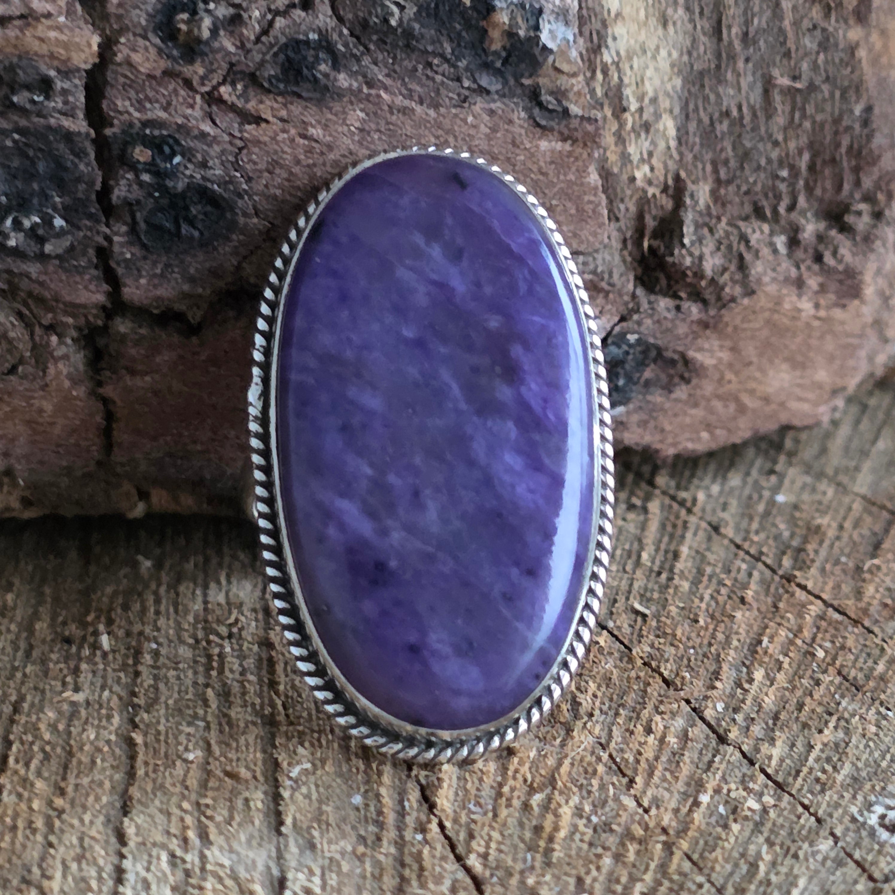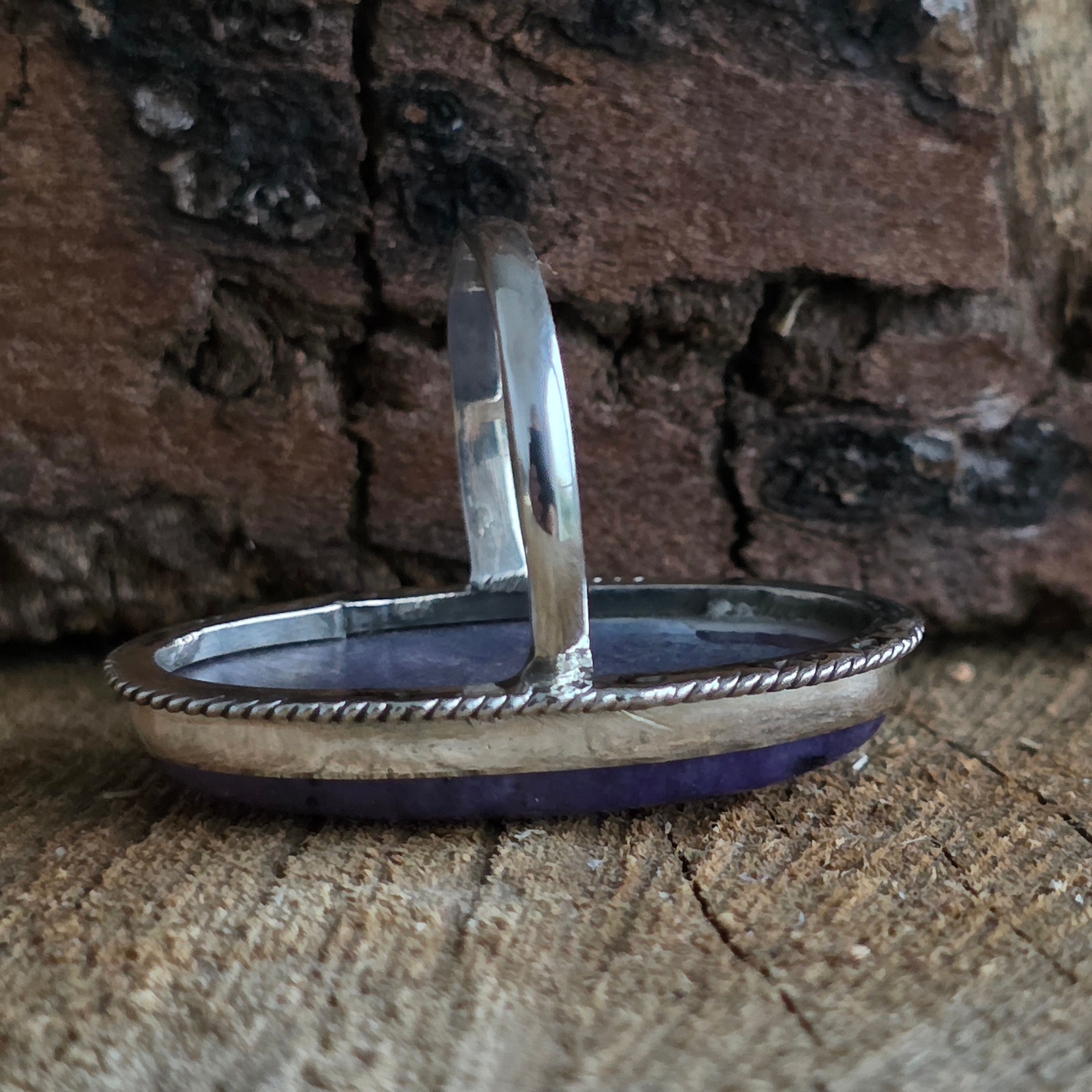 Un inel masiv, lucrat manual din argint 925, ce adăpostește o piatră naturală de Charoit, cu nuanțe vibrante de violet și reflexe mătăsoase ce amintesc de o pictură cosmică. Rama decorativă în stil twisted wire work adaugă profunzime și rafinament, echilibrând eleganța modernă cu măiestria tradițională.