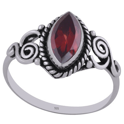 Un inel ce poartă amprenta timpului – lucrat manual din argint 925, cu detalii în fir răsucit și spirale fine ce încadrează intensitatea granatului natural.