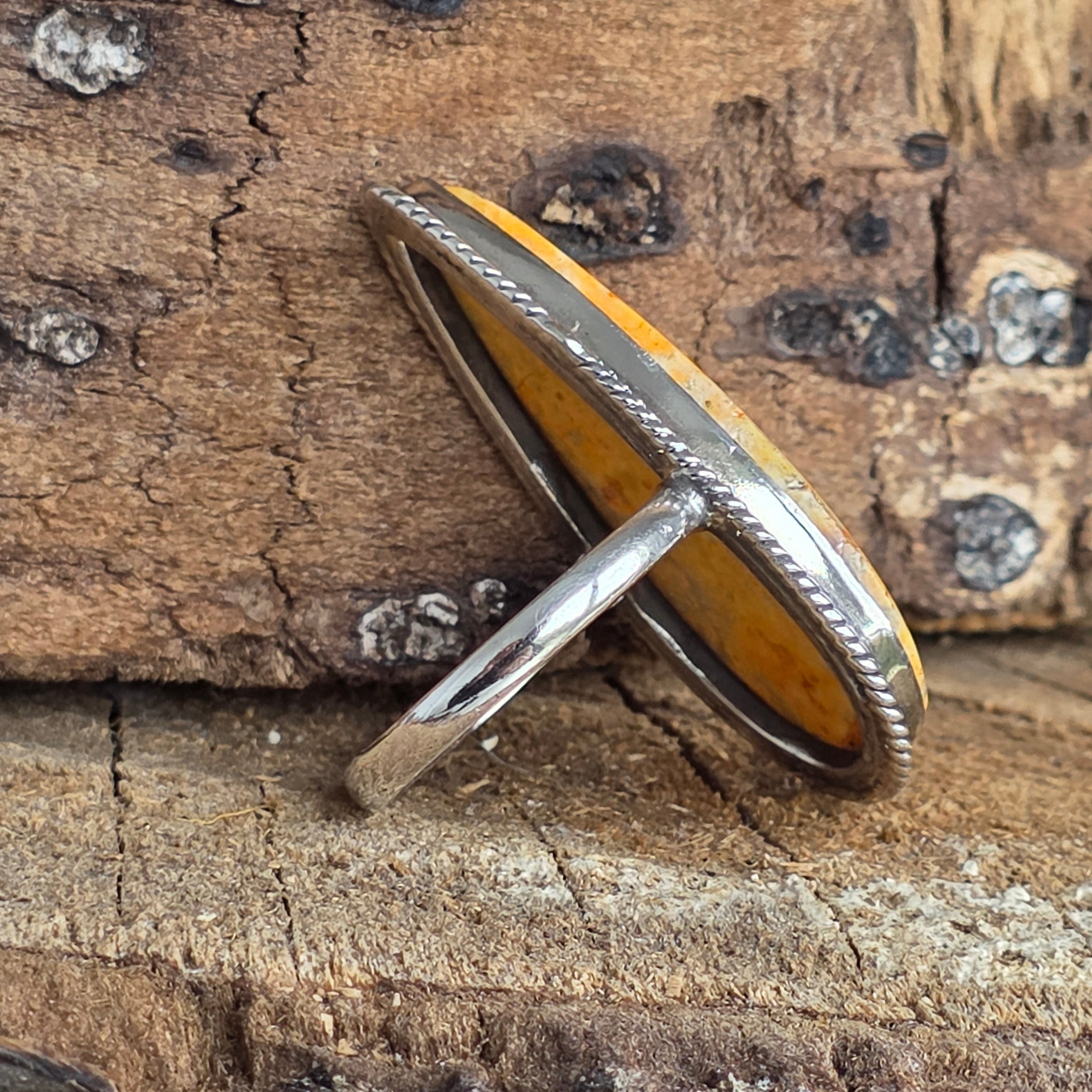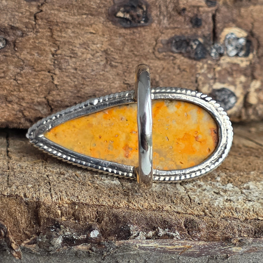 Un inel spectaculos, realizat din argint 925, cu o piatră impresionantă de Bumblebee Jasper, cunoscută pentru amestecul vibrant de tonuri galbene, portocalii și gri-aurii. Modelul wire work lucrat manual încadrează piatra cu finețe, accentuându-i nuanțele calde și textura naturală.