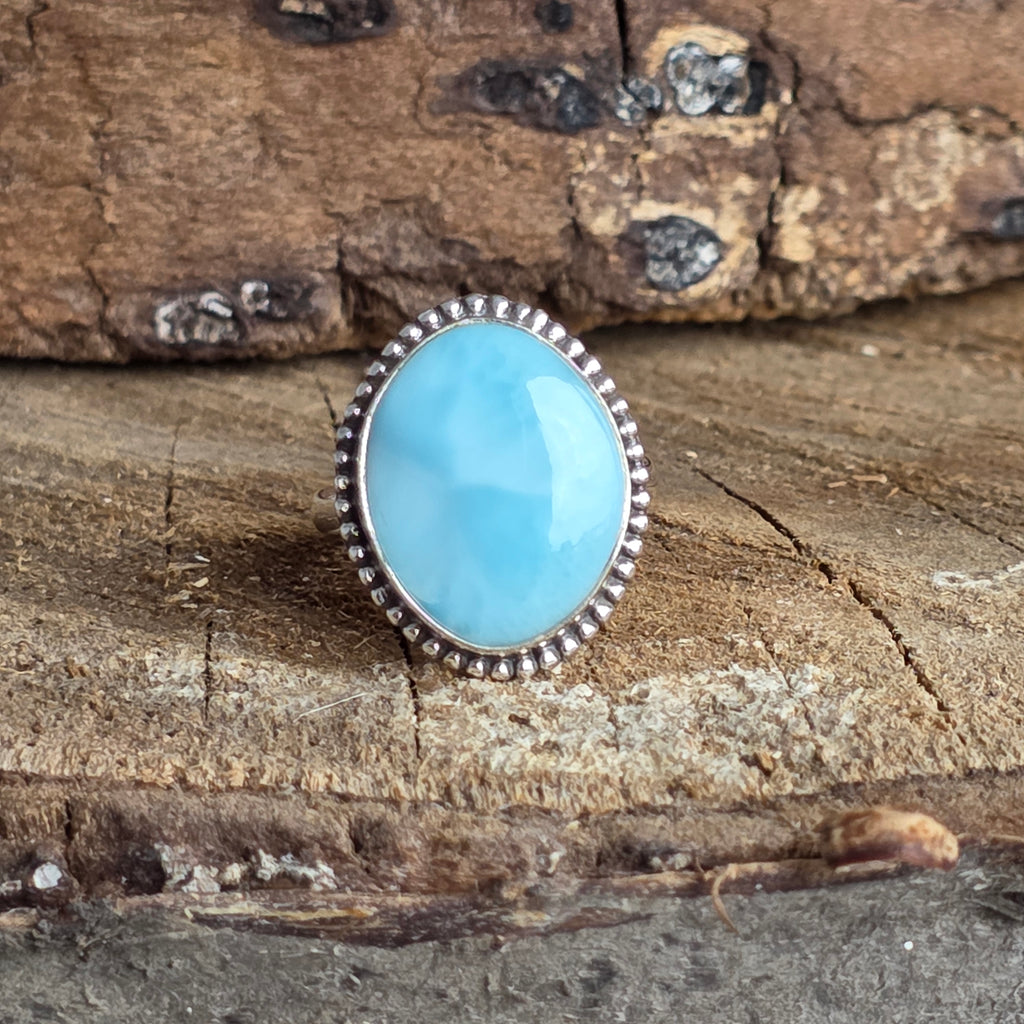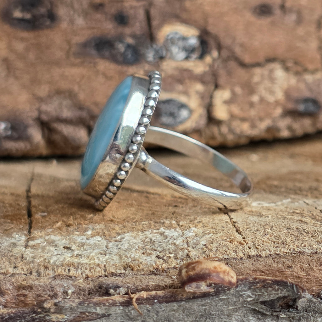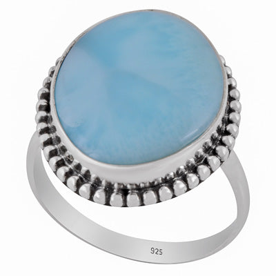 Un inel elegant din argint 925 cu larimar natural, în tonuri de albastru marin ce evocă apele Caraibelor. Detaliile rawa work lucrate manual adaugă profunzime și rafinament acestei bijuterii autentice.
