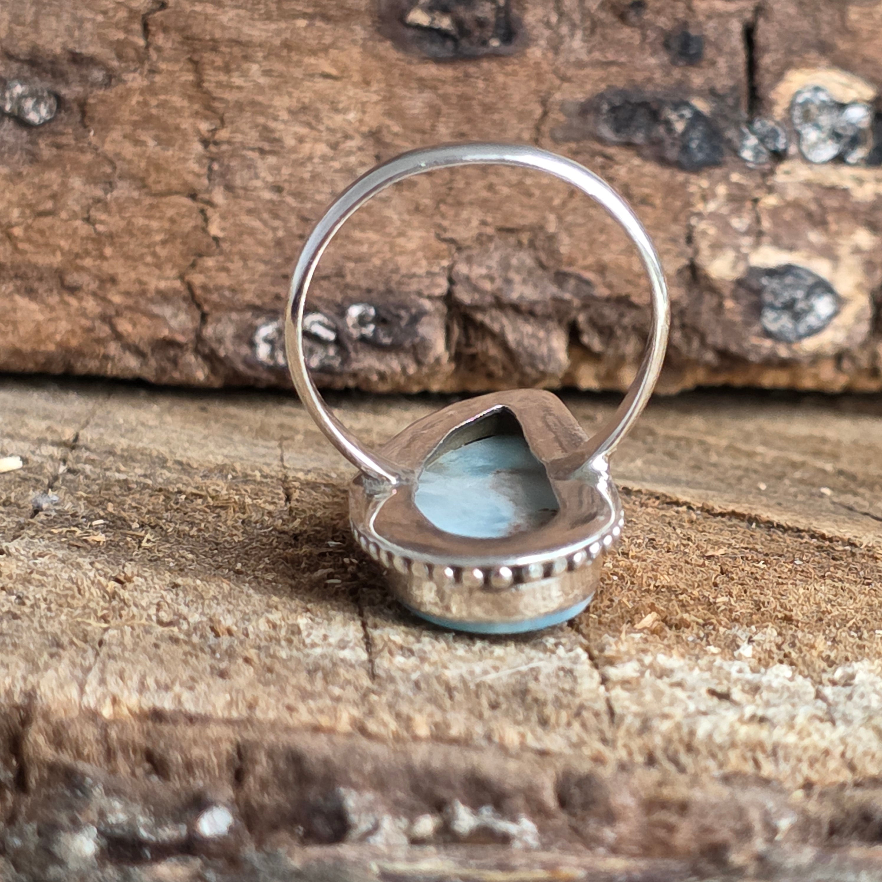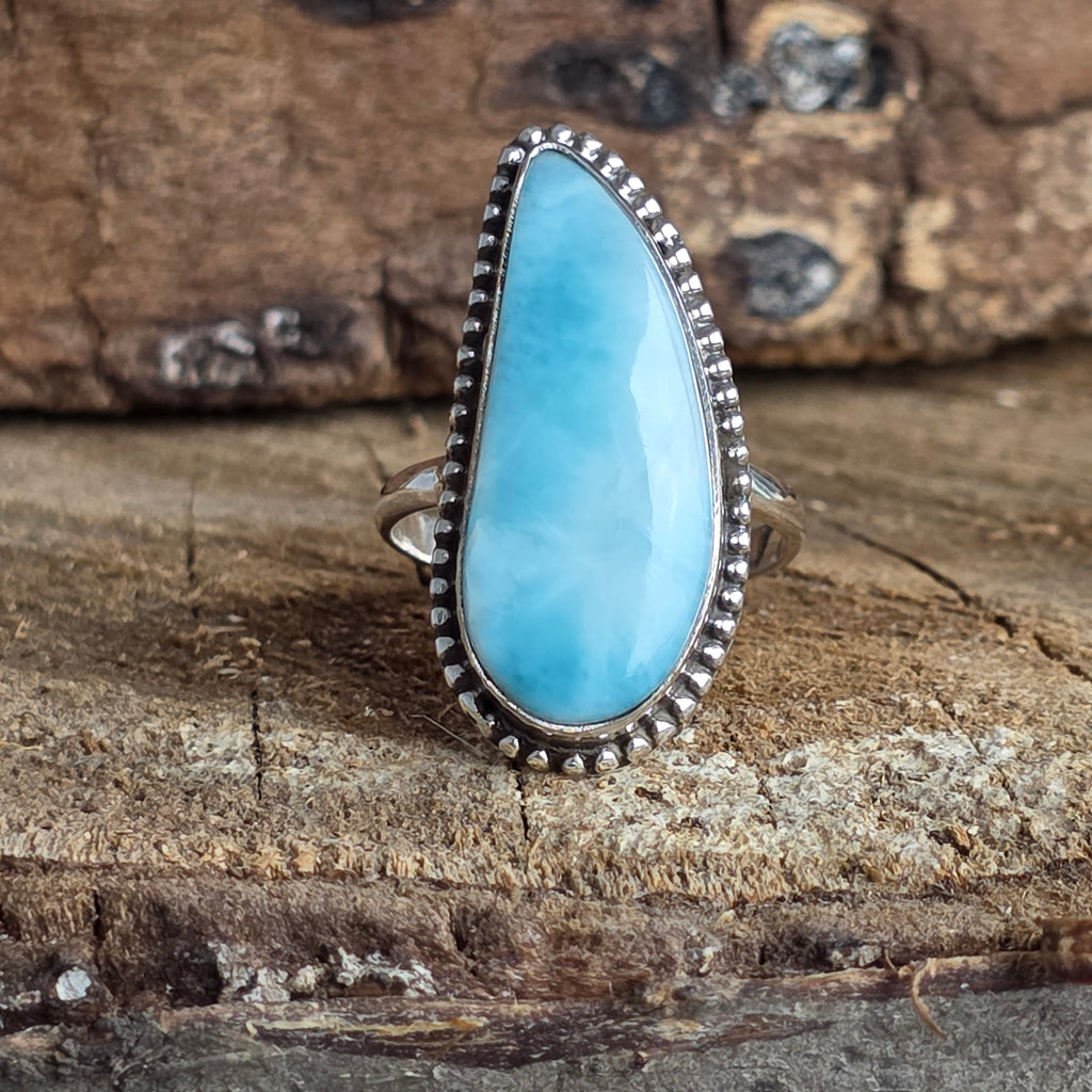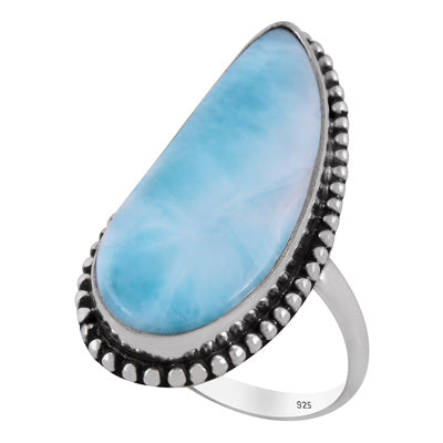 Un inel spectaculos din argint 925, cu larimar natural într-o tăietură alungită ce pune în valoare nuanțele sale de albastru-turcoaz. Designul rawa work, lucrat manual, adaugă profunzime și textură, transformând fiecare reflex într-o invitație la calm și claritate.
