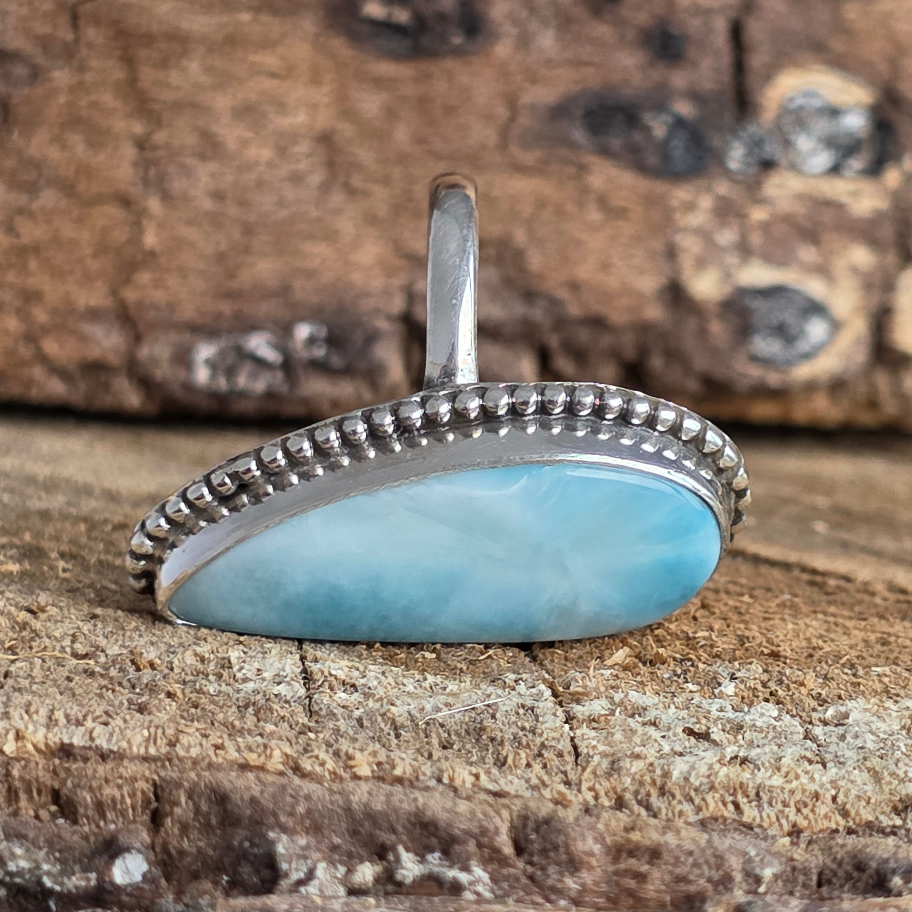 • Piatra: larimar natural, tăietură alungită (marquise/elongated shape)