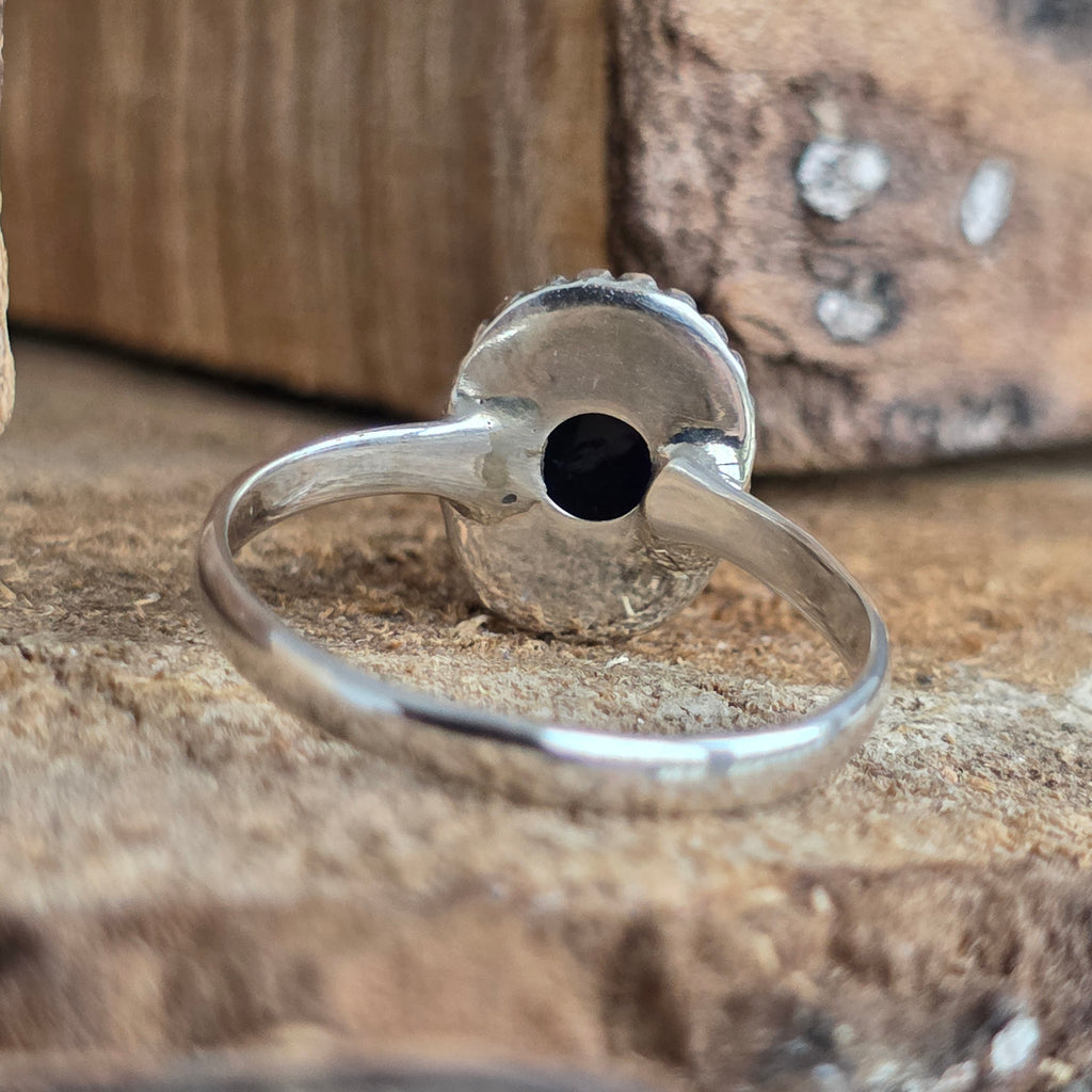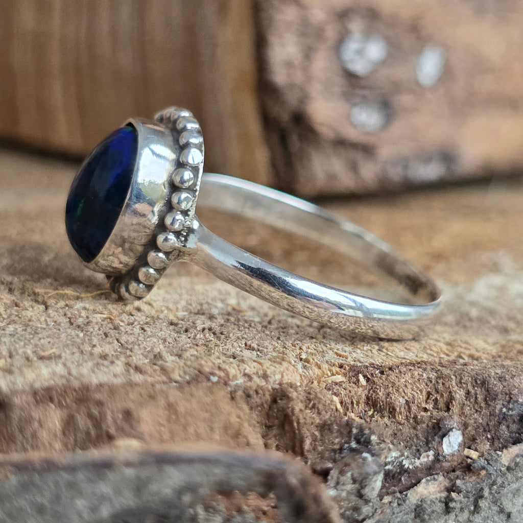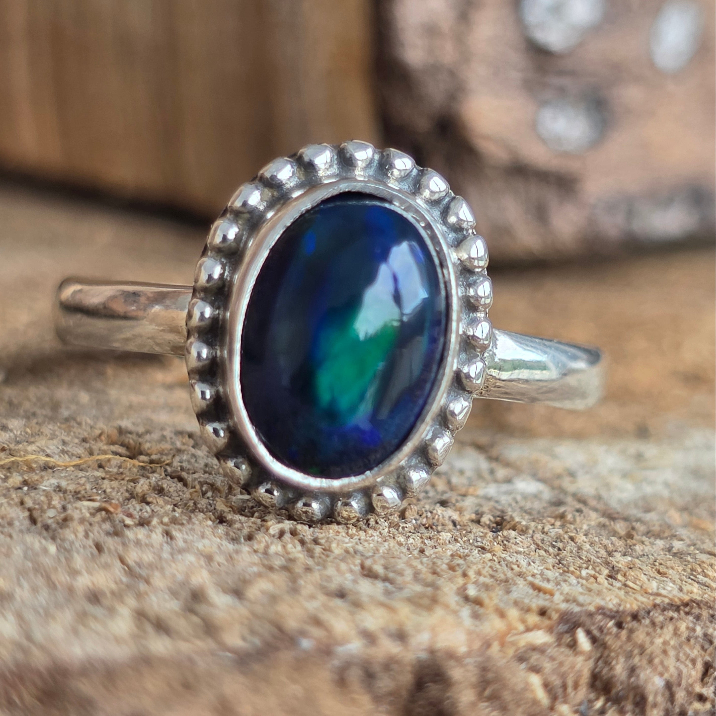 Un inel elegant și rafinat, realizat din argint 925, cu o piatră naturală de opal etiopian, cunoscută pentru reflexele sale irizante în nuanțe de verde, roșu și albastru. Designul minimalist plain wire setting permite pietrei să fie în centrul atenției, captând lumina din orice unghi.