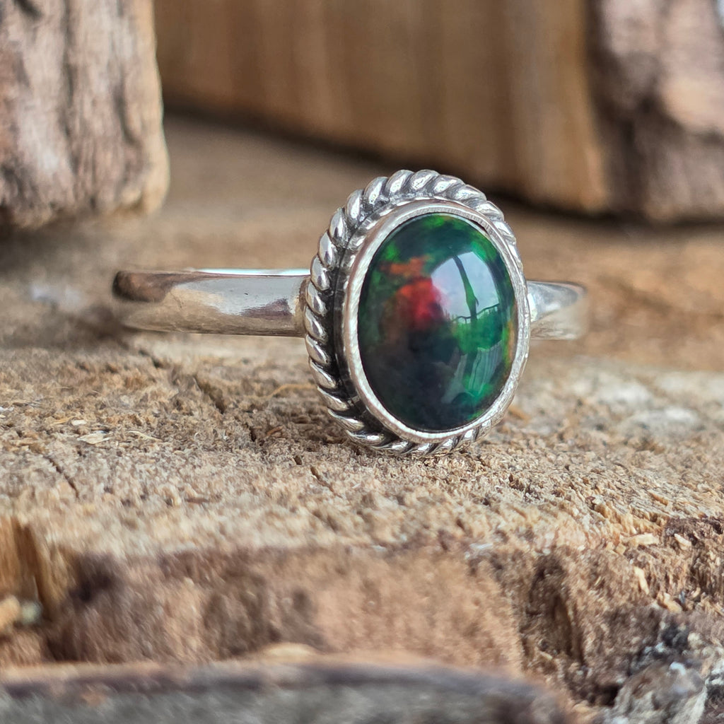 Un inel elegant și rafinat, realizat din argint 925, cu o piatră naturală de opal etiopian, cunoscută pentru reflexele sale irizante în nuanțe de verde, roșu și albastru. Designul minimalist plain wire setting permite pietrei să fie în centrul atenției, captând lumina din orice unghi.