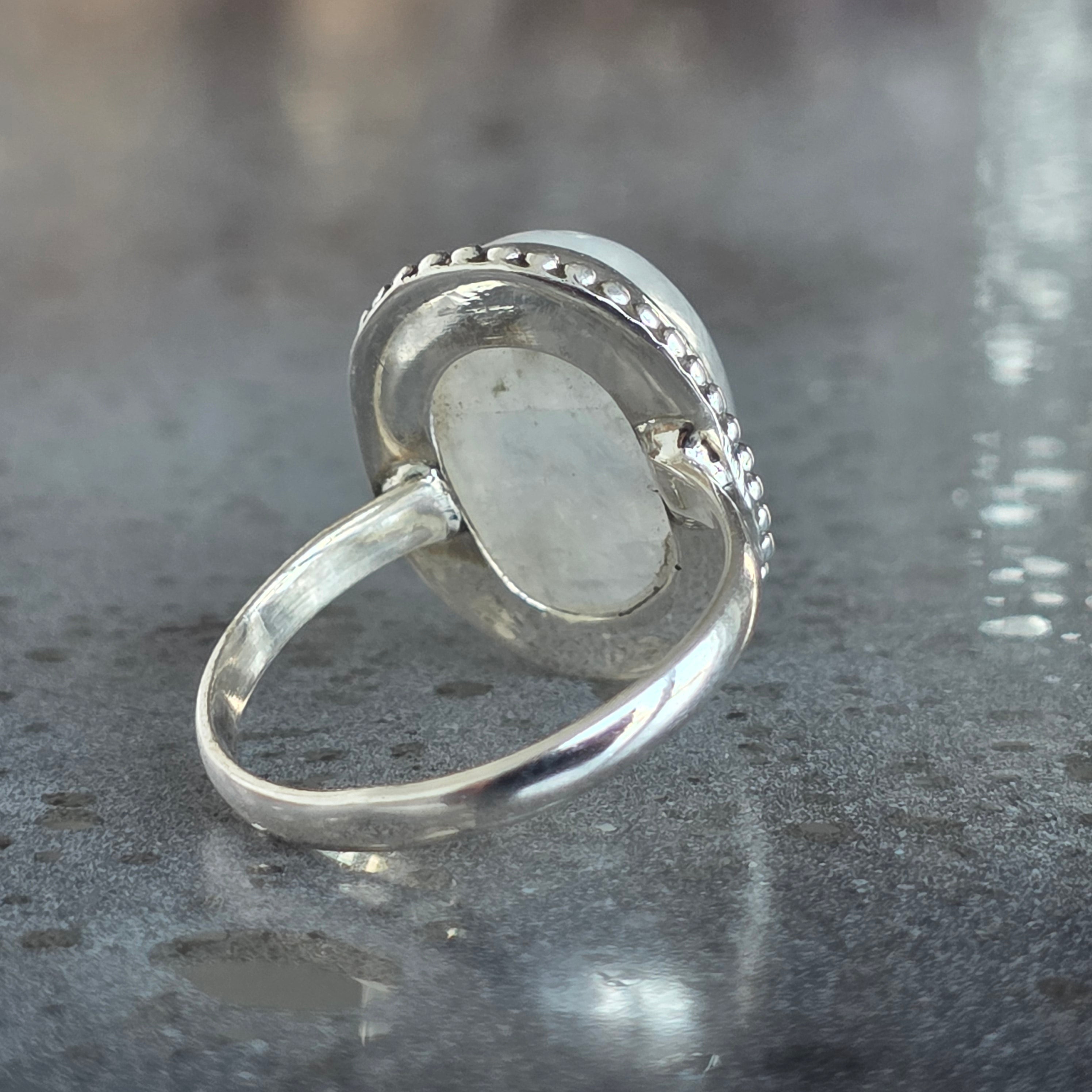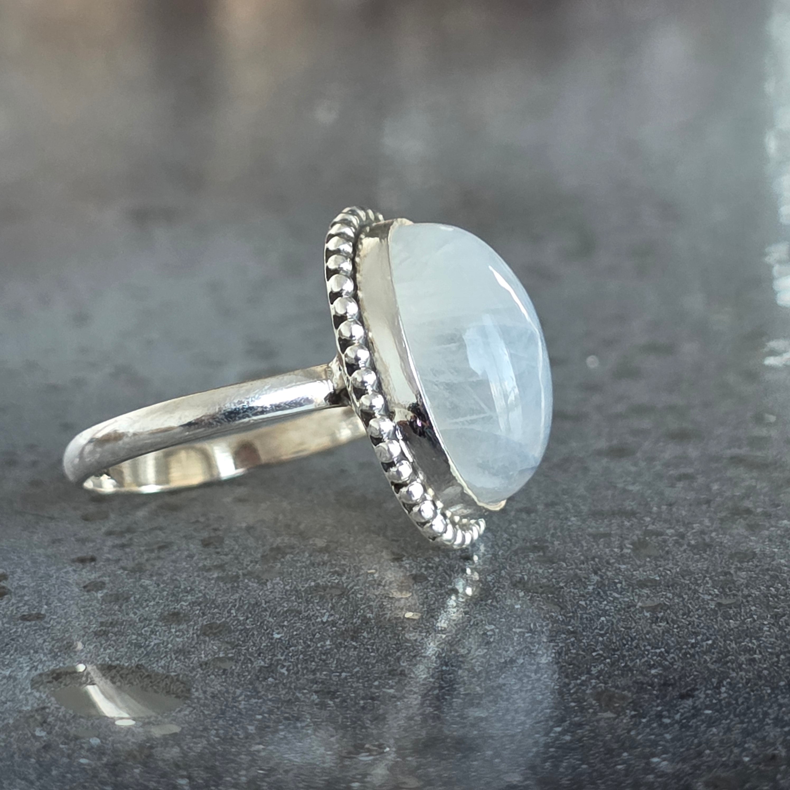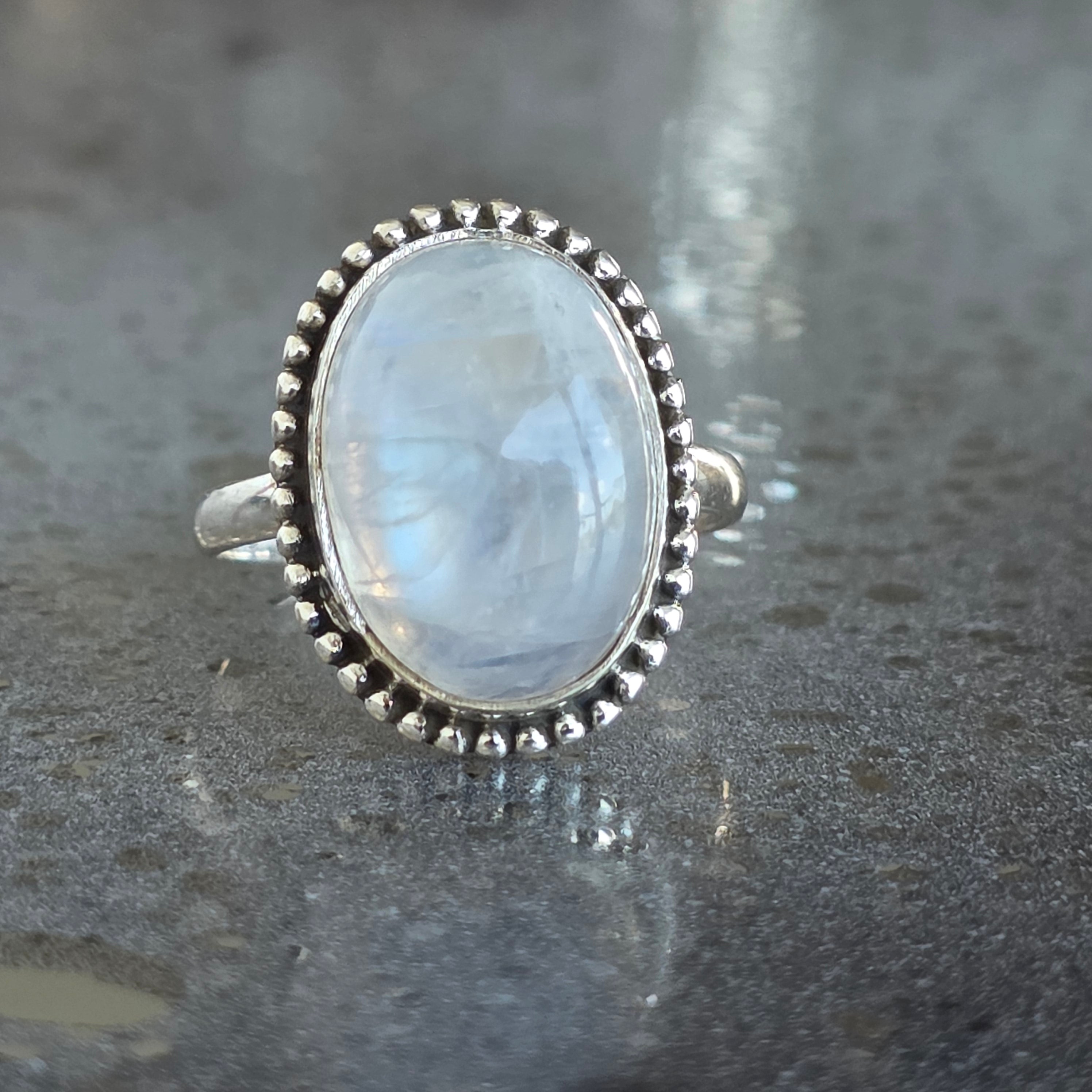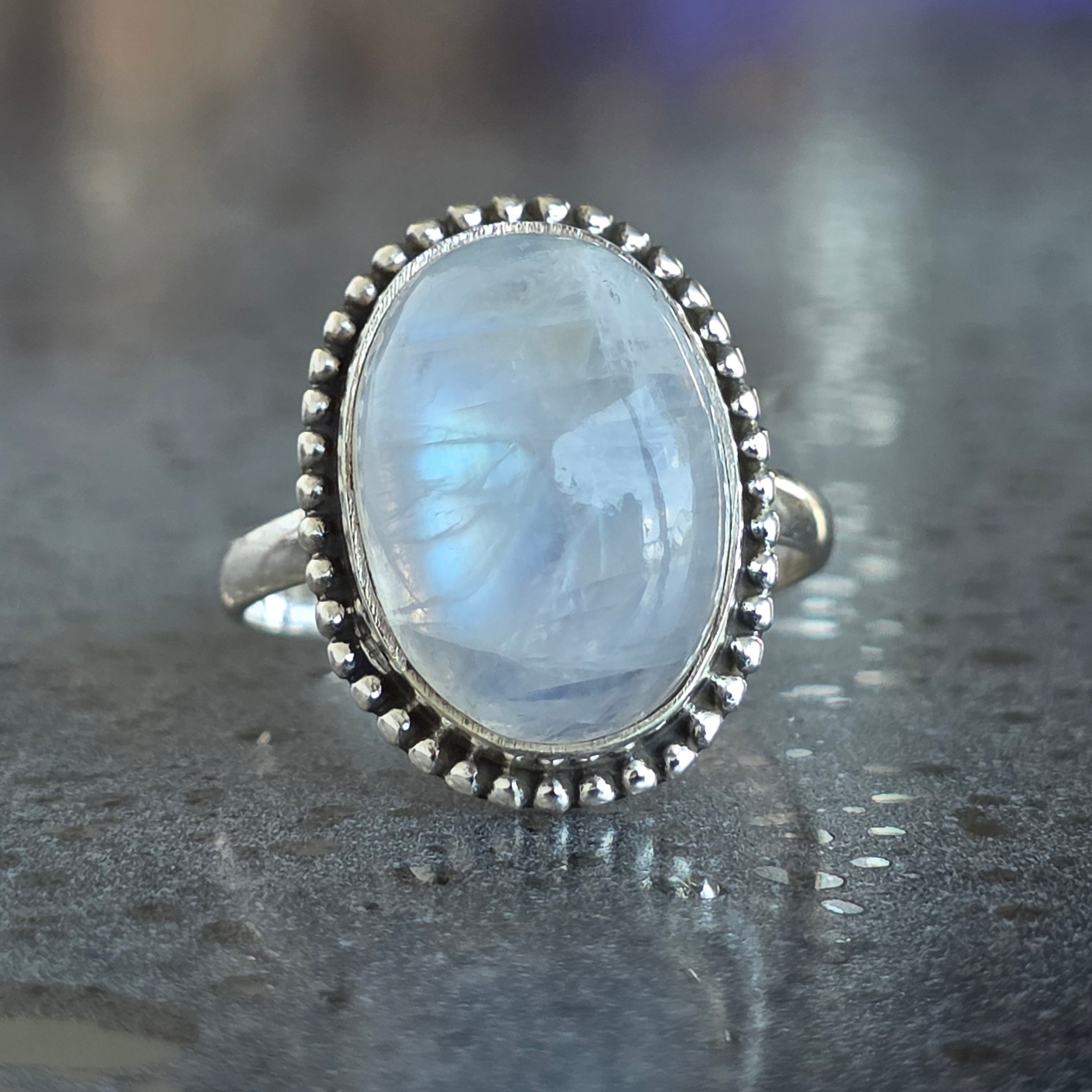 Un inel superb din argint 925, cu piatră lunii curcubeu naturală, recunoscută pentru reflexele sale albastre și perlate care dansează la fiecare mișcare. Designul rawa work, lucrat manual, accentuează eleganța pietrei și adaugă un aer sofisticat și boem în același timp.