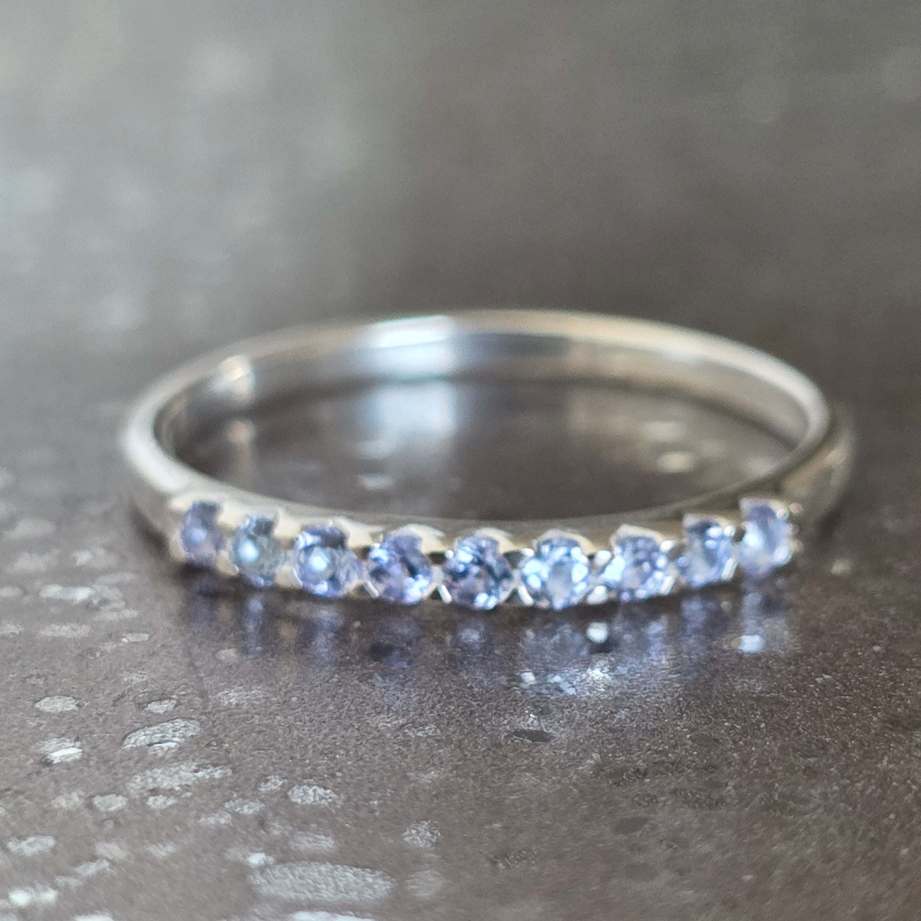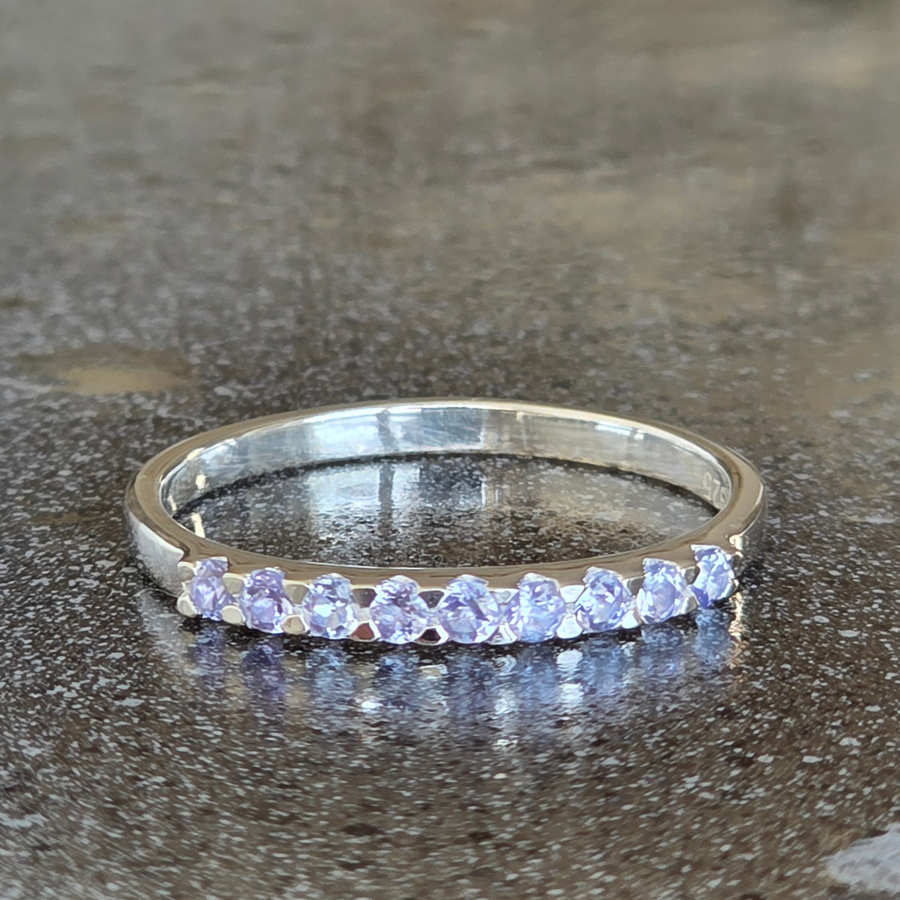 Alternanța dintre tanzanitul în nuanțe de albastru-violet și topazul alb aduce un contrast subtil, dar sofisticat. Rezultatul este un design modern, minimalist, dar plin de rafinament – ideal pentru purtare zilnică sau pentru a completa alte inele în combinații elegante.