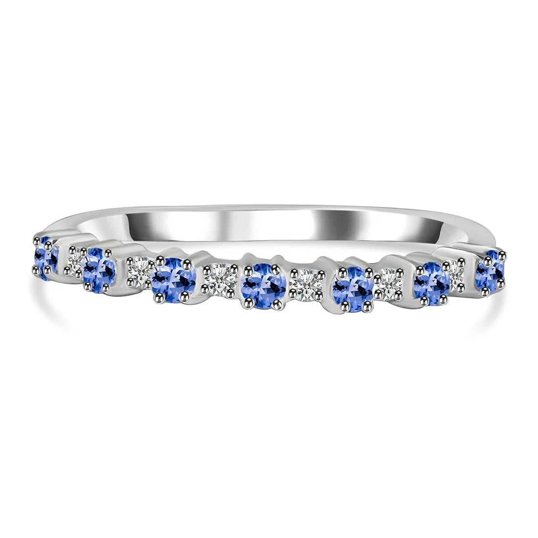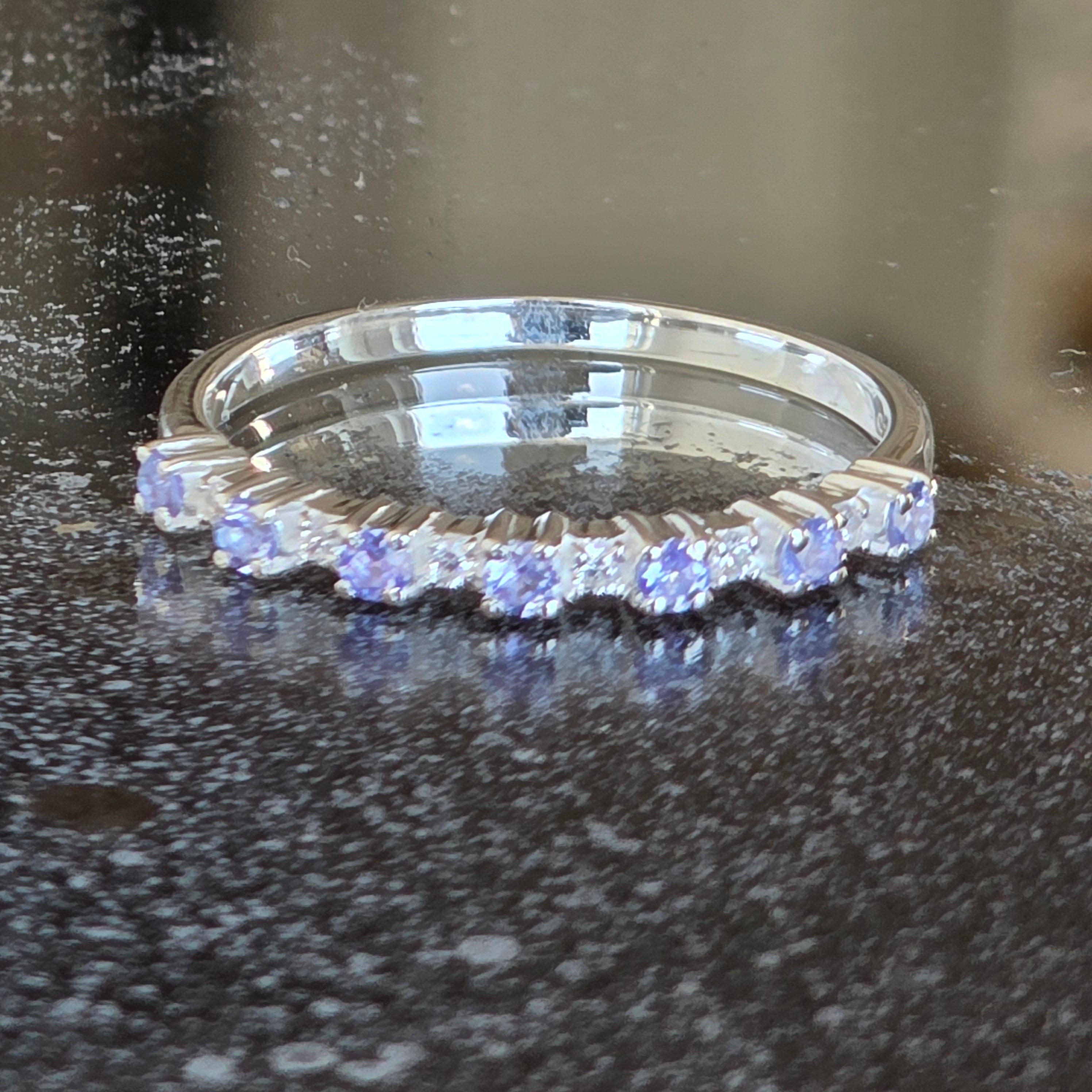 Alternanța dintre tanzanitul în nuanțe de albastru-violet și topazul alb aduce un contrast subtil, dar sofisticat. Rezultatul este un design modern, minimalist, dar plin de rafinament – ideal pentru purtare zilnică sau pentru a completa alte inele în combinații elegante.