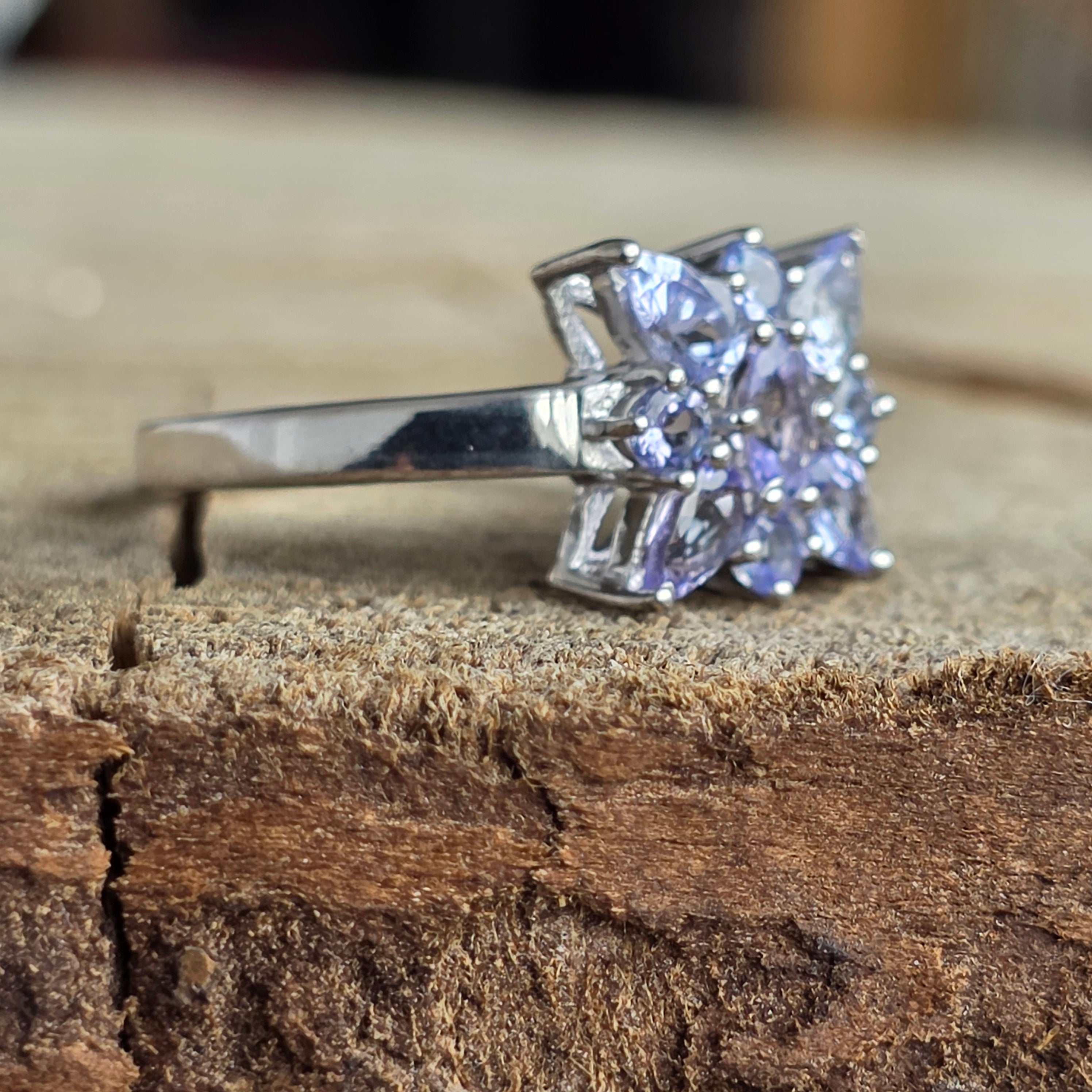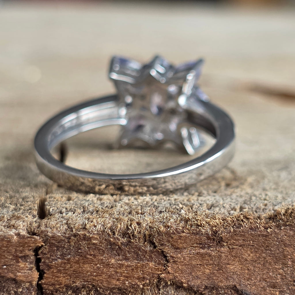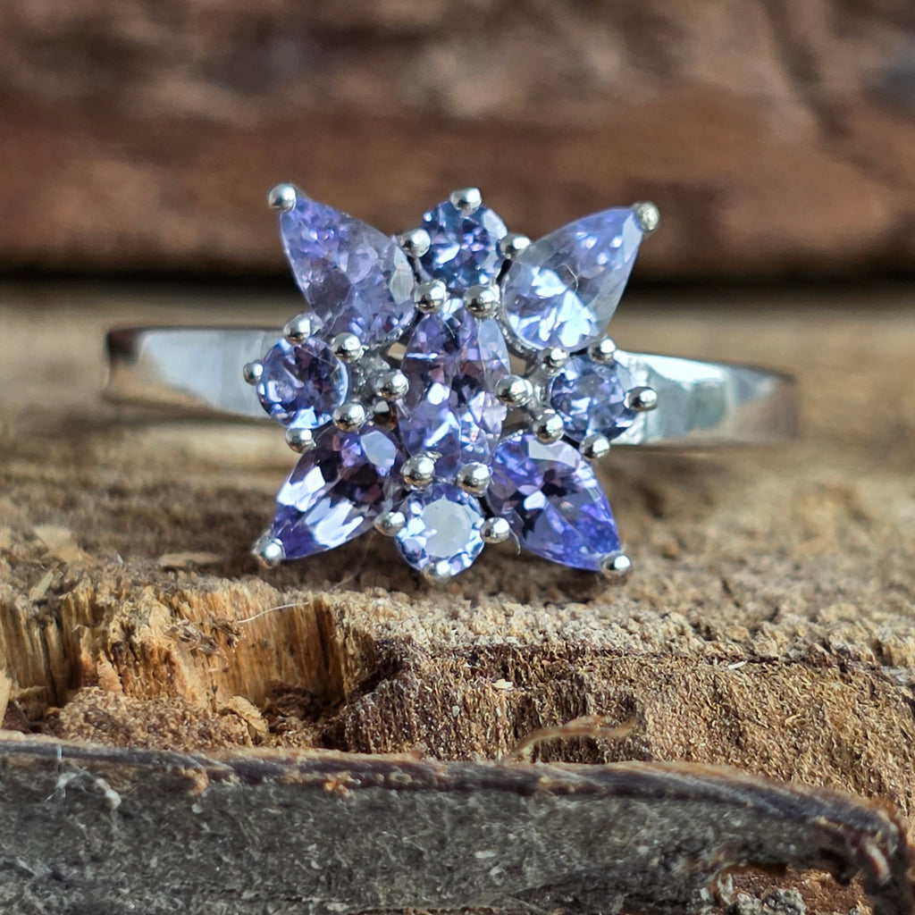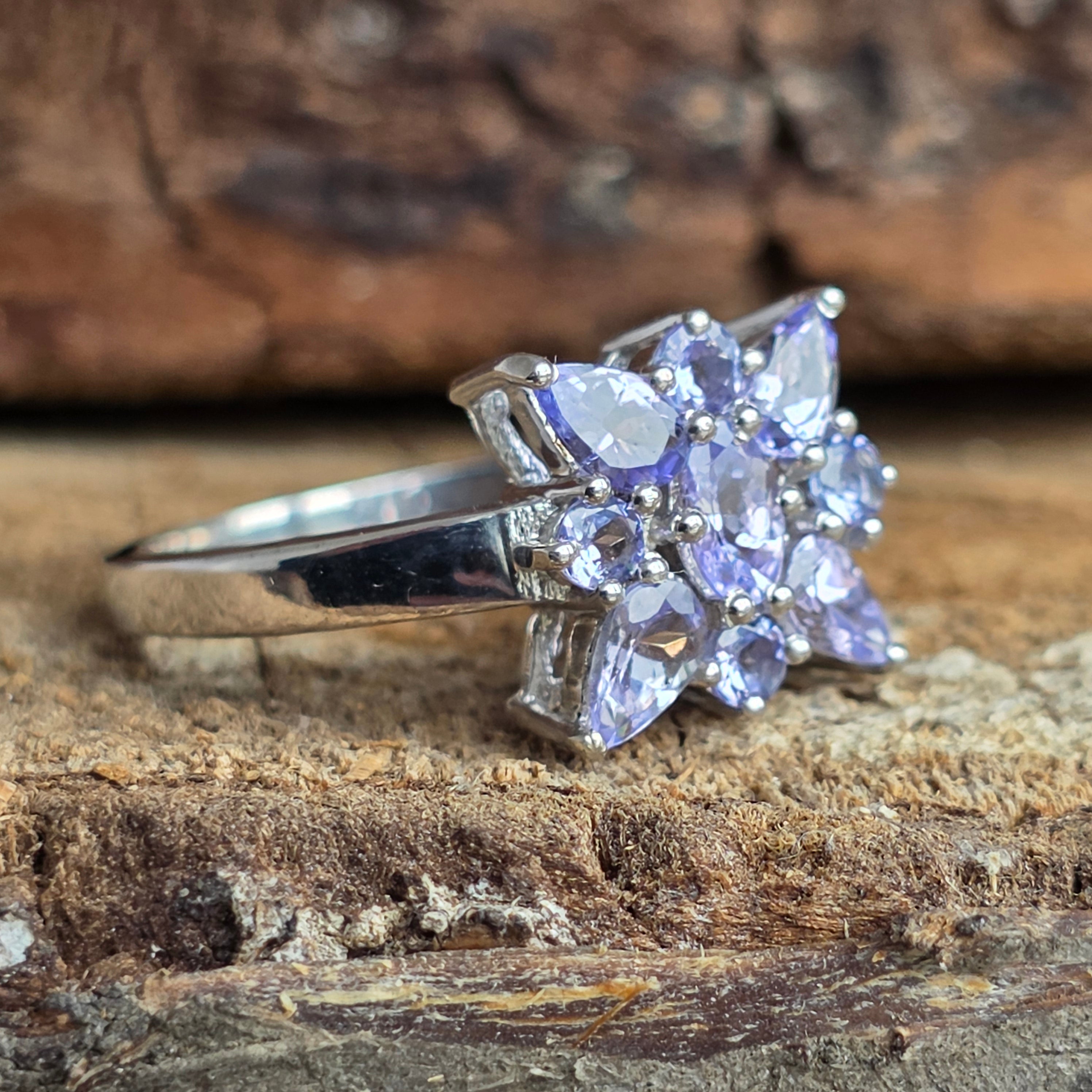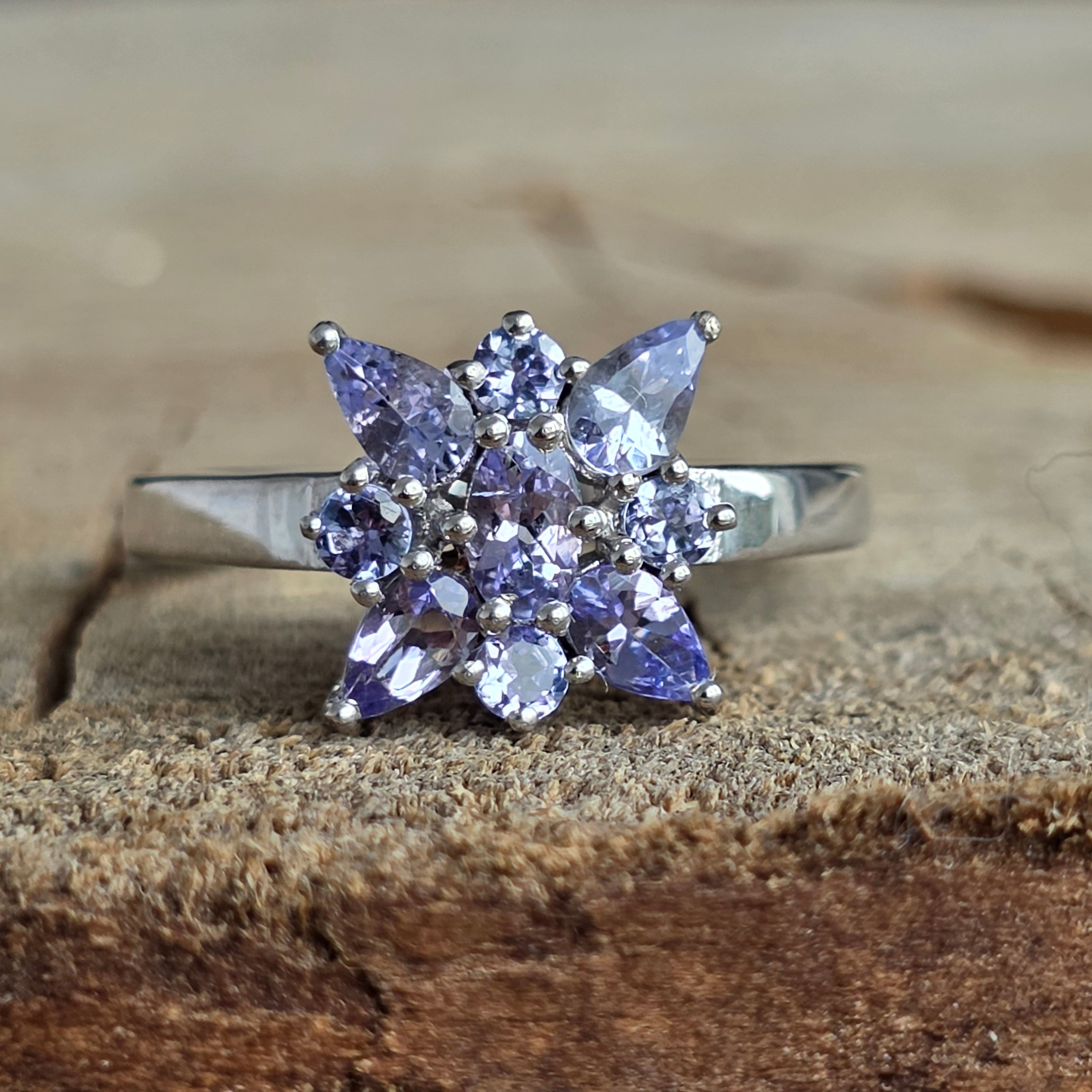 Un inel care pare născut din lumină — acest design floral din argint 925 placat cu rodiu este împodobit cu tanzanit natural, piatra intuiției și a transformării spirituale.