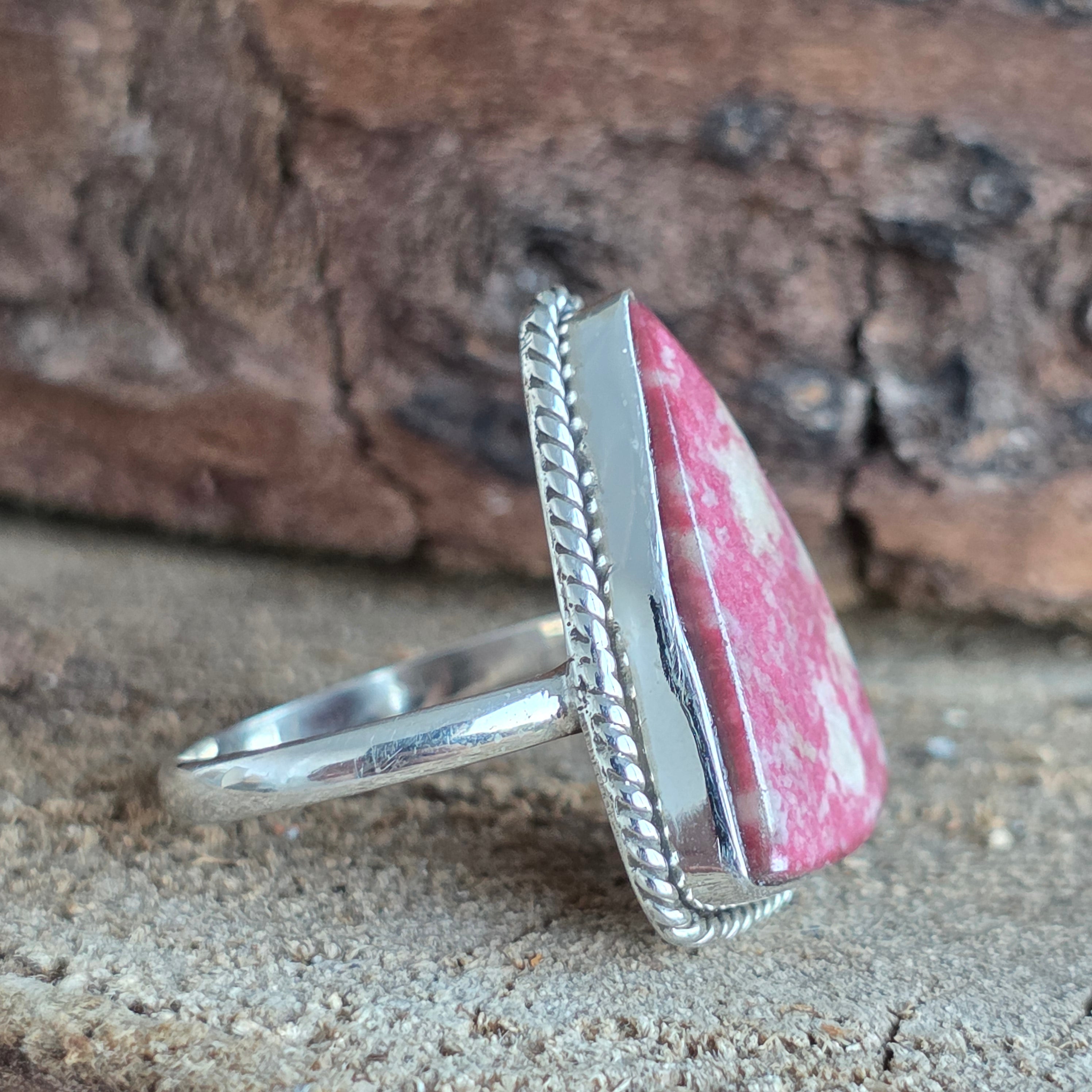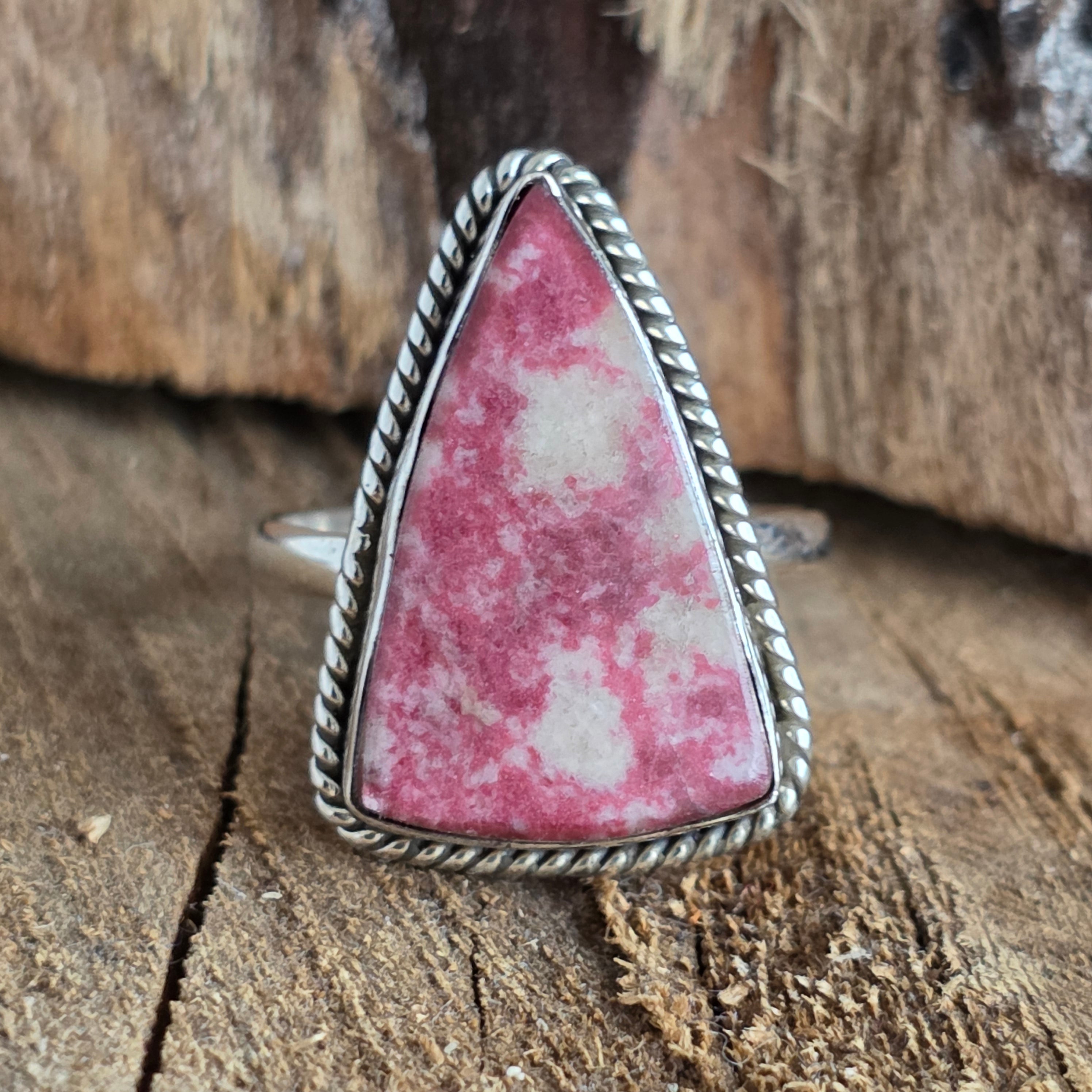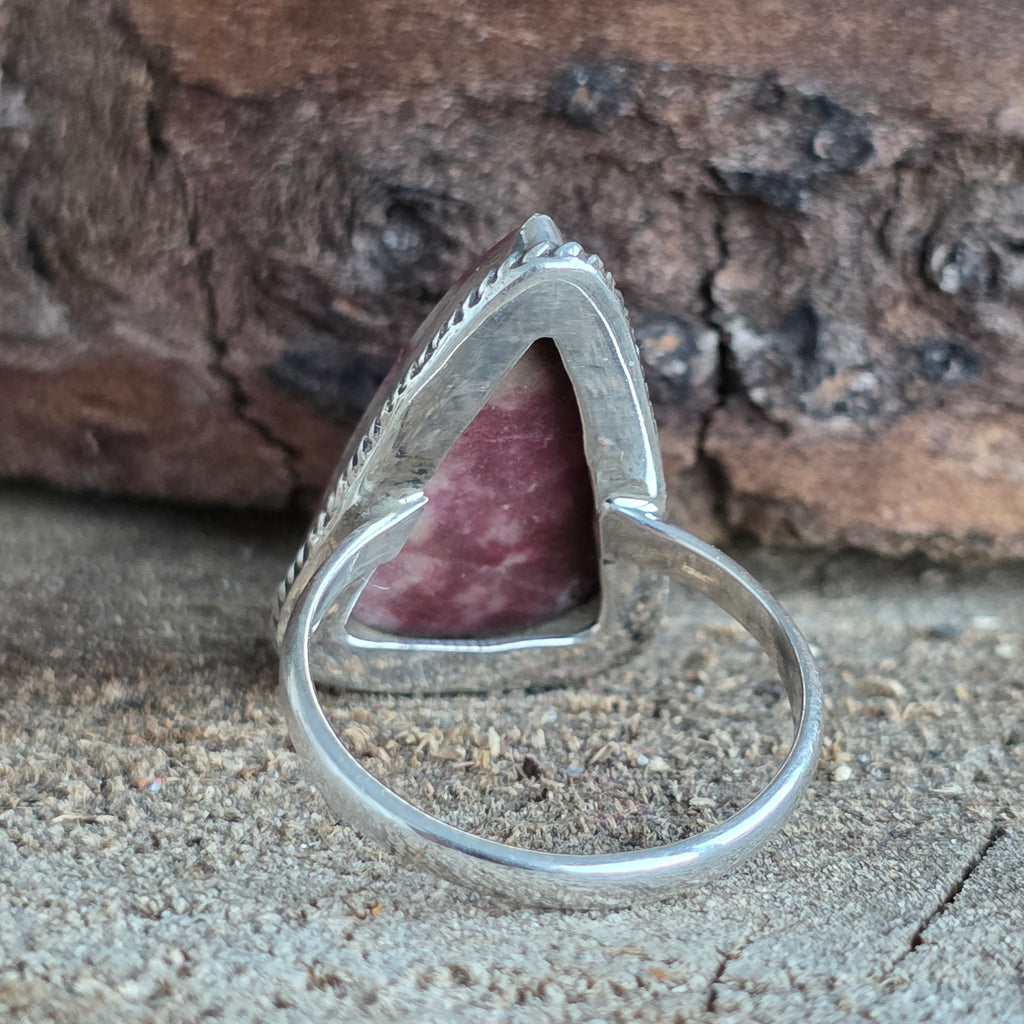 Un inel din argint 925 ce poartă în sine energia pământului nordic – Tulitul, o varietate roz de zoisit, cu textură naturală și variații fine de culoare între roz somon, fucsia și alb calcaros.