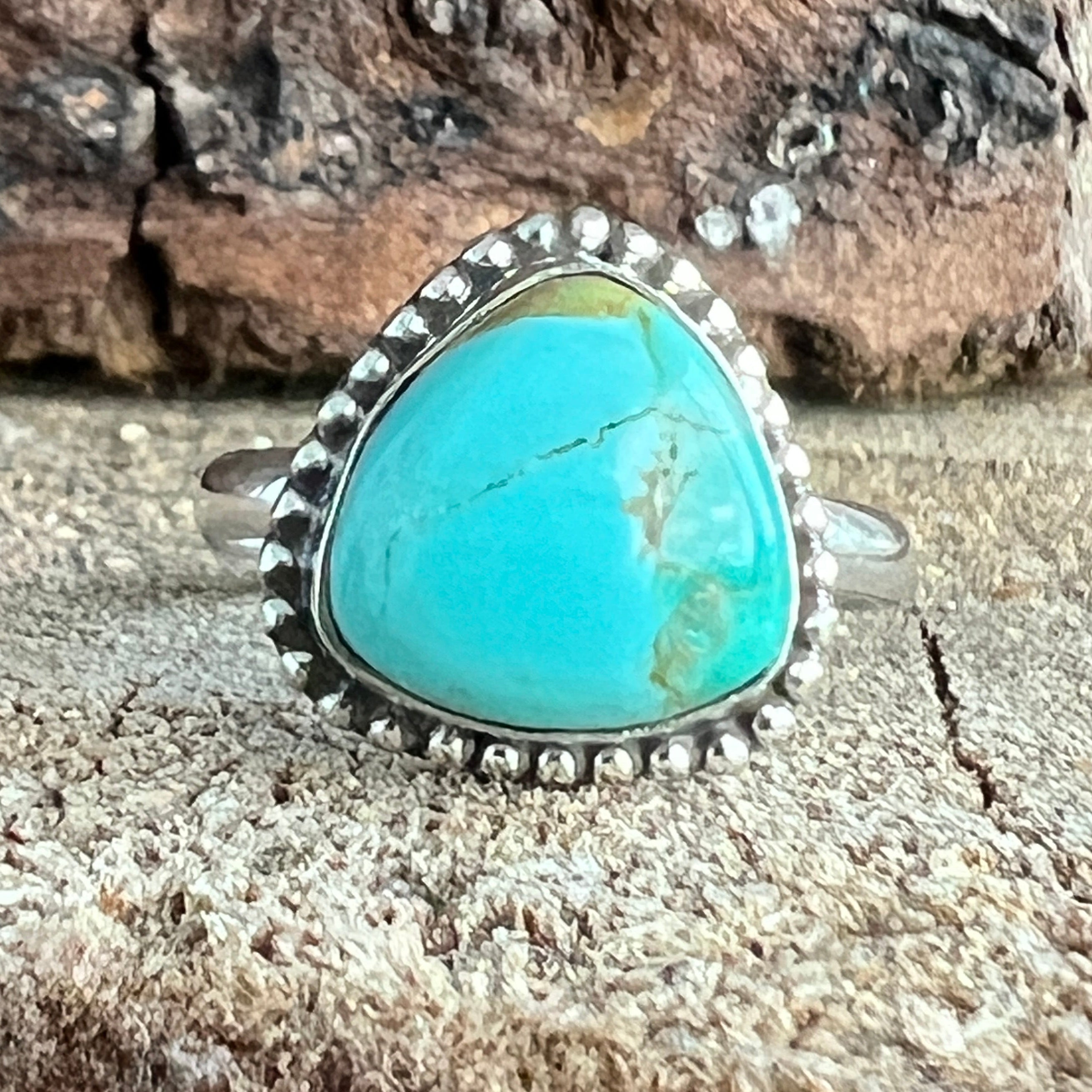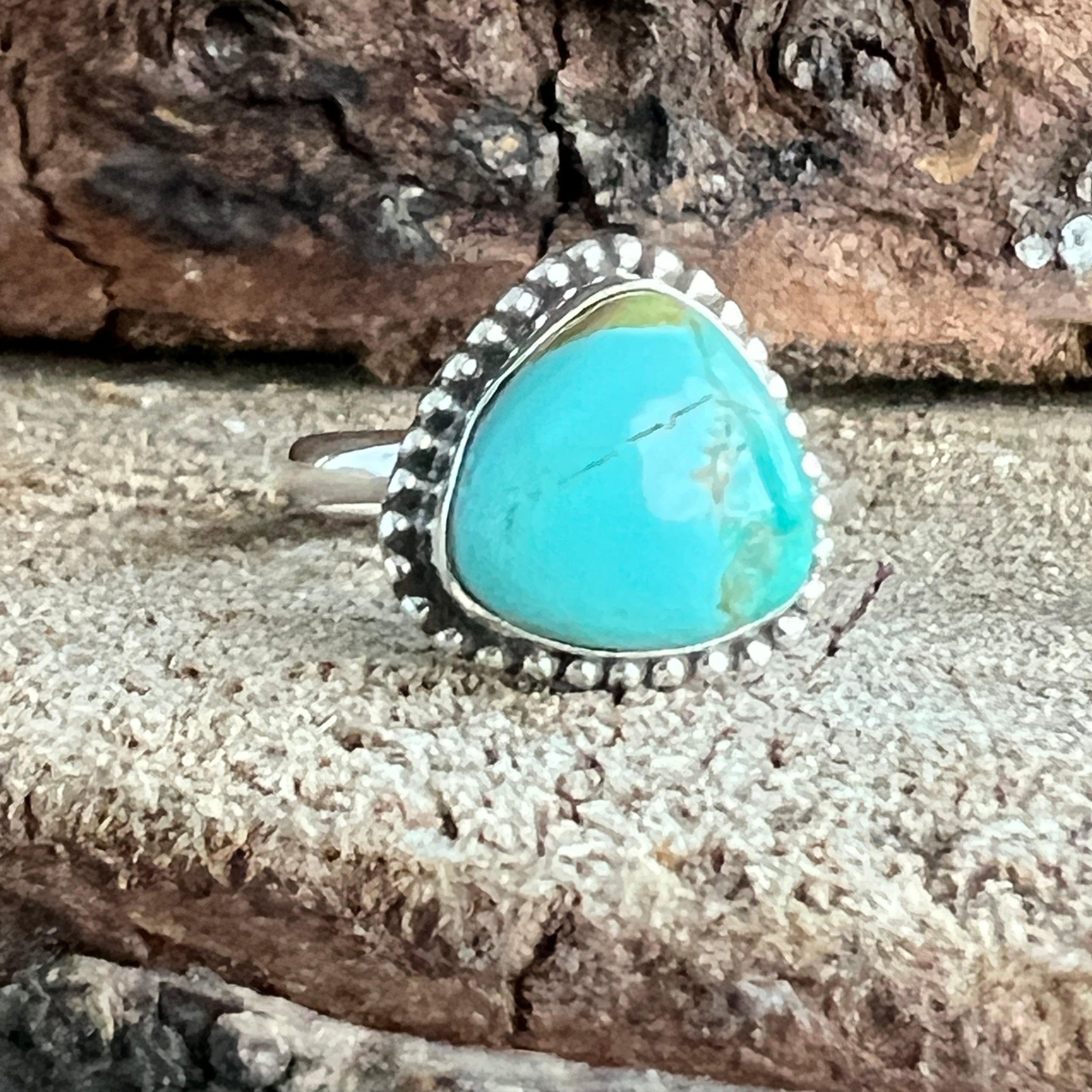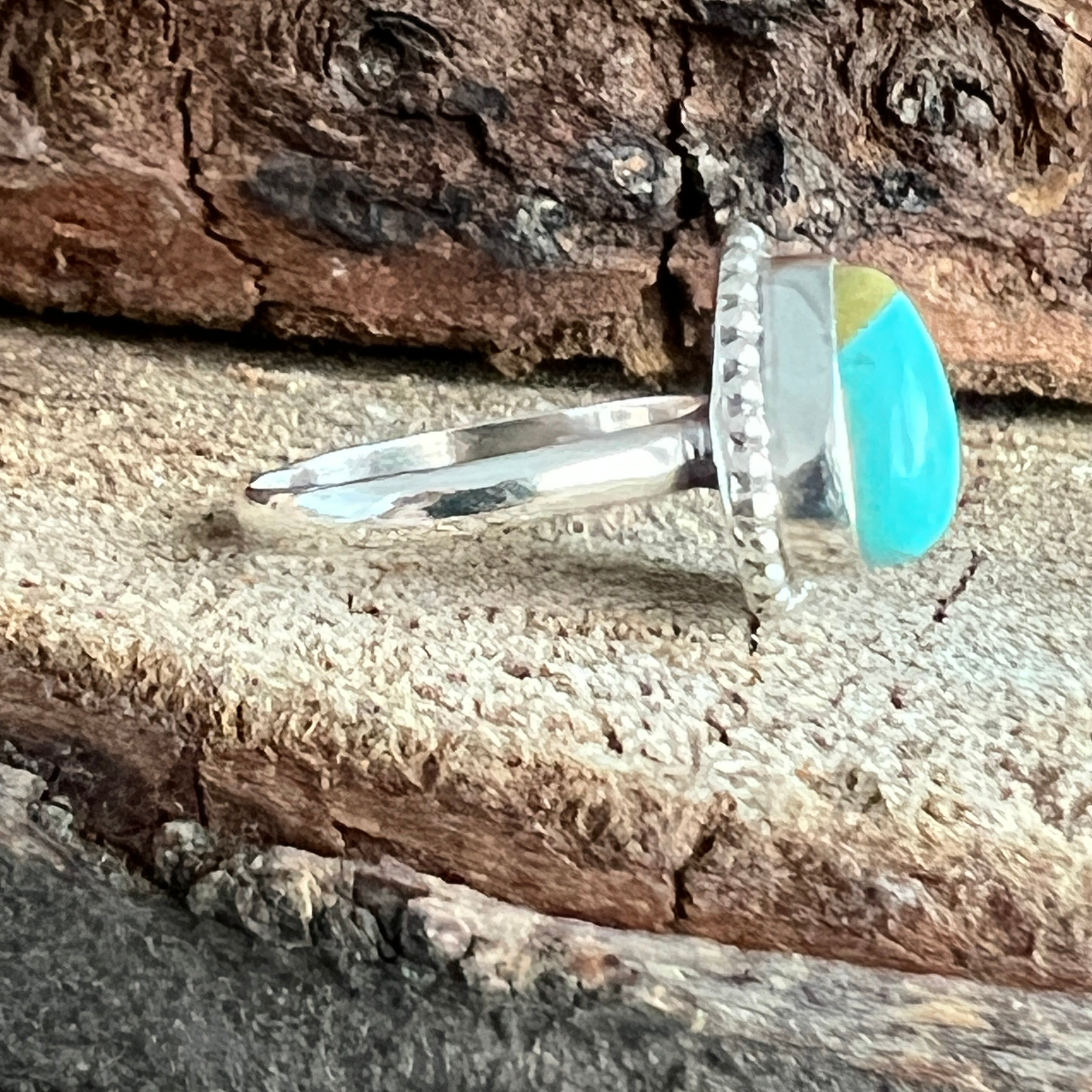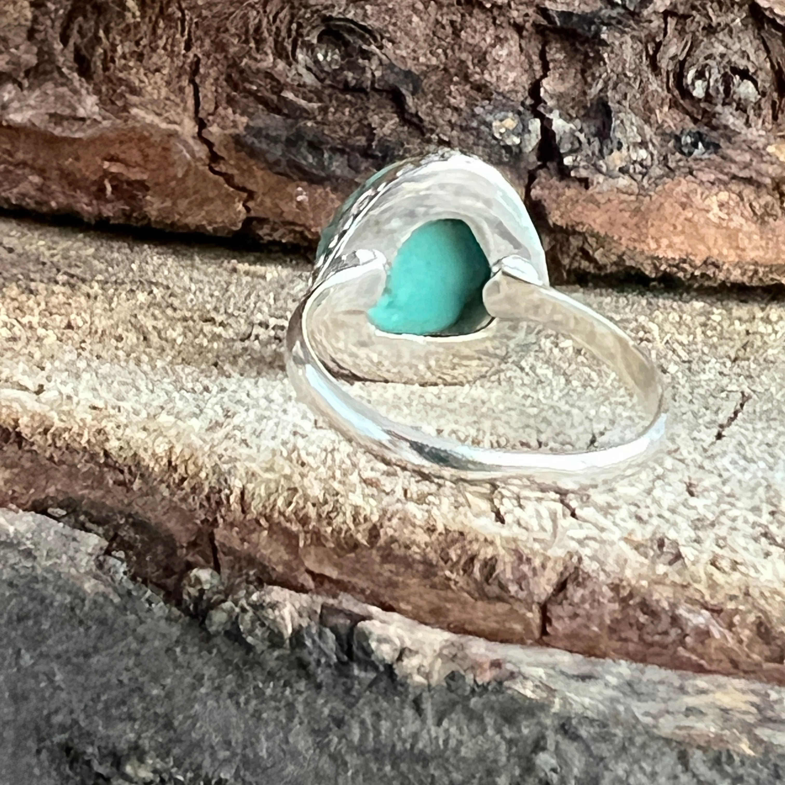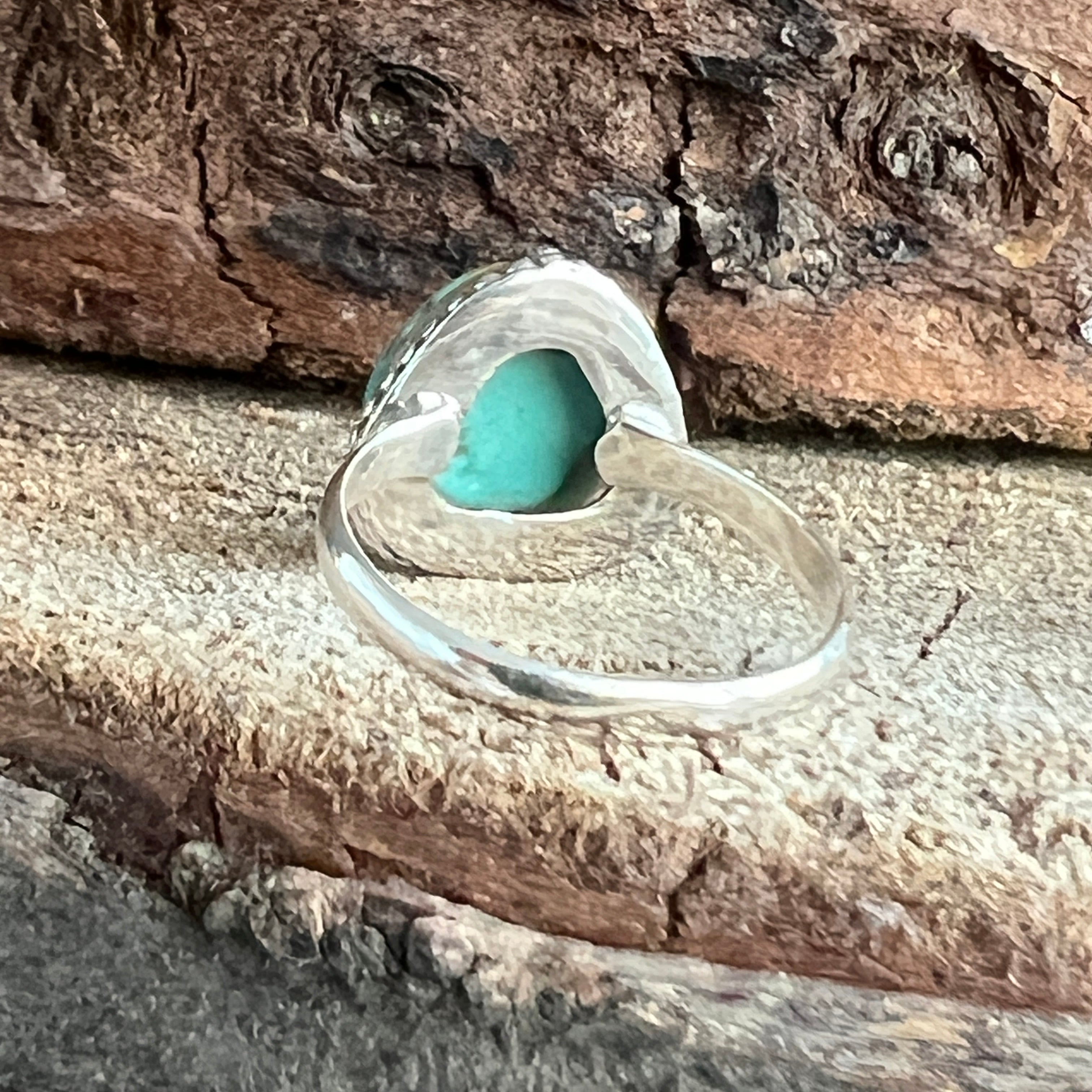 Un inel elegant din argint 925, cu o piatră naturală de turcoaz cu nuanțe variind între albastru cer și verde acvatic, străbătută de vene fine maronii și gri. Designul minimalist tip plain collet lasă întreaga atenție pietrei, punând în valoare frumusețea ei organică și textura autentică.