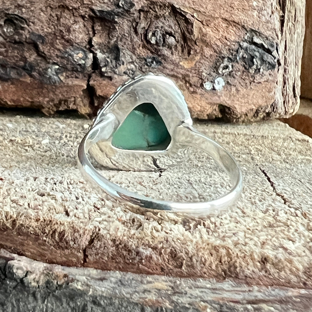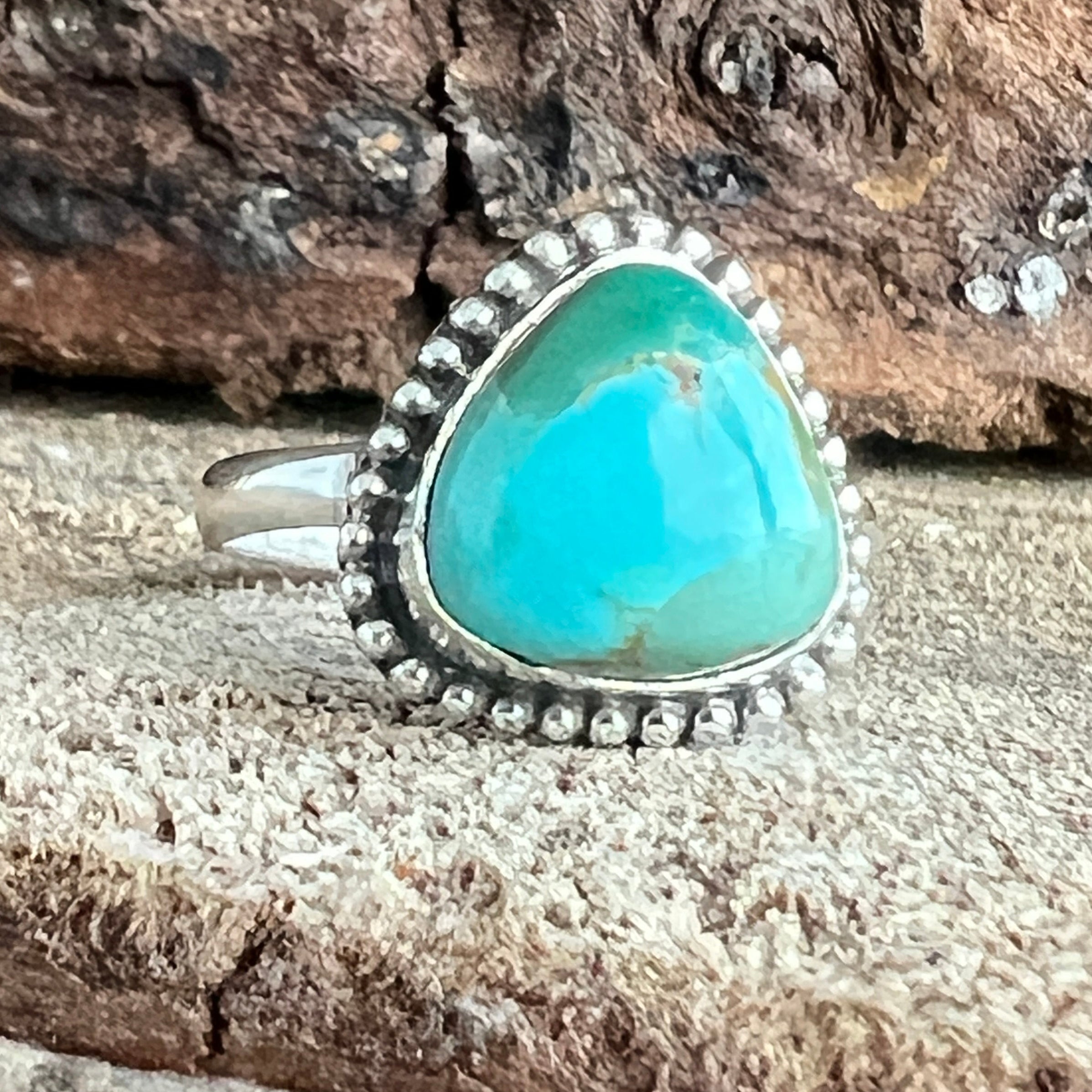 Un inel elegant din argint 925, cu o piatră naturală de turcoaz cu nuanțe variind între albastru cer și verde acvatic, străbătută de vene fine maronii și gri. Designul minimalist tip plain collet lasă întreaga atenție pietrei, punând în valoare frumusețea ei organică și textura autentică.