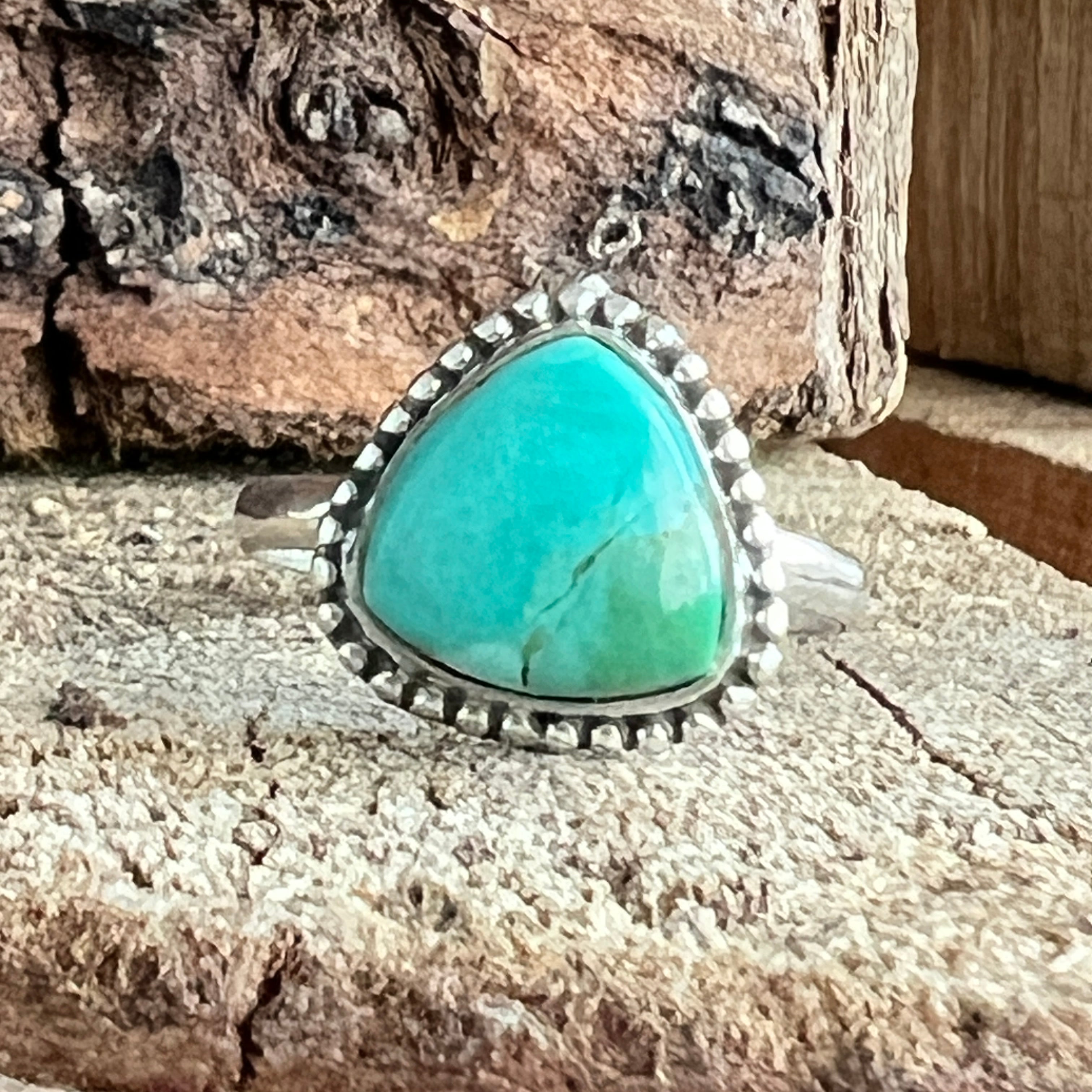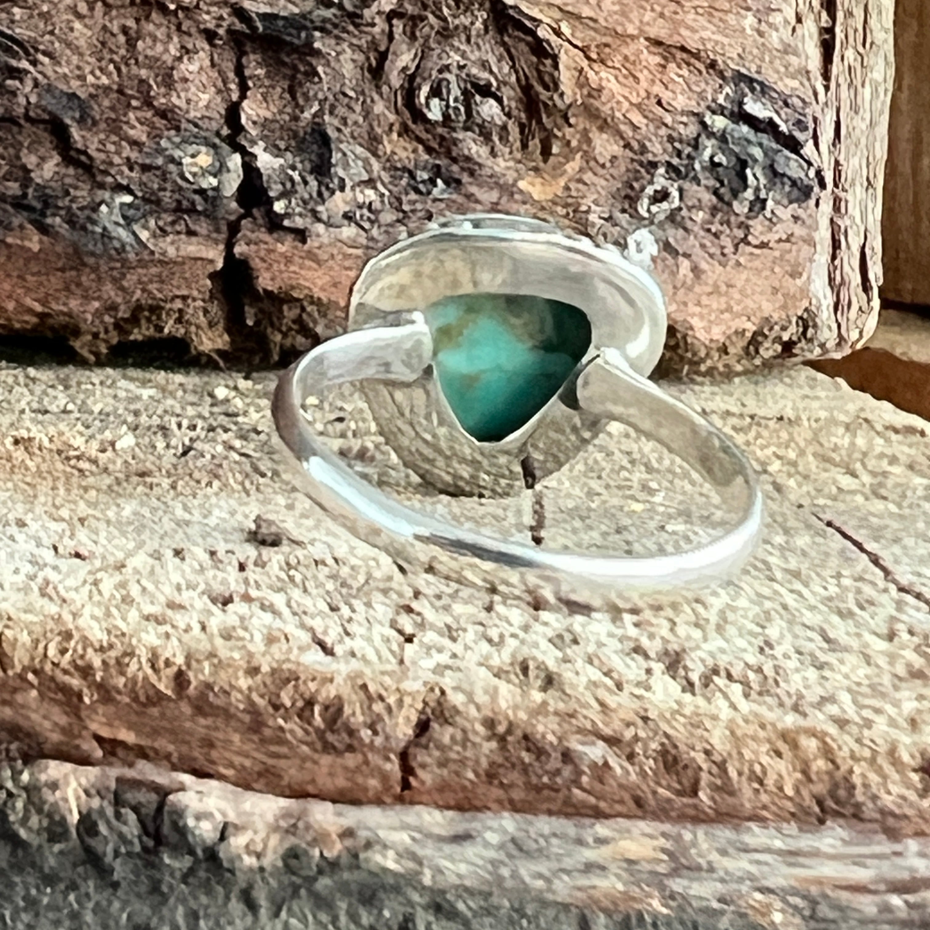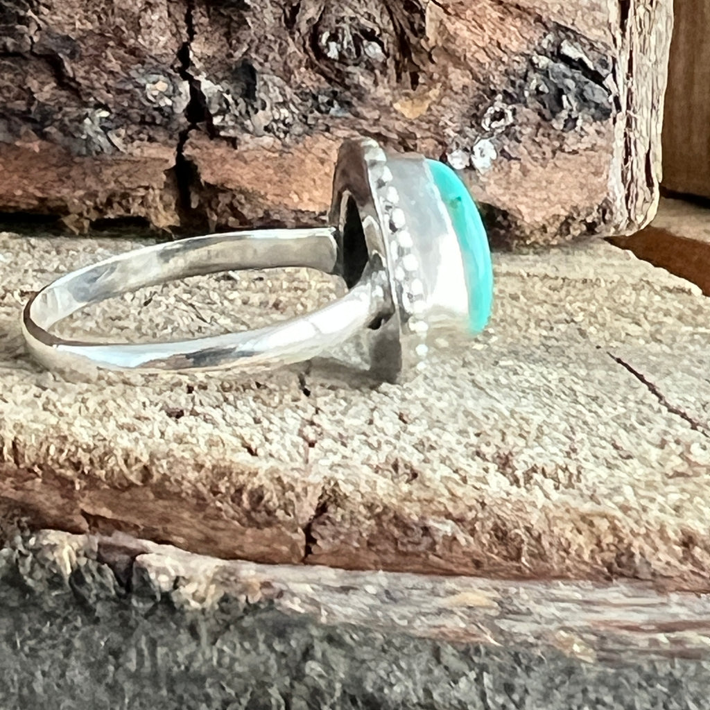 Un inel elegant din argint 925, cu o piatră naturală de turcoaz cu nuanțe variind între albastru cer și verde acvatic, străbătută de vene fine maronii și gri. Designul minimalist tip plain collet lasă întreaga atenție pietrei, punând în valoare frumusețea ei organică și textura autentică.