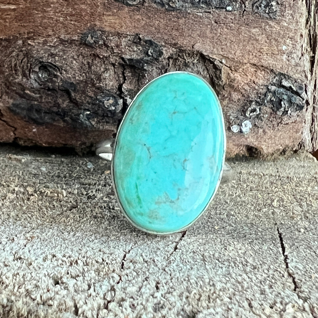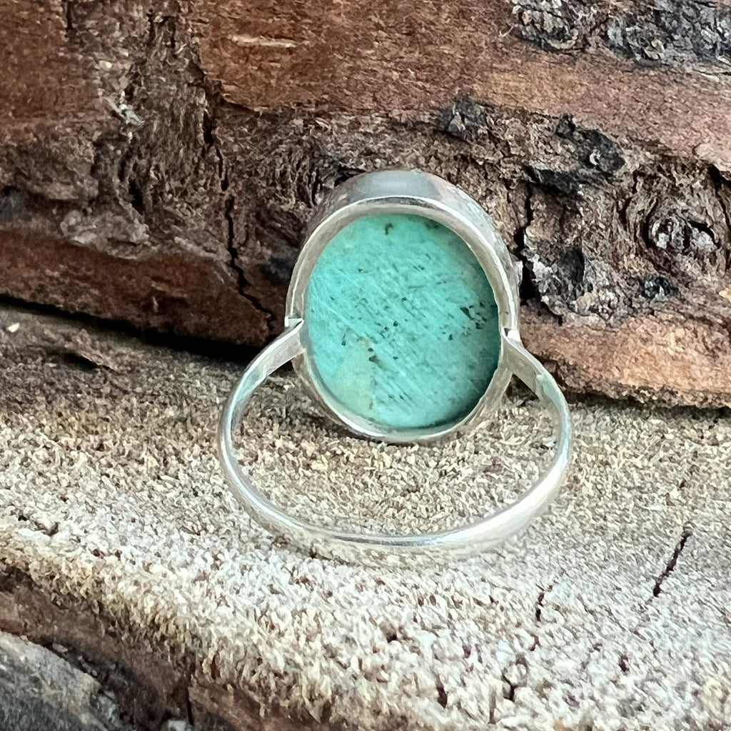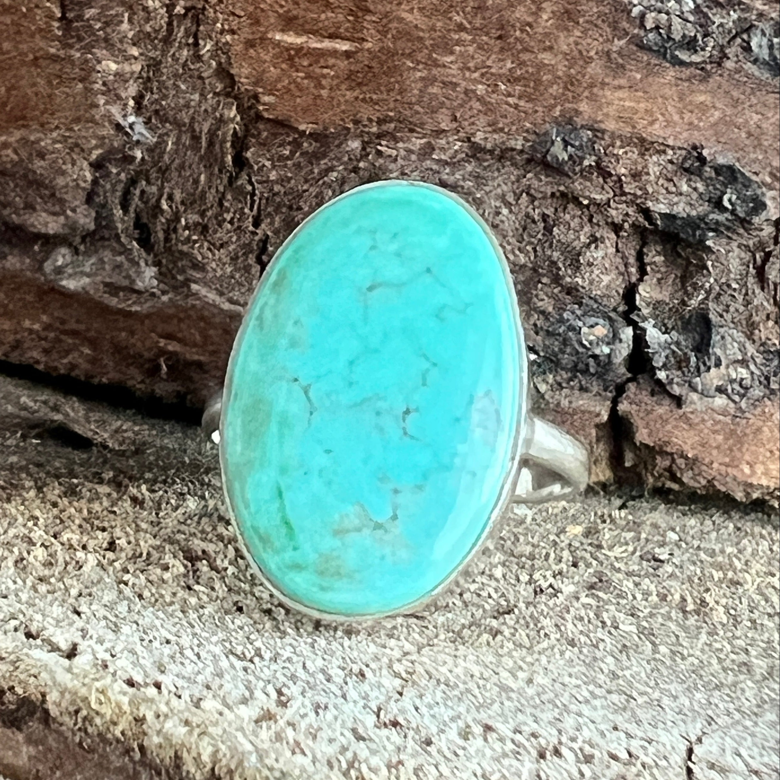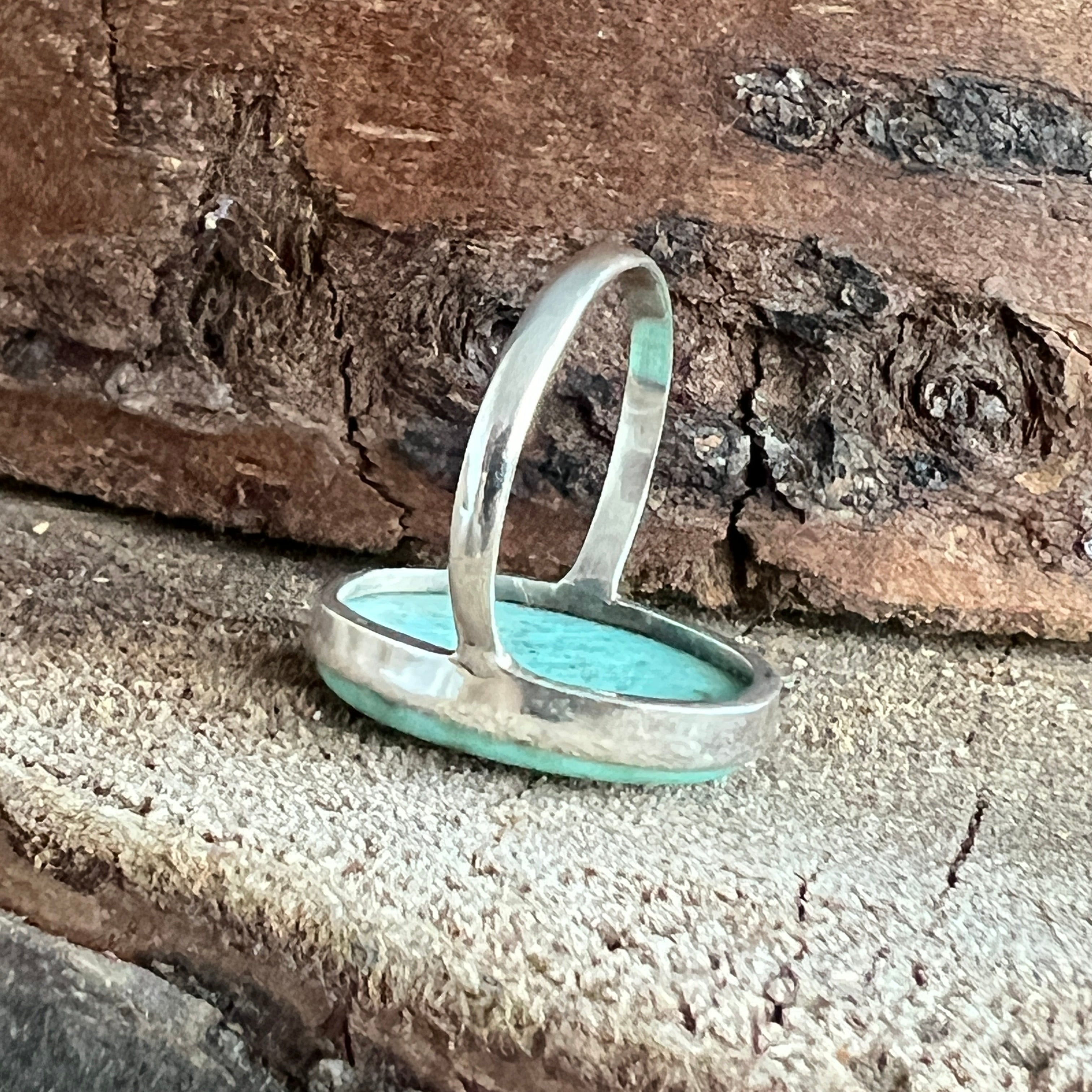 Un inel elegant din argint 925, cu o piatră naturală de turcoaz cu nuanțe variind între albastru cer și verde acvatic, străbătută de vene fine maronii și gri. Designul minimalist tip plain collet lasă întreaga atenție pietrei, punând în valoare frumusețea ei organică și textura autentică.