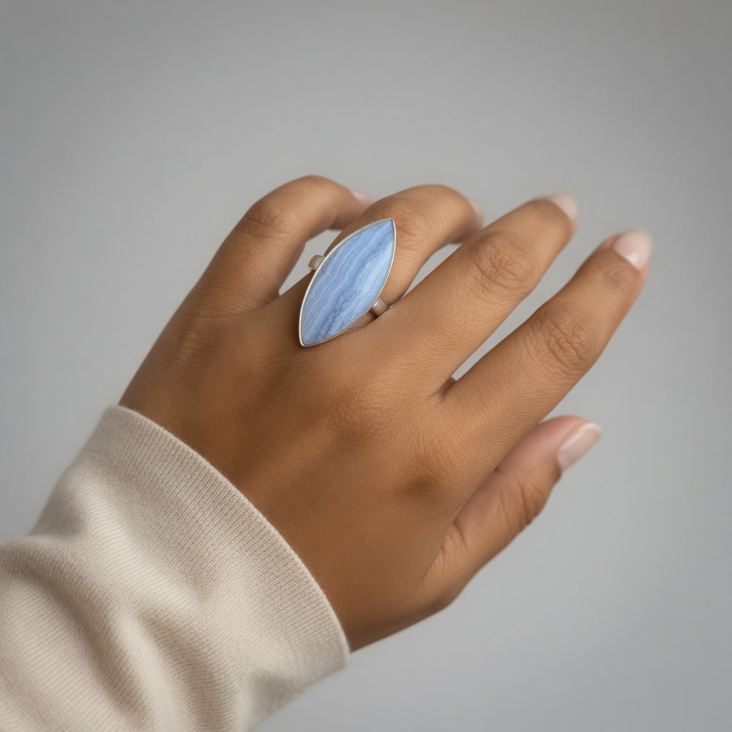 Descoperă colecția noastră de bijuterii cu calcedonie Blue Lace, unde fiecare piatră spune o poveste despre calm, claritate și frumusețea interioară care radiază tăcut.