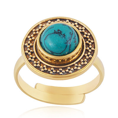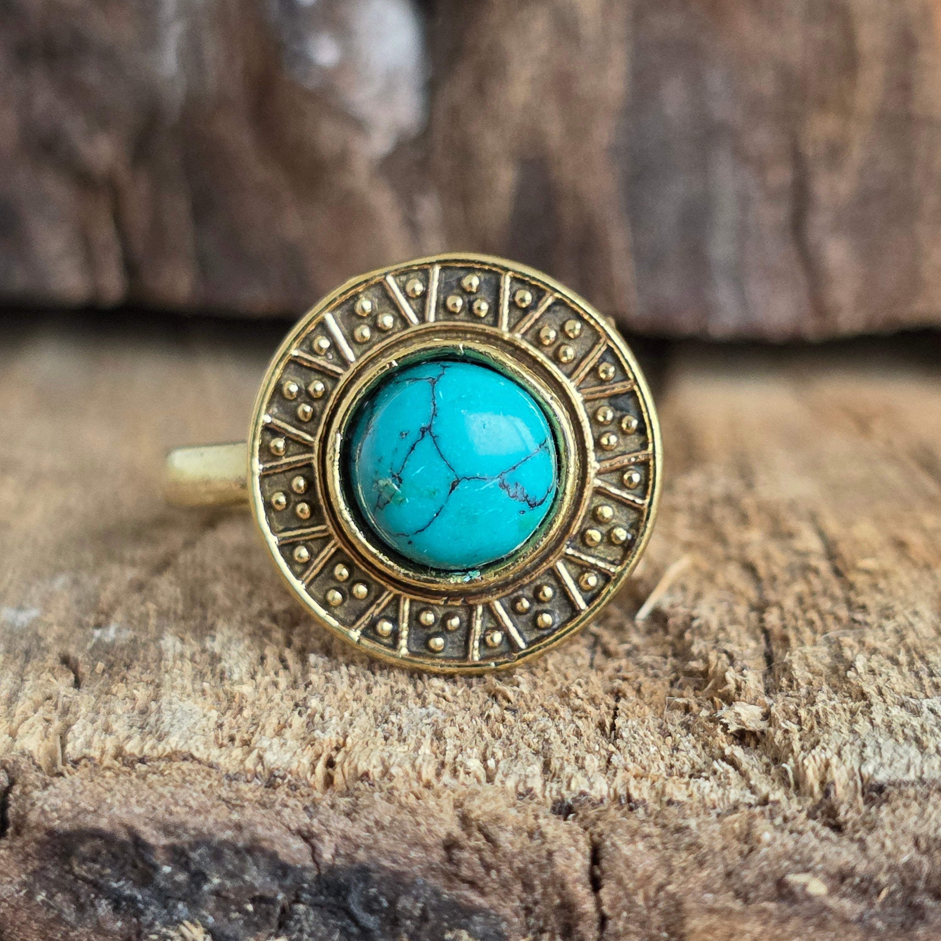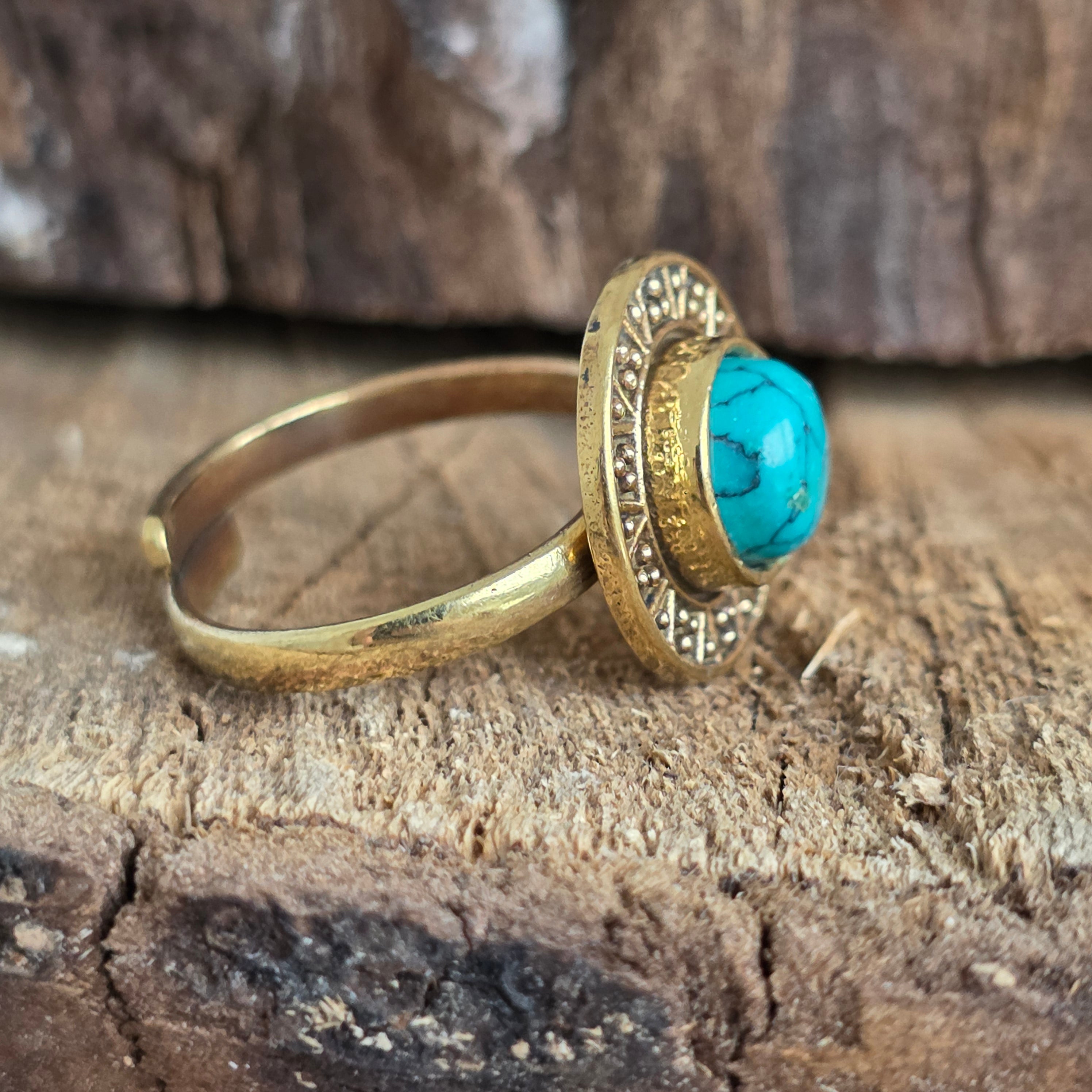 Un inel cu personalitate, inspirat din meșteșugul tradițional indian Rawa work, realizat din aliaj metalic cu finisaj bronz lucios și înnobilat cu o piatră naturală de turcoaz.