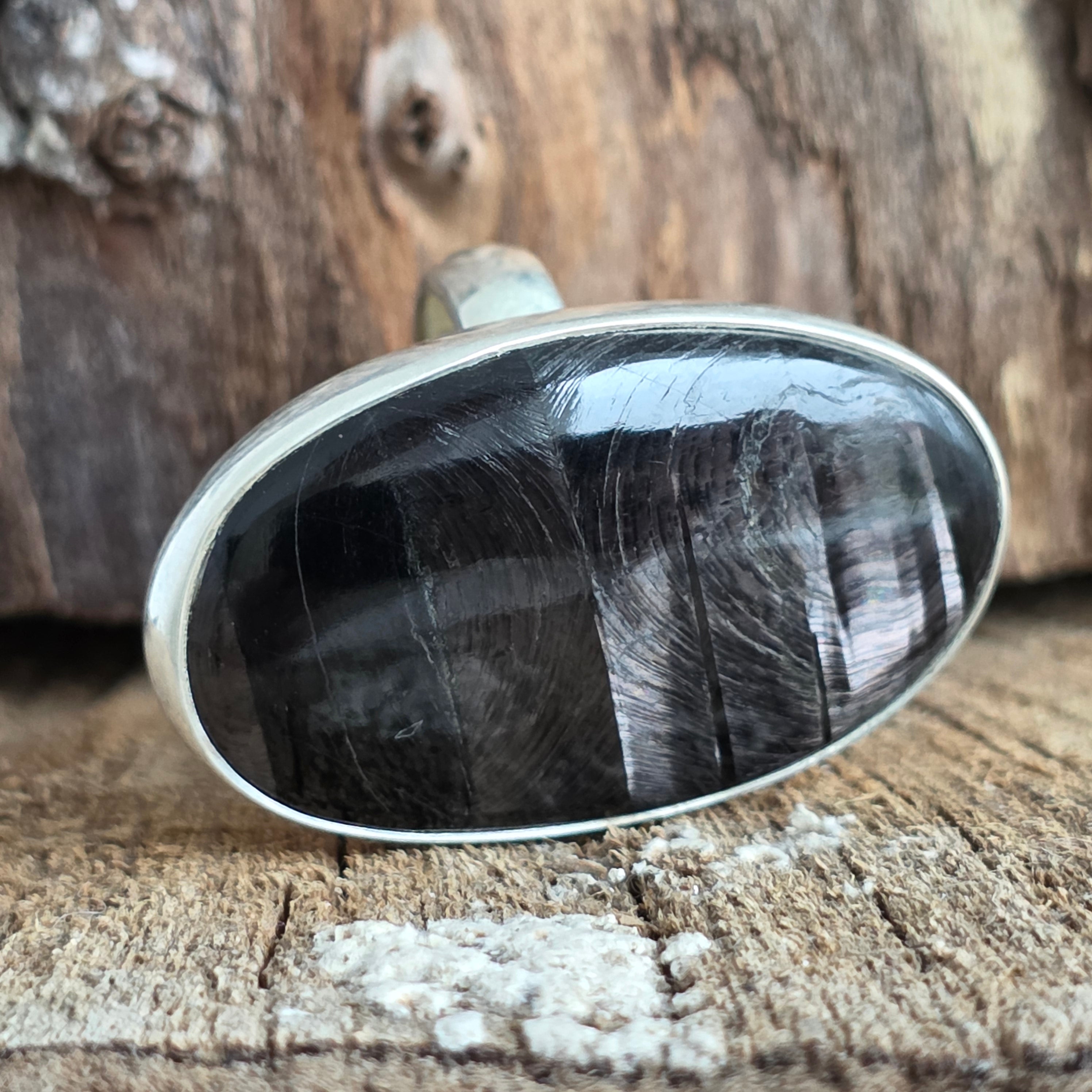 Poartă acest inel cu hipersten natural pentru a adăuga claritate, echilibru și eleganță în viața ta – o bijuterie rară și unicat, creată de natură și finisată în argint.
