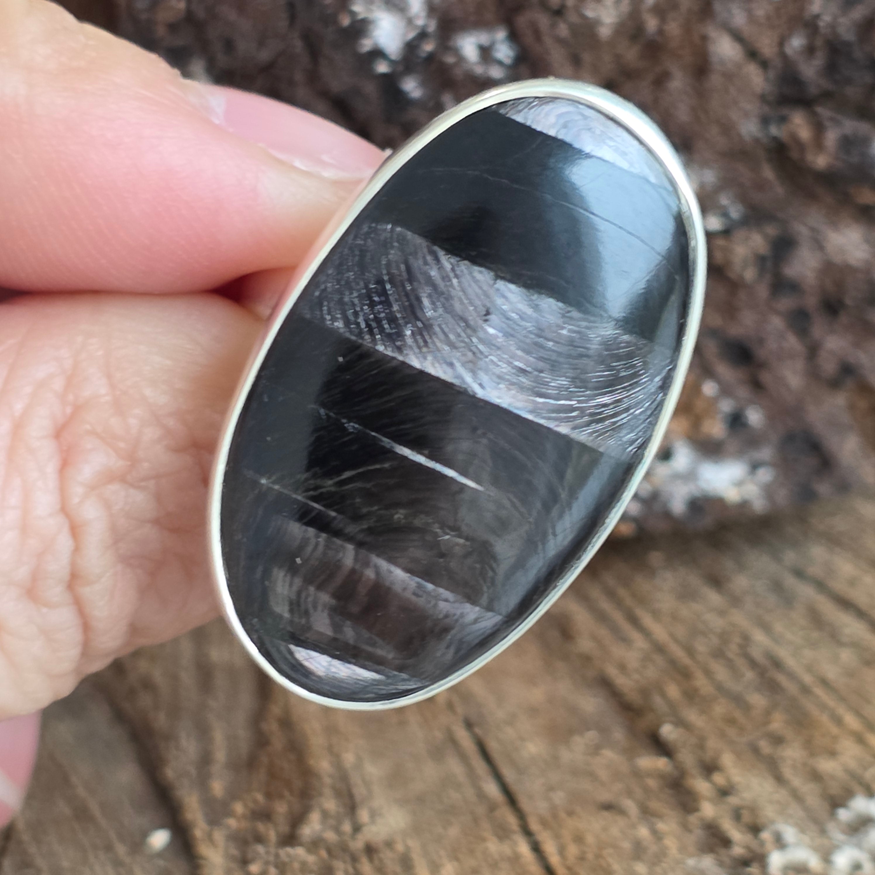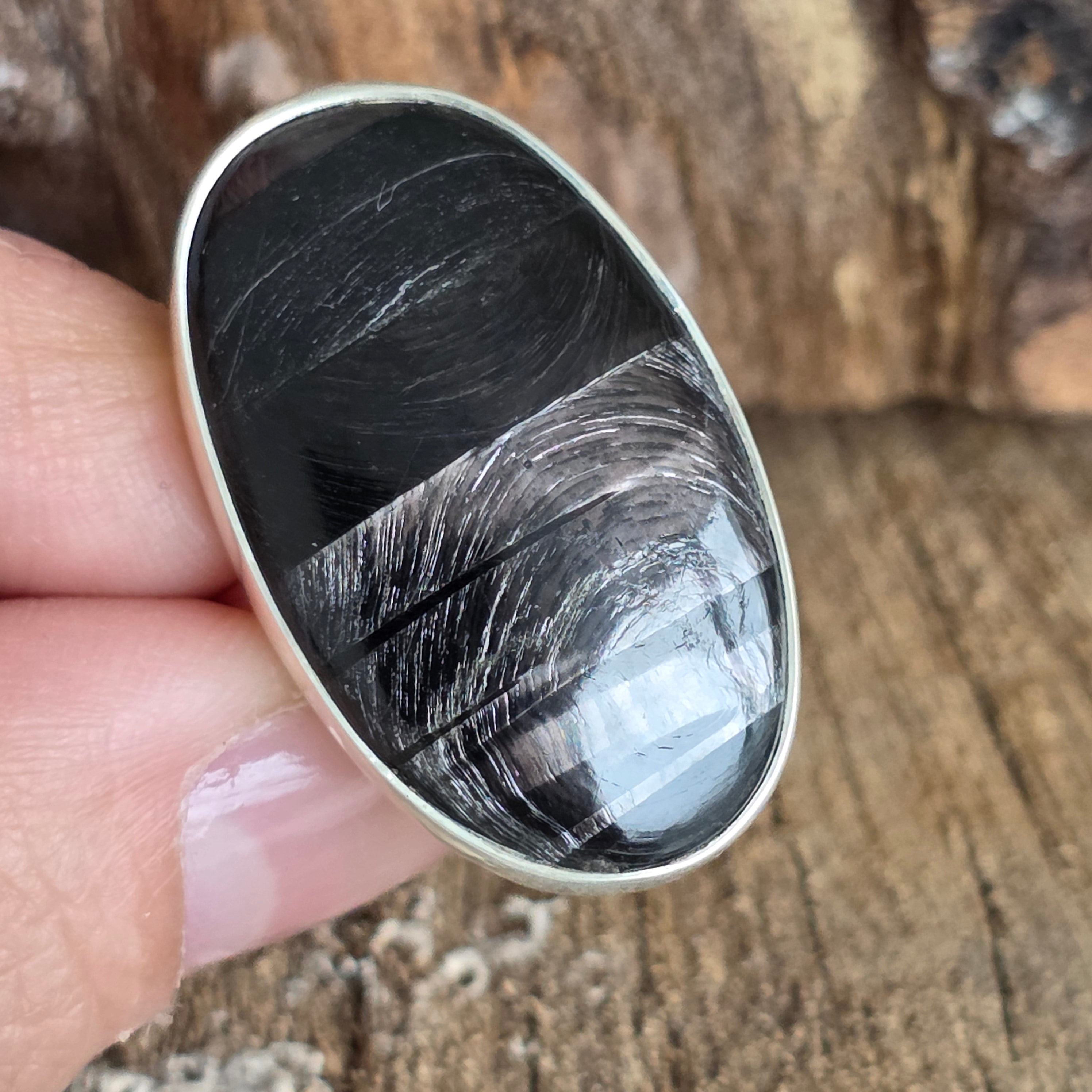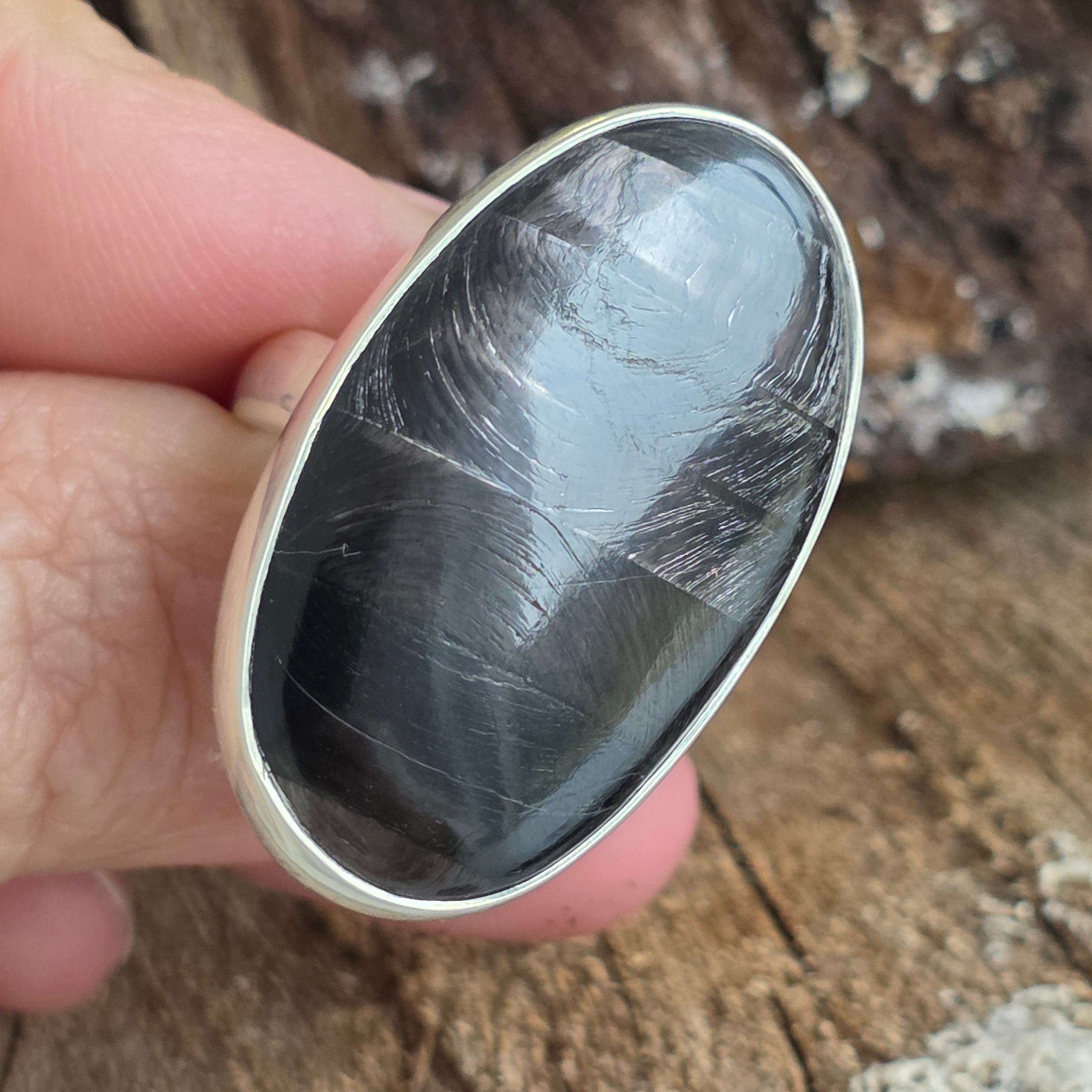 Acest inel din argint 925 cu hipersten natural atrage prin misterul și eleganța sa aparte. Reflexele sale catifelate, într-un joc subtil de gri închis, argintiu și negru, creează efectul optic fascinant de chatoyance, care face ca piatra să pară vie, aflată mereu în mișcare.