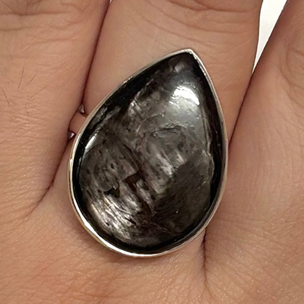 Acest inel din argint 925 cu hipersten natural fascinează prin eleganța sa misterioasă. Piatra, cu suprafața lucioasă și reflexe catifelate, dezvăluie nuanțe adânci de negru și argintiu, cu jocuri de lumină ce par să se miște odată cu fiecare unghi.