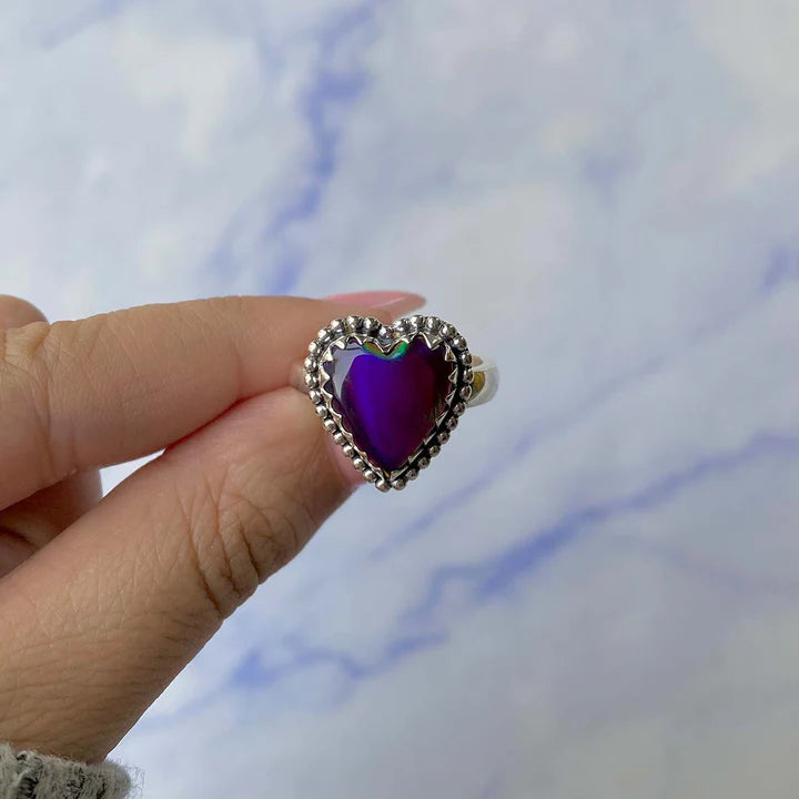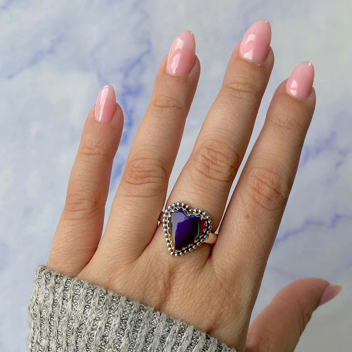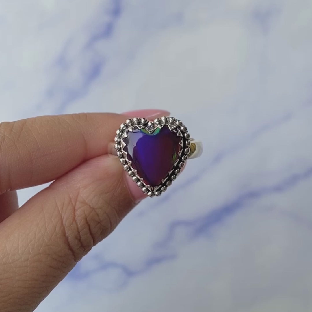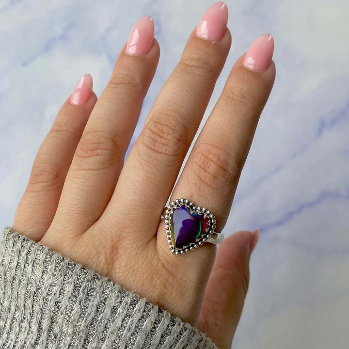 Acest inel din opal etiopian, în formă de inimă, captează privirea prin reflexiile sale intense în nuanțe de roșu, portocaliu și albastru, care dansează diferit în fiecare lumină. Fiecare piesă este unică, iar variațiile naturale ale opalului transformă acest inel într-o bijuterie cu adevărat specială.