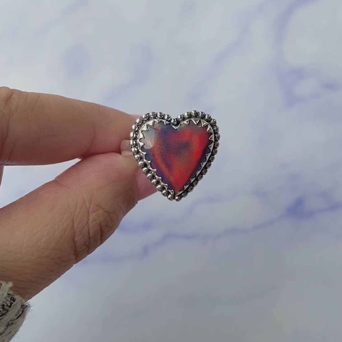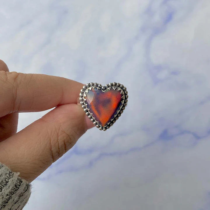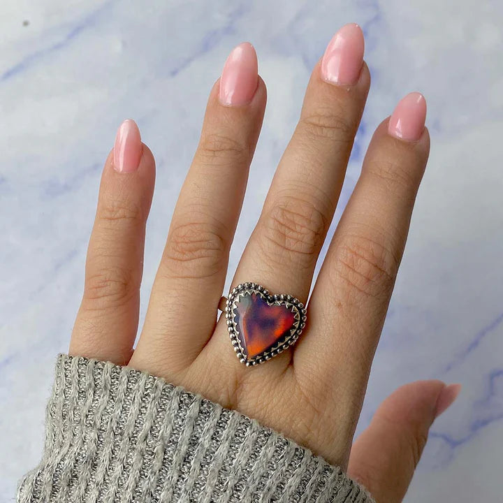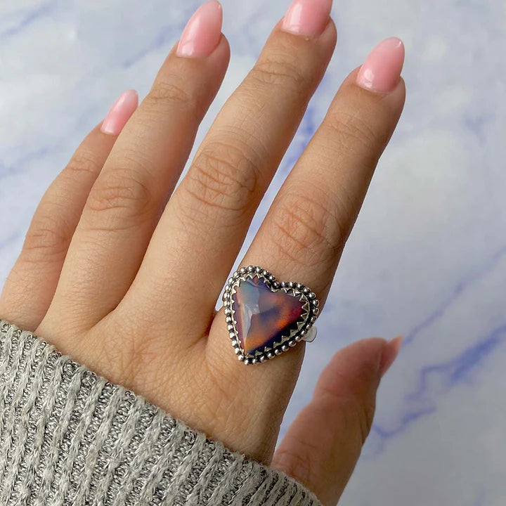 Acest inel din opal etiopian, în formă de inimă, captează privirea prin reflexiile sale intense în nuanțe de roșu, portocaliu și albastru, care dansează diferit în fiecare lumină. Fiecare piesă este unică, iar variațiile naturale ale opalului transformă acest inel într-o bijuterie cu adevărat specială.