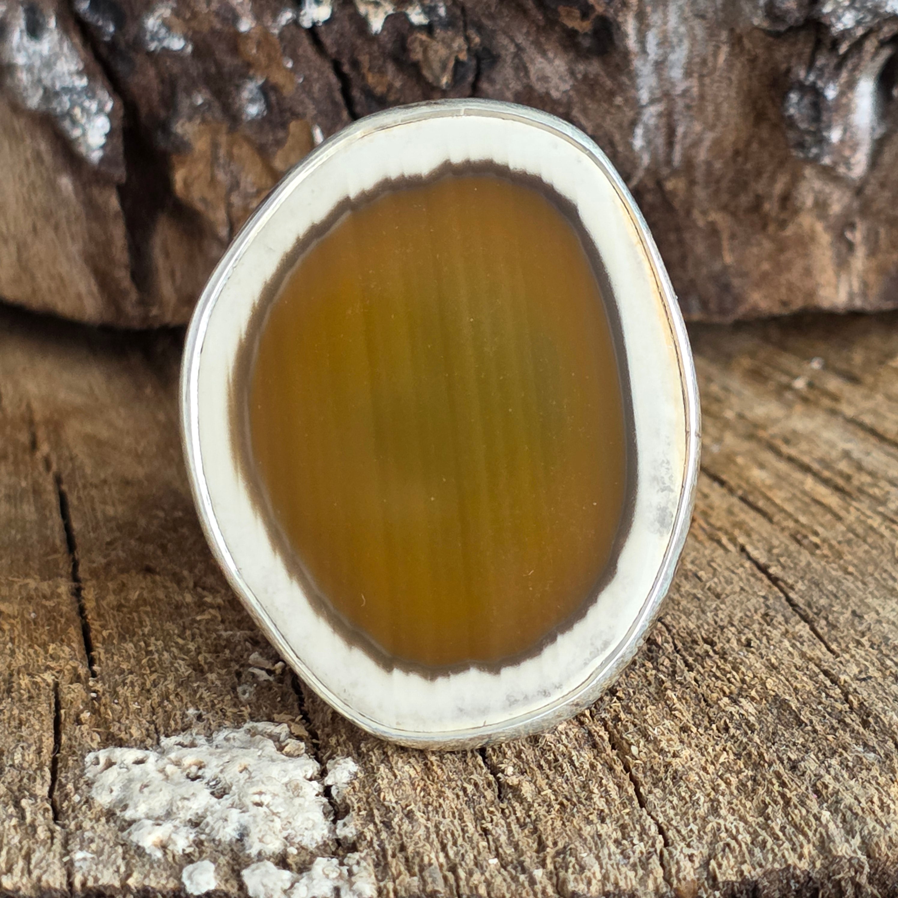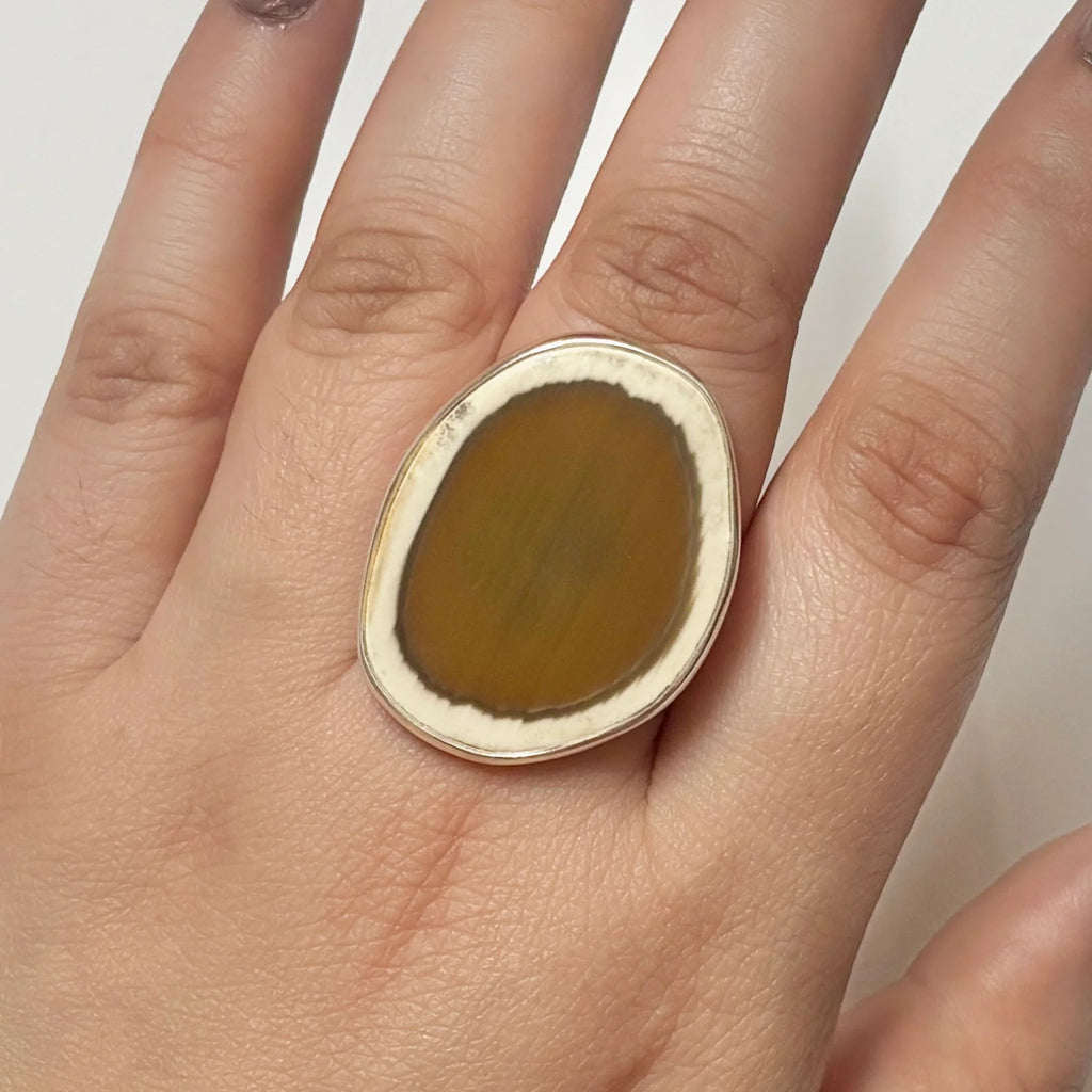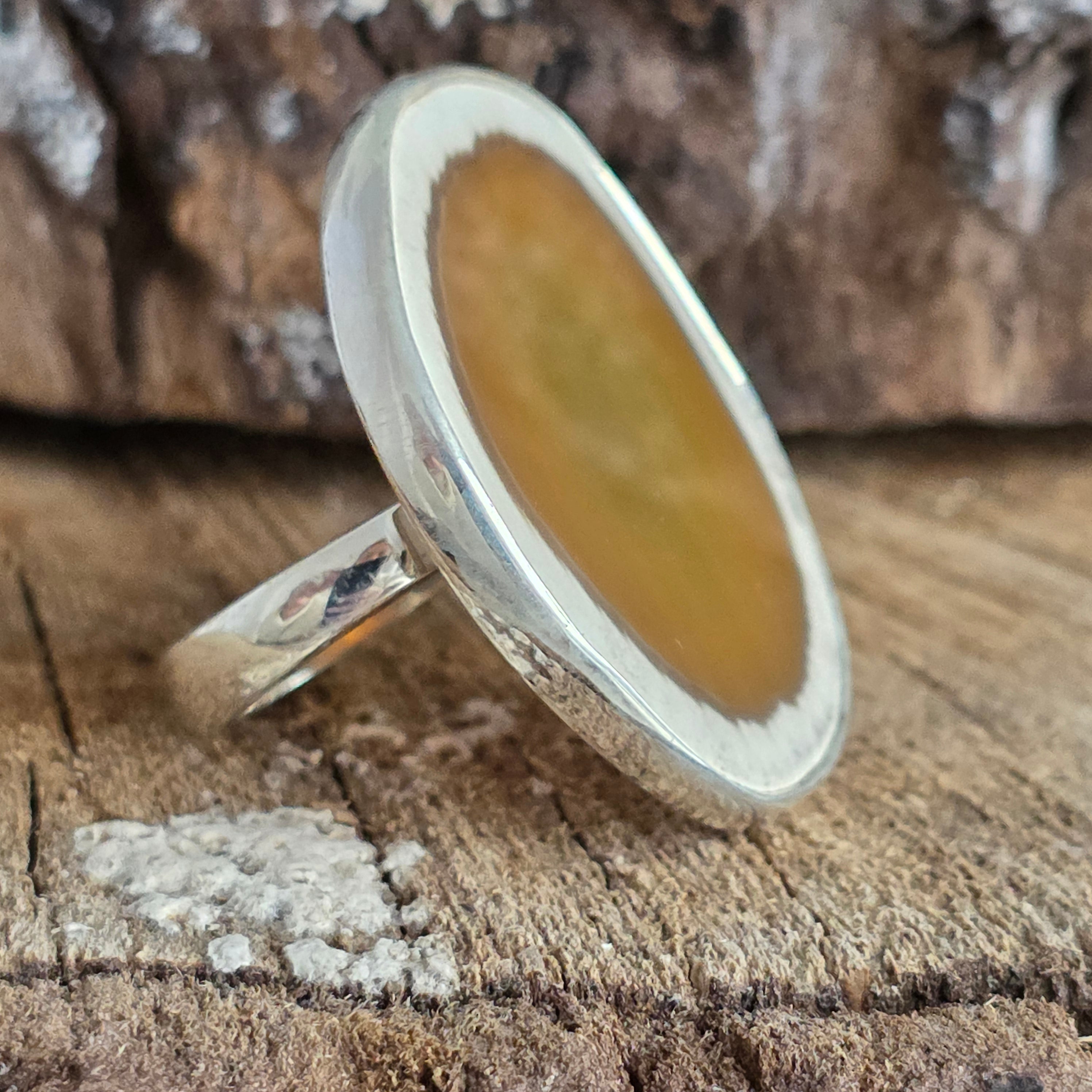 Acest inel din argint cu Imperial Jasper natural dezvăluie frumusețea autentică a unei pietre recunoscute pentru culorile sale calde și desenele unice. Nuanța centrală de verde-oliv, încadrată de o margine crem distinctă, conferă un aspect organic și rafinat, transformând fiecare piesă într-o creație irepetabilă.