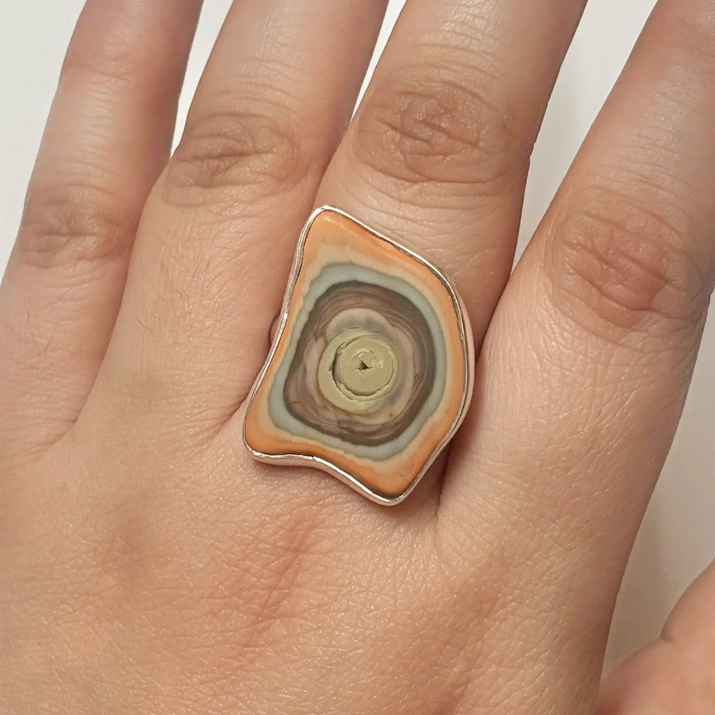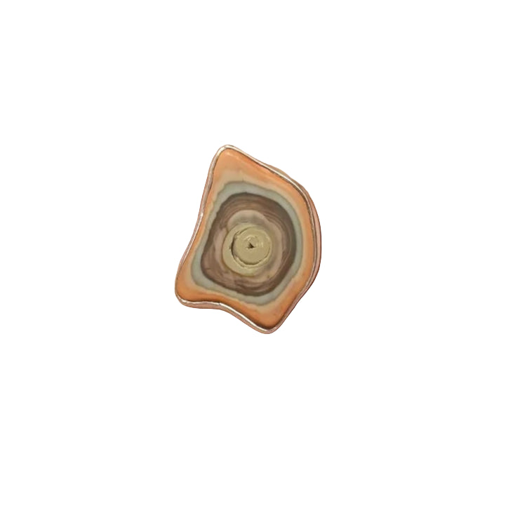 Acest inel din argint cu Imperial Jasper natural dezvăluie frumusețea autentică a unei pietre recunoscute pentru culorile sale calde și desenele unice. Nuanța centrală de verde-oliv, încadrată de o margine crem distinctă, conferă un aspect organic și rafinat, transformând fiecare piesă într-o creație irepetabilă.