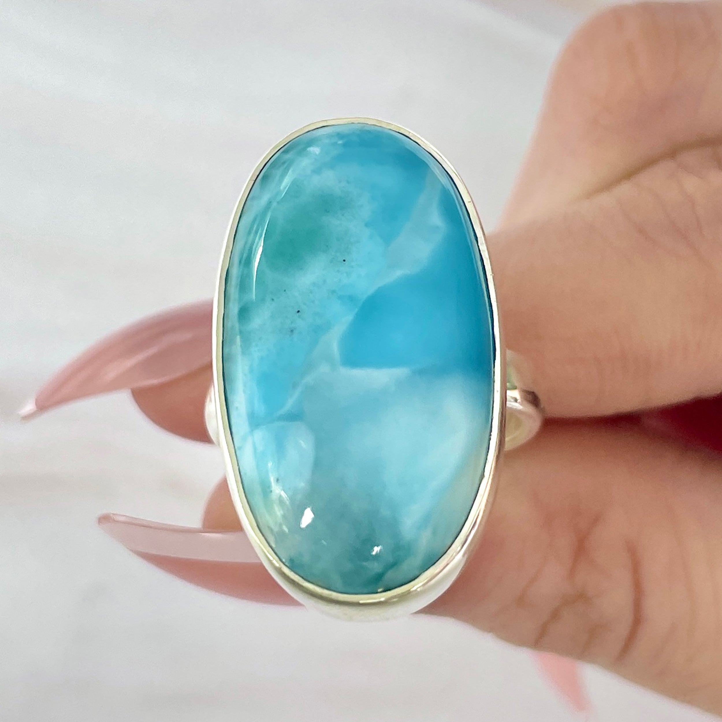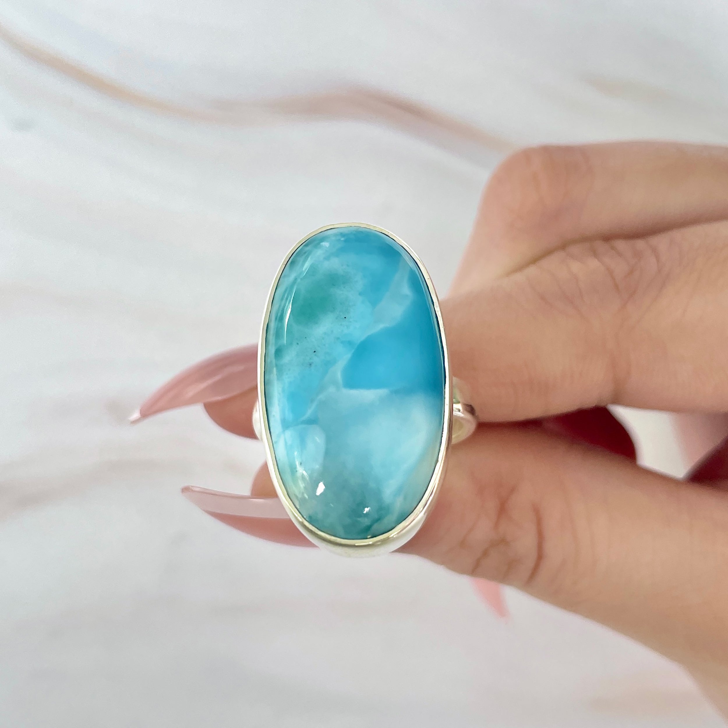 Un inel unicat din larimar natural, cunoscut drept piatra cerului și a oceanului. Nuanțele sale de albastru acvatic, cu reflexii albe ca valurile mării, aduc liniște interioară și o senzație de libertate infinită.