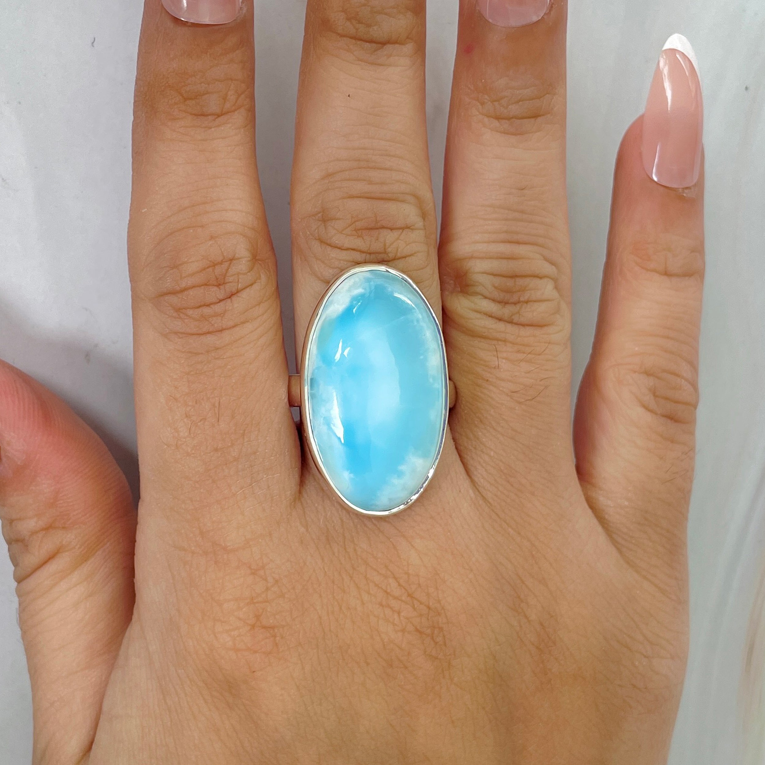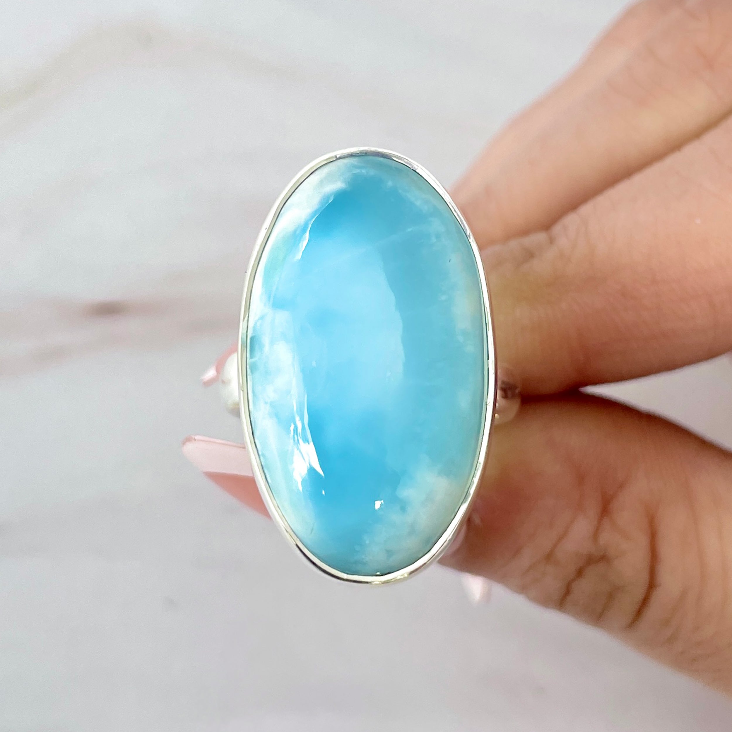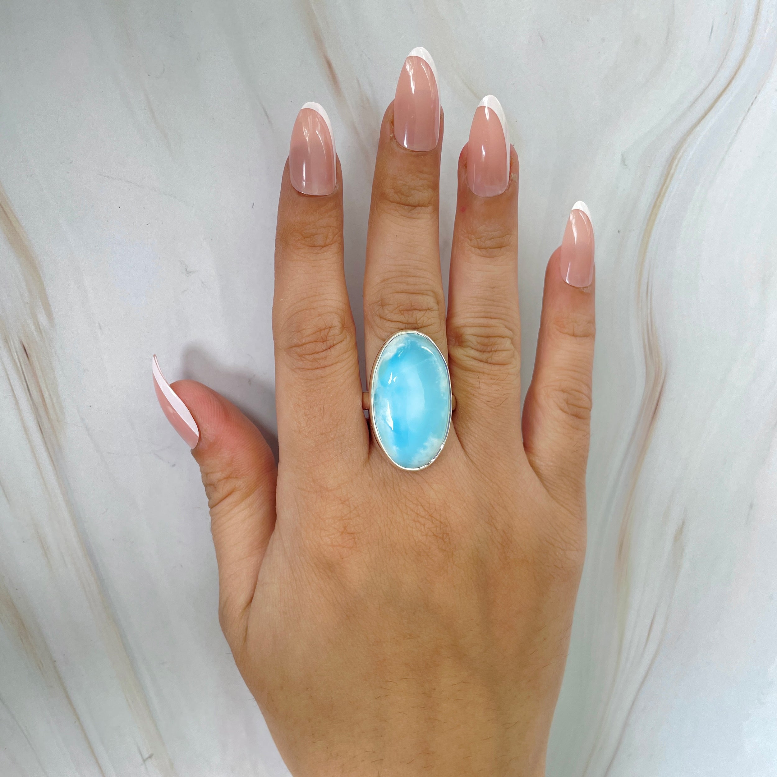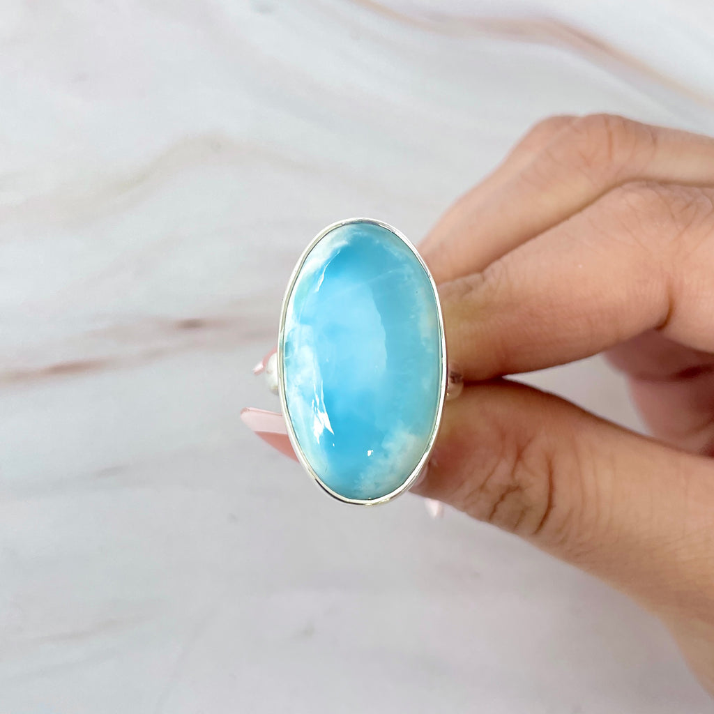 Un inel unicat din larimar natural, cunoscut drept piatra cerului și a oceanului. Nuanțele sale de albastru acvatic, cu reflexii albe ca valurile mării, aduc liniște interioară și o senzație de libertate infinită.