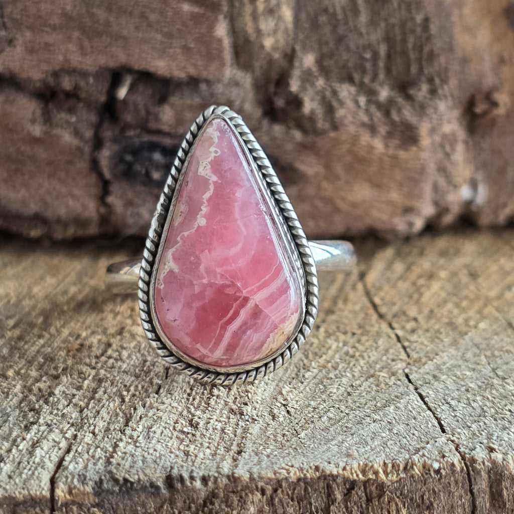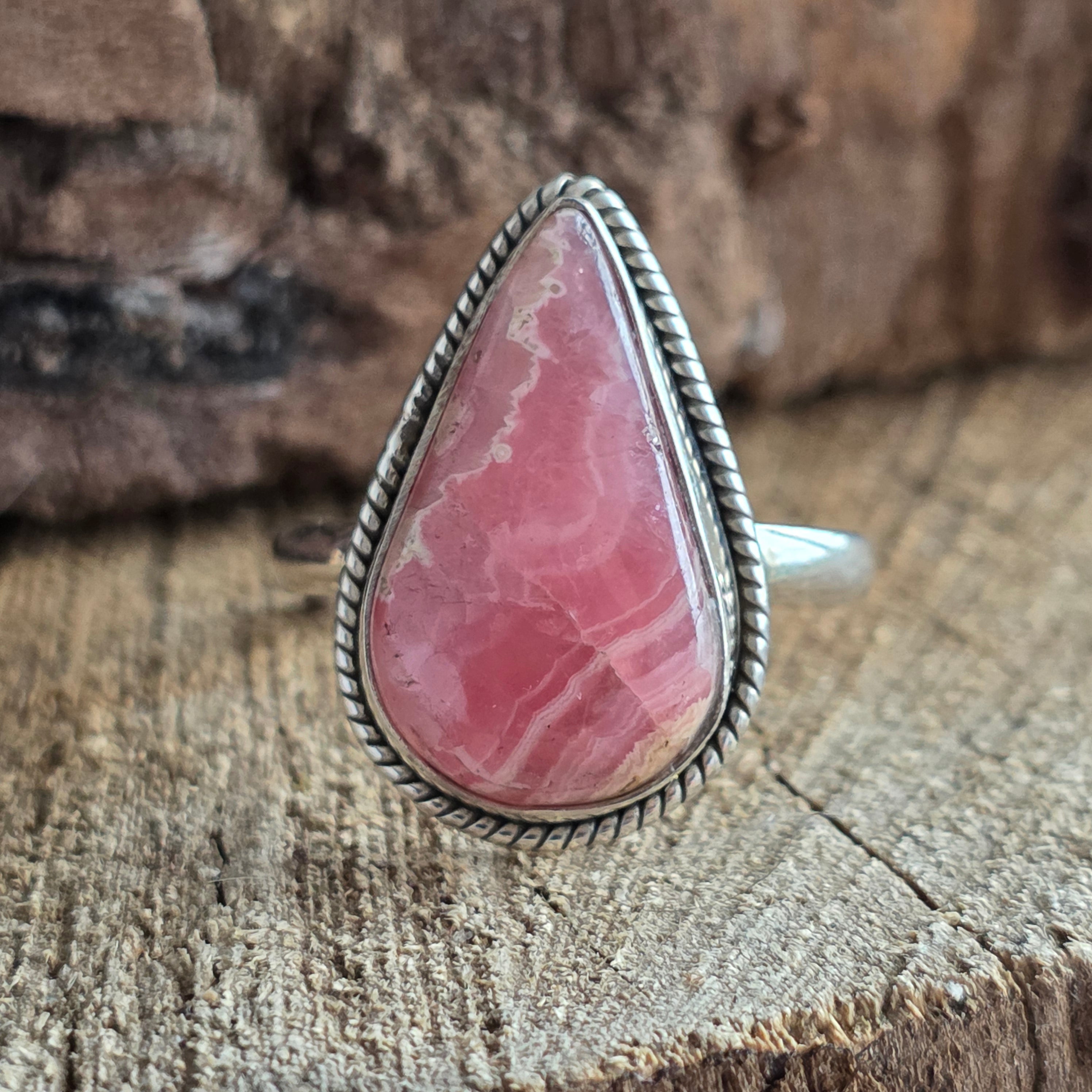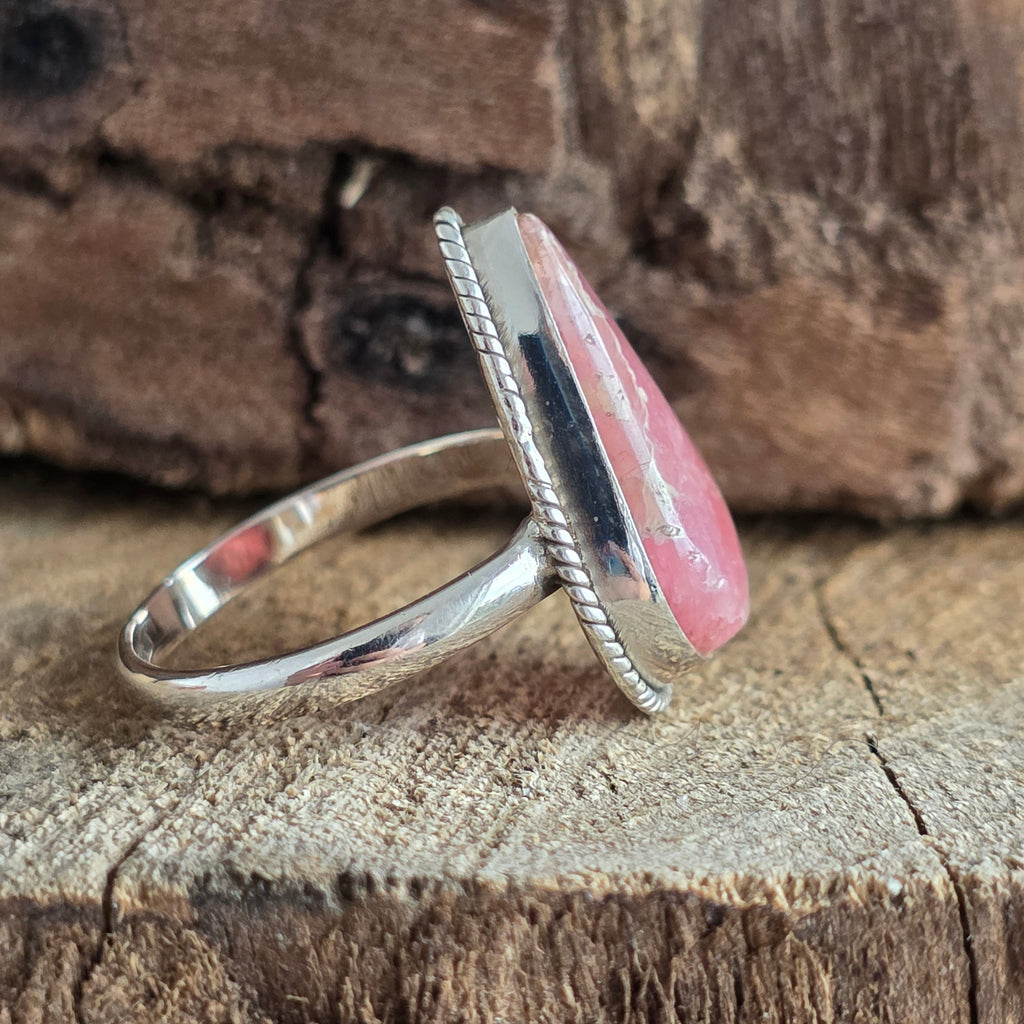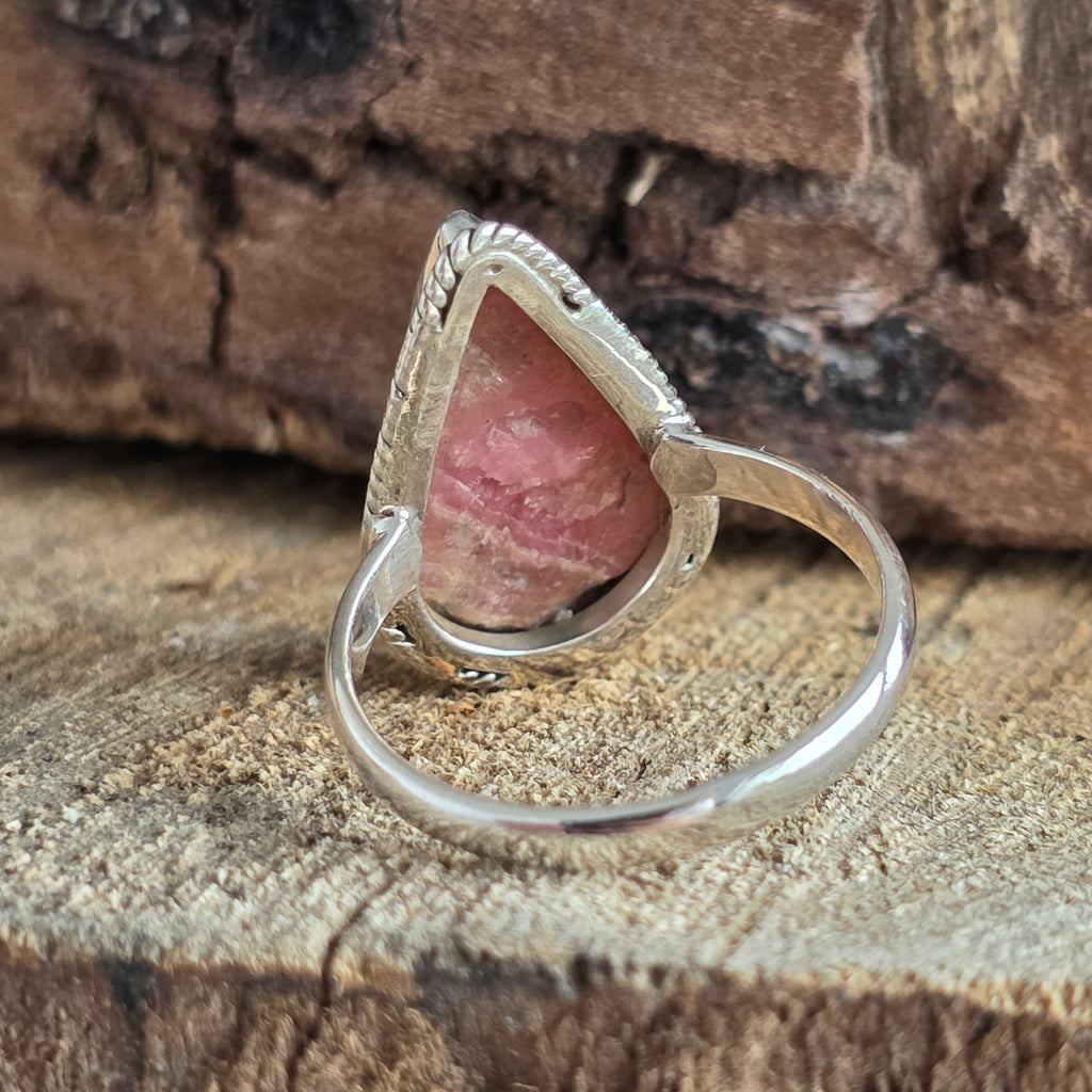 Un inel elegant din argint 925, cu rodocrozit natural într-o nuanță intensă de roz, cu reflexe calde și texturi unice. Designul twisted wire work, realizat manual, adaugă un farmec vintage și scoate în evidență naturalețea pietrei.