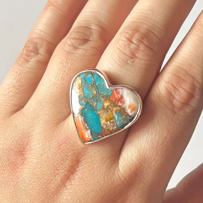 Poartă acest inel inimă din argint cu Spiny Oyster Turquoise pentru a exprima vitalitatea, frumusețea și forța interioară – o bijuterie unică, născută din îmbrățișarea mării și a pământului.