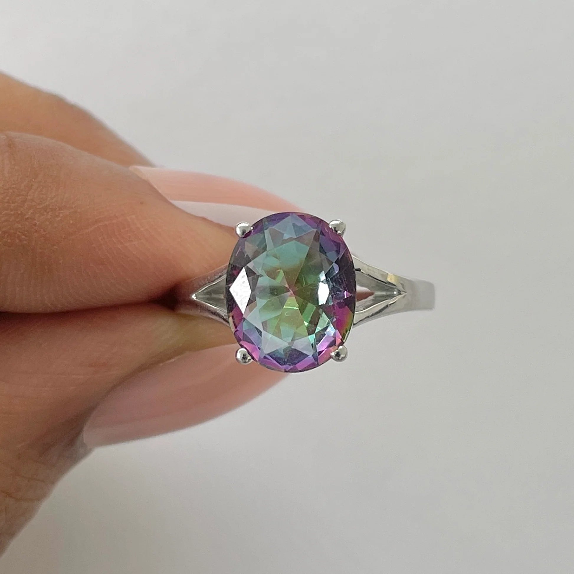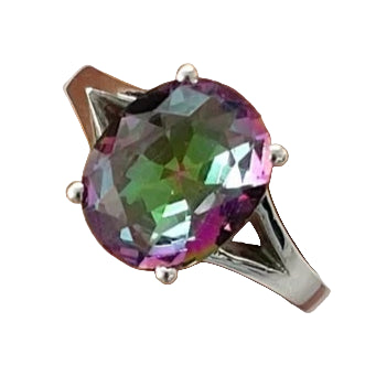 Acest inel din argint 925 cu topaz mistic este o bijuterie spectaculoasă, ce atrage privirea prin reflexiile sale caleidoscopice. Fiecare fațetă dezvăluie o explozie de culori – de la verde smarald și violet regal până la nuanțe albăstrui – creând o strălucire unică.