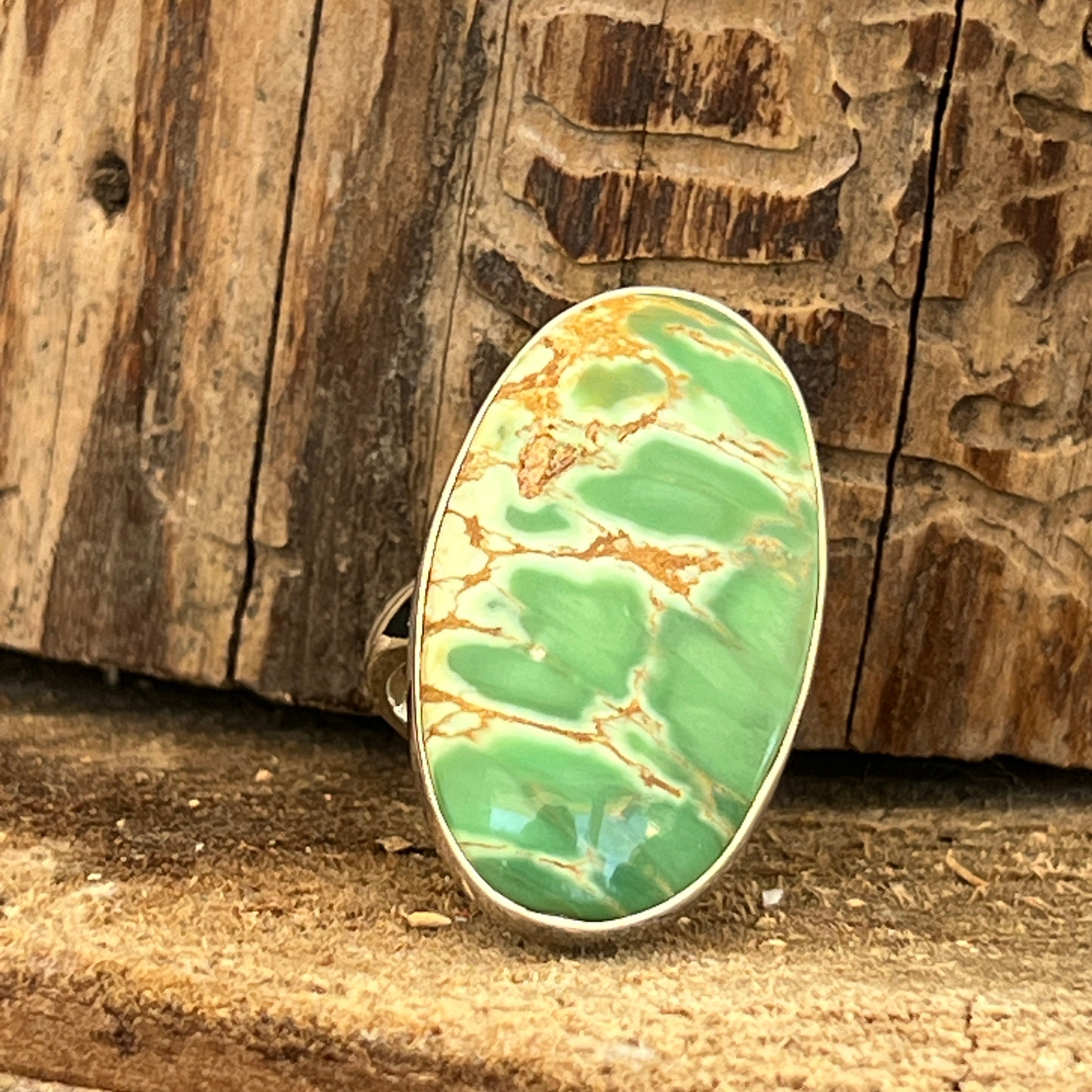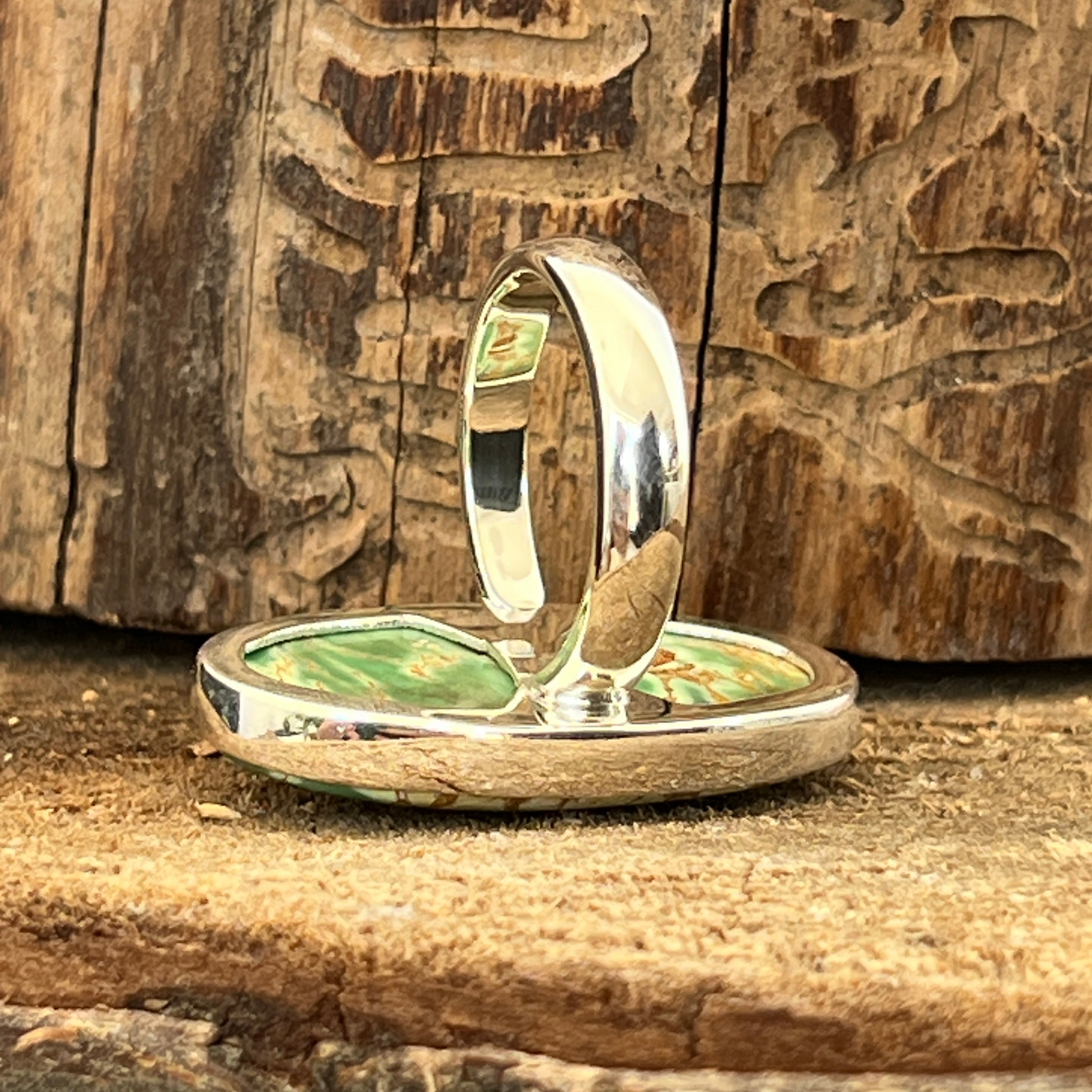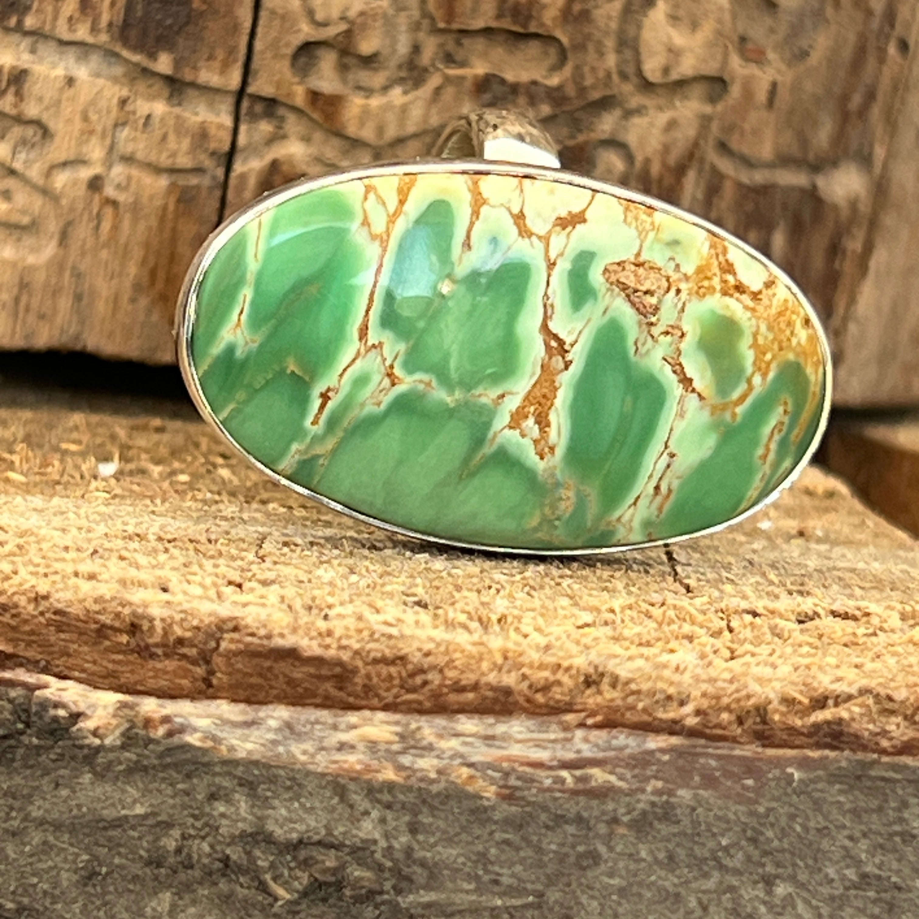 Acest inel unicat cu variscit dezvăluie frumusețea crudă a naturii, într-un dans de verde intens și vene aurii ce amintesc de rădăcinile pământului. Piatra sa ovală, luminoasă, evocă liniștea unui colț de pădure după ploaie și energia pură a începuturilor.
