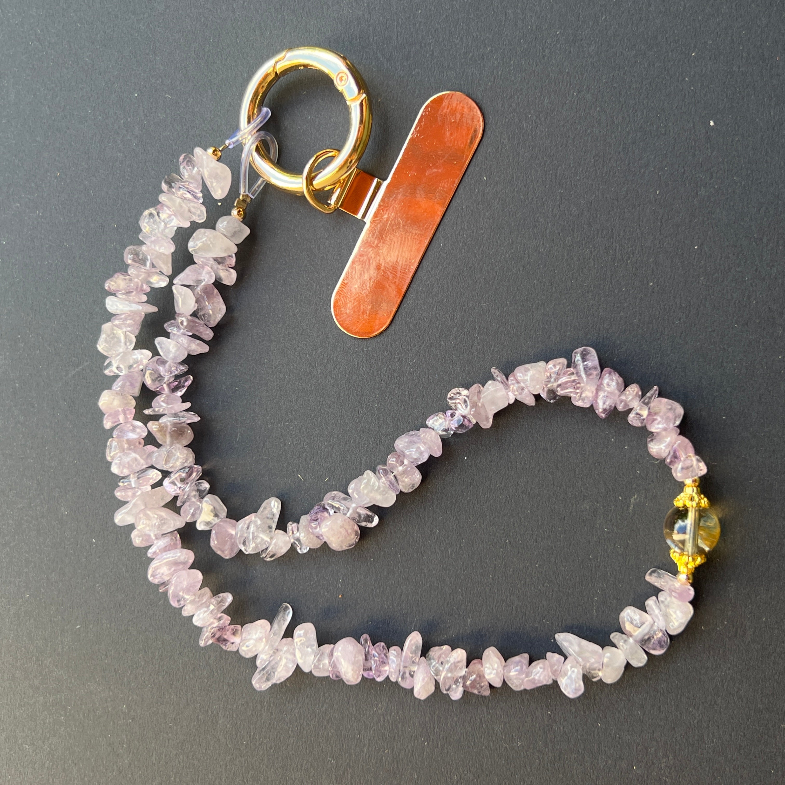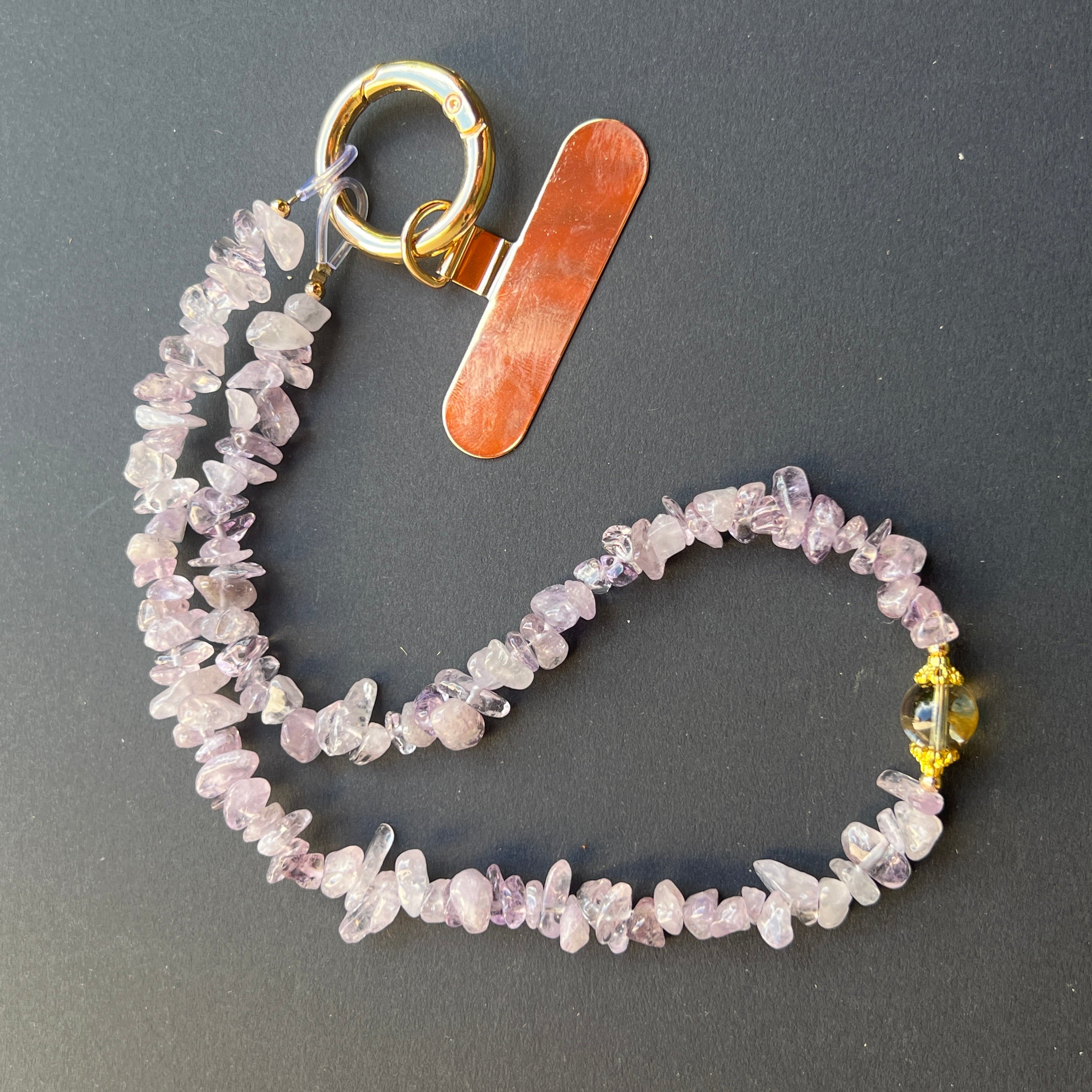 Completează-ți telefonul cu un lanț elegant realizat din chipsuri naturale de ametist, lung de 40 cm. Acest accesoriu aduce un plus de frumusețe și energie pozitivă în viața ta de zi cu zi.