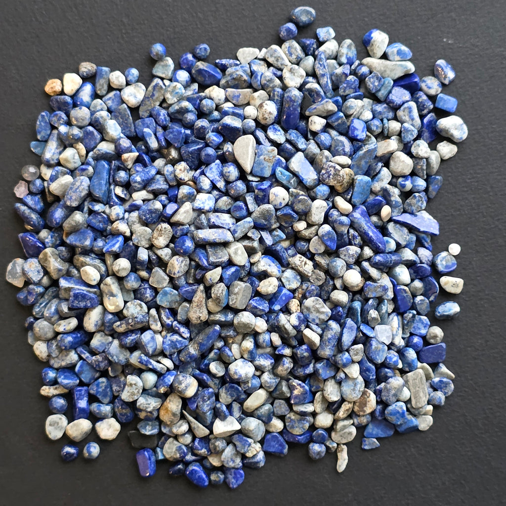 Lapis Lazuli este una dintre cele mai admirate pietre ale lumii vechi, renumită pentru albastrul său regal, intens, presărat cu particule aurii de pirită. În forma de chipsuri, aceste fragmente fine păstrează combinația naturală dintre albastru profund, vene discrete de calcit alb și sclipiri metalice subtile, creând un amestec vizual spectaculos și elegant.
