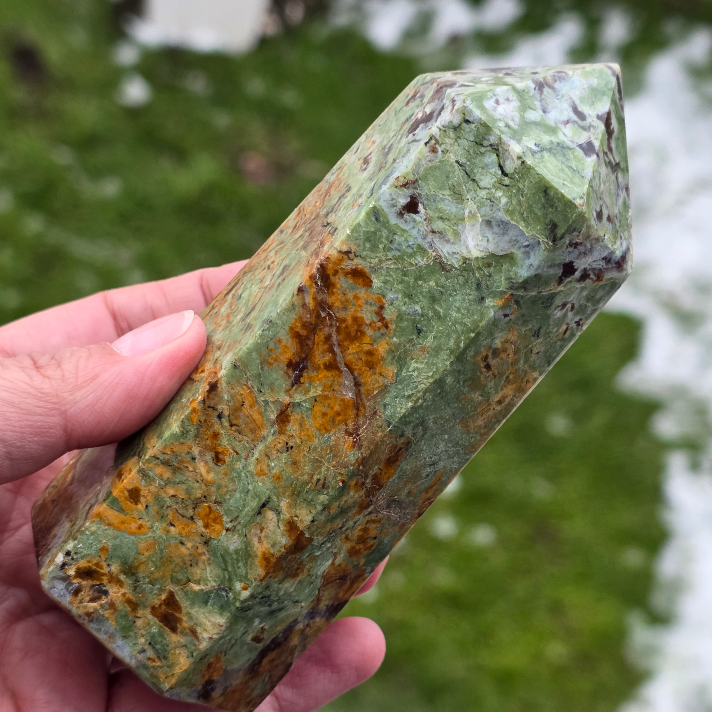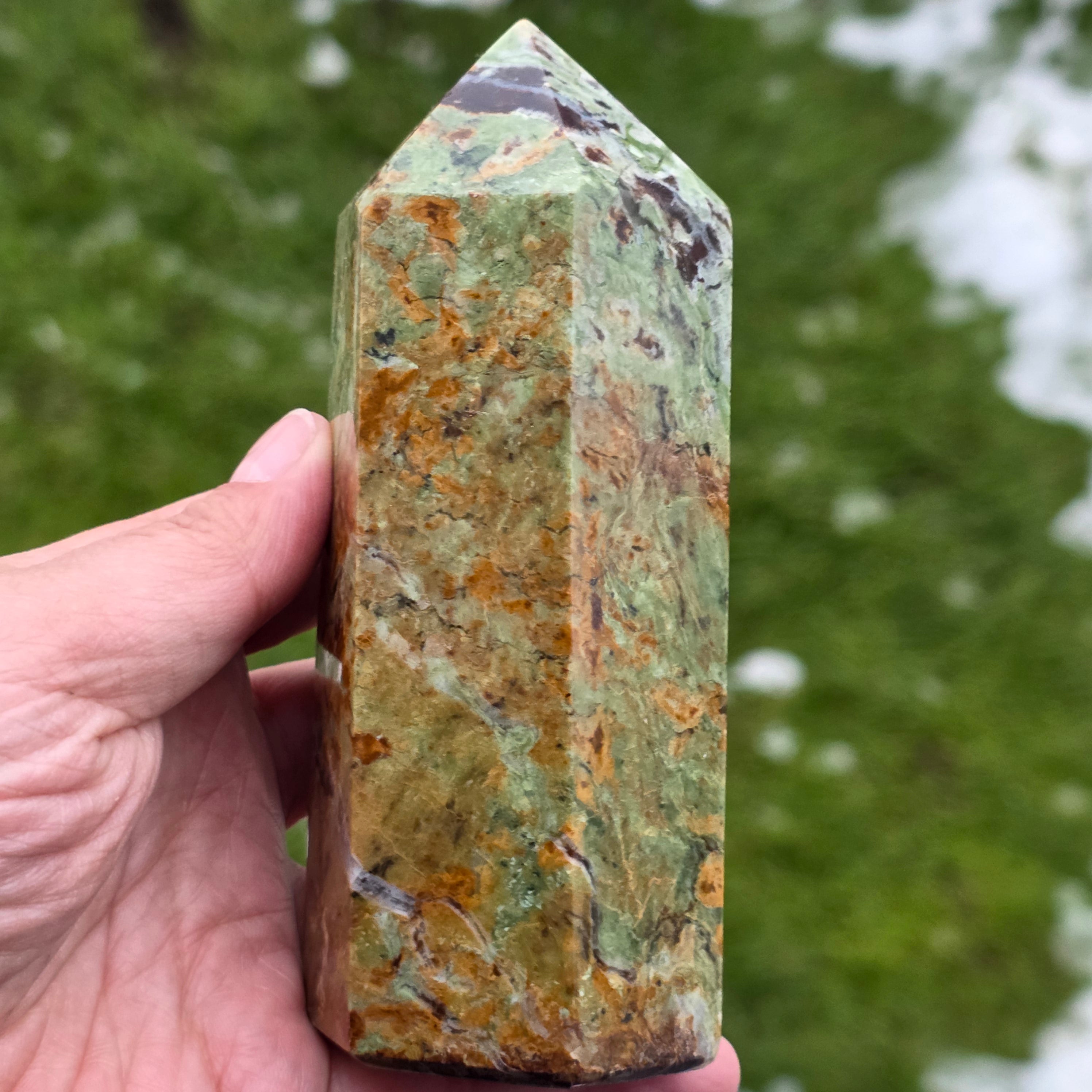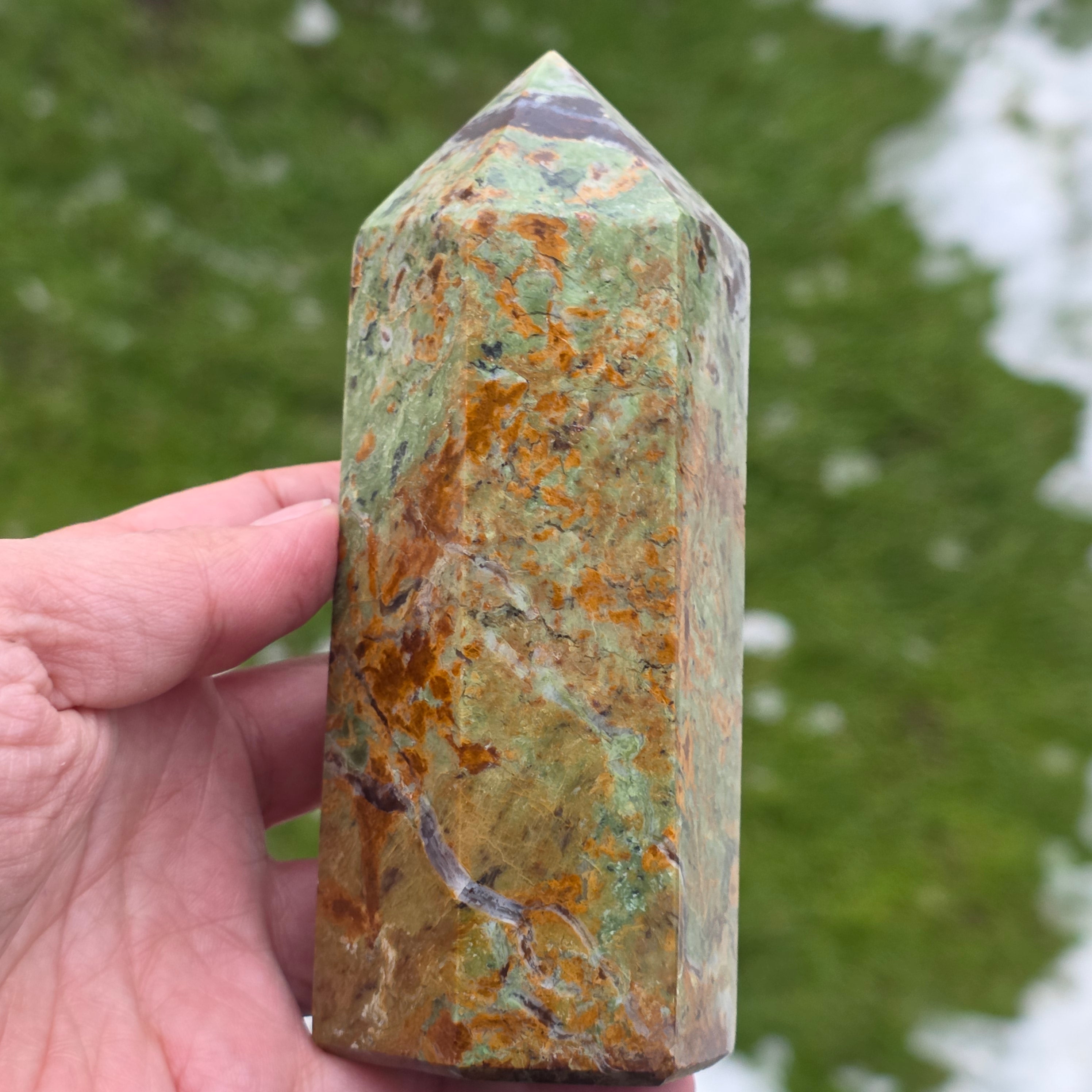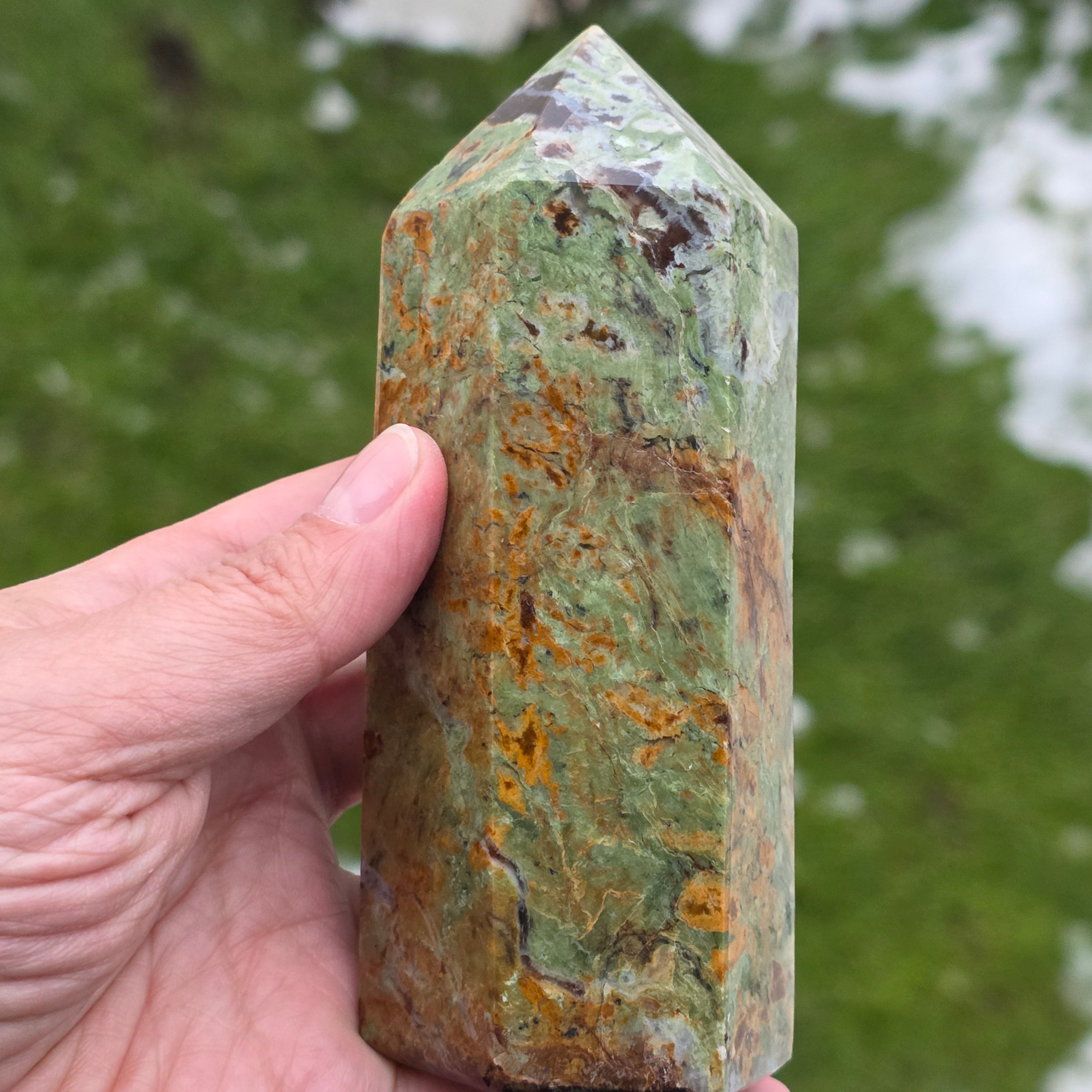 Acest obelisc din crisopraz natural, calitate A, impresionează prin nuanțele sale proaspete de verde și prin energia sa blândă, revitalizantă. Este o piesă potrivită pentru spații de meditație, birou sau colțuri dedicate echilibrului interior. Crisoprazul este asociat cu deschiderea inimii, regenerarea emoțională și susținerea în perioade de schimbare, fiind considerat un cristal al reînnoirii și al optimismului liniștit. Forma de obelisc ajută la direcționarea energiei într-un mod coerent, oferind claritate și susținere subtilă în procesele de introspecție și armonizare.