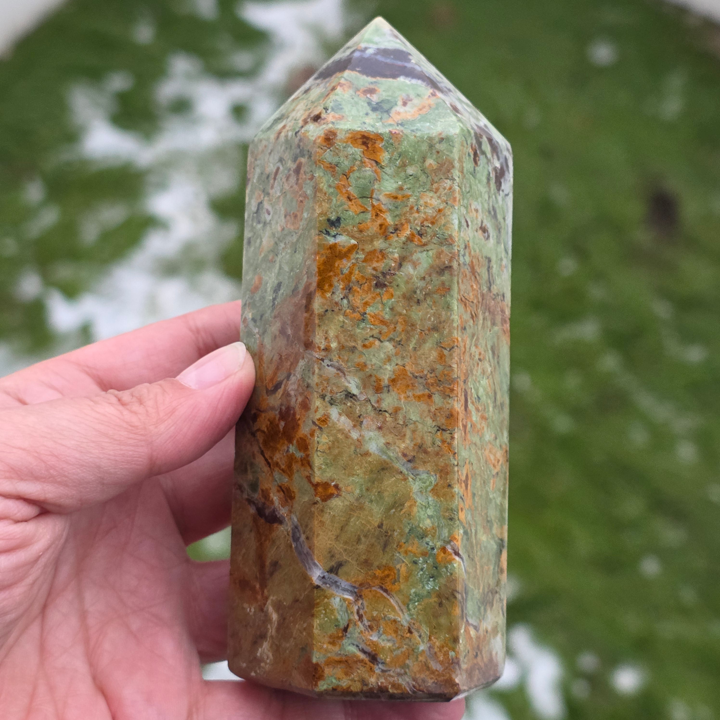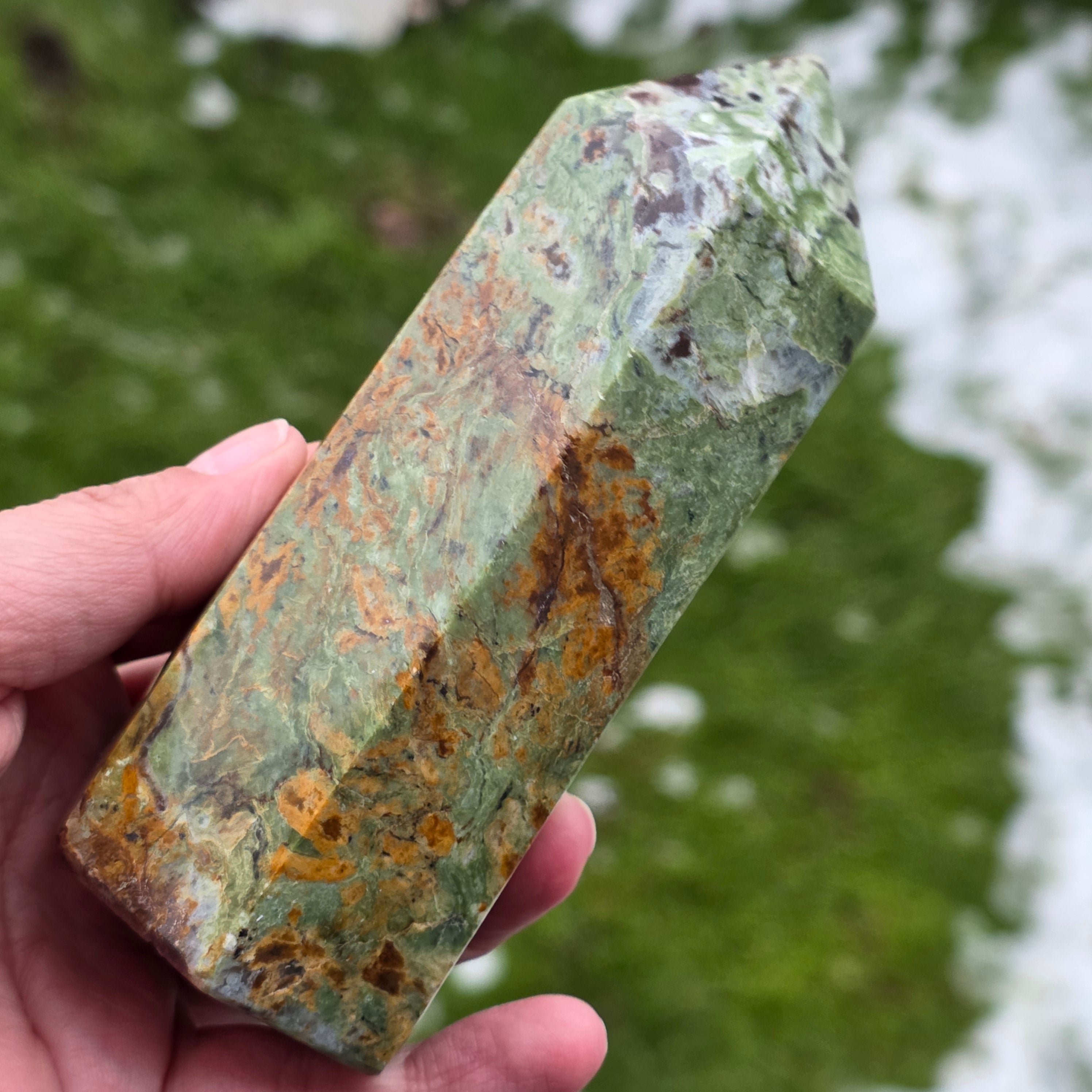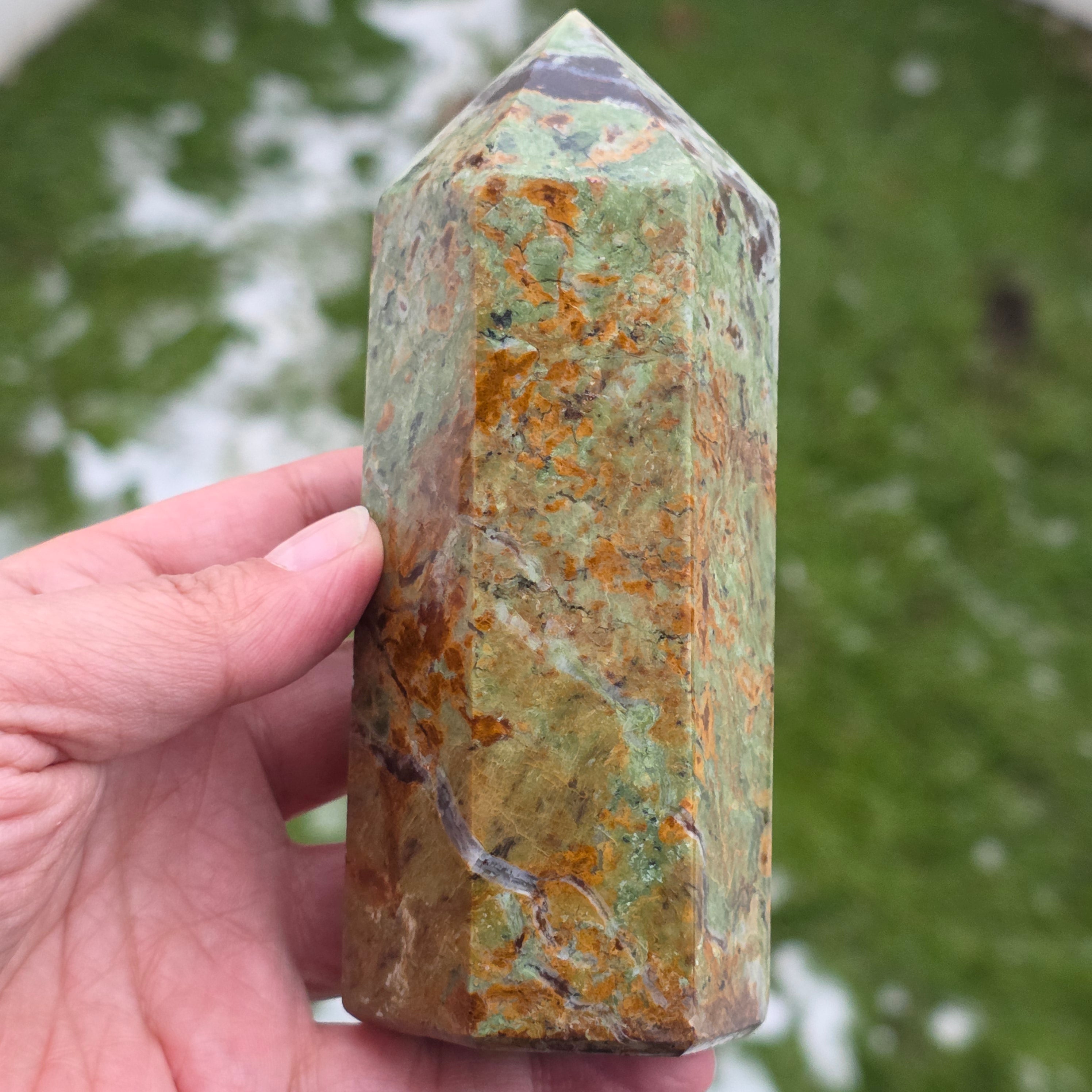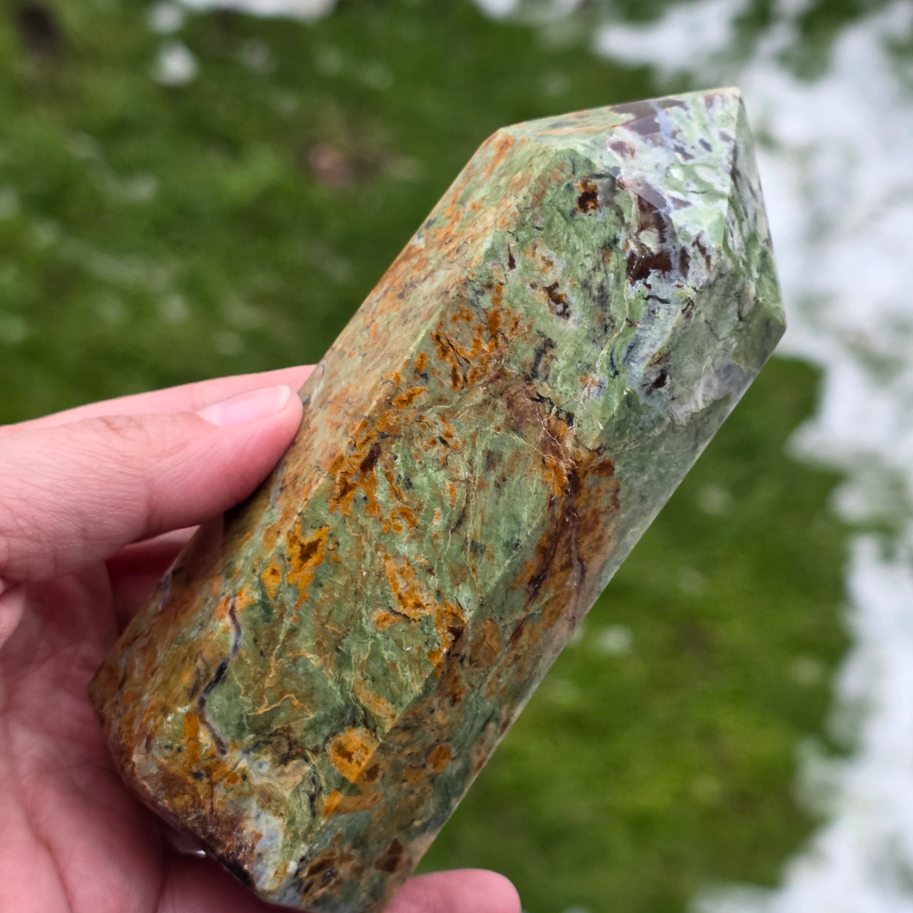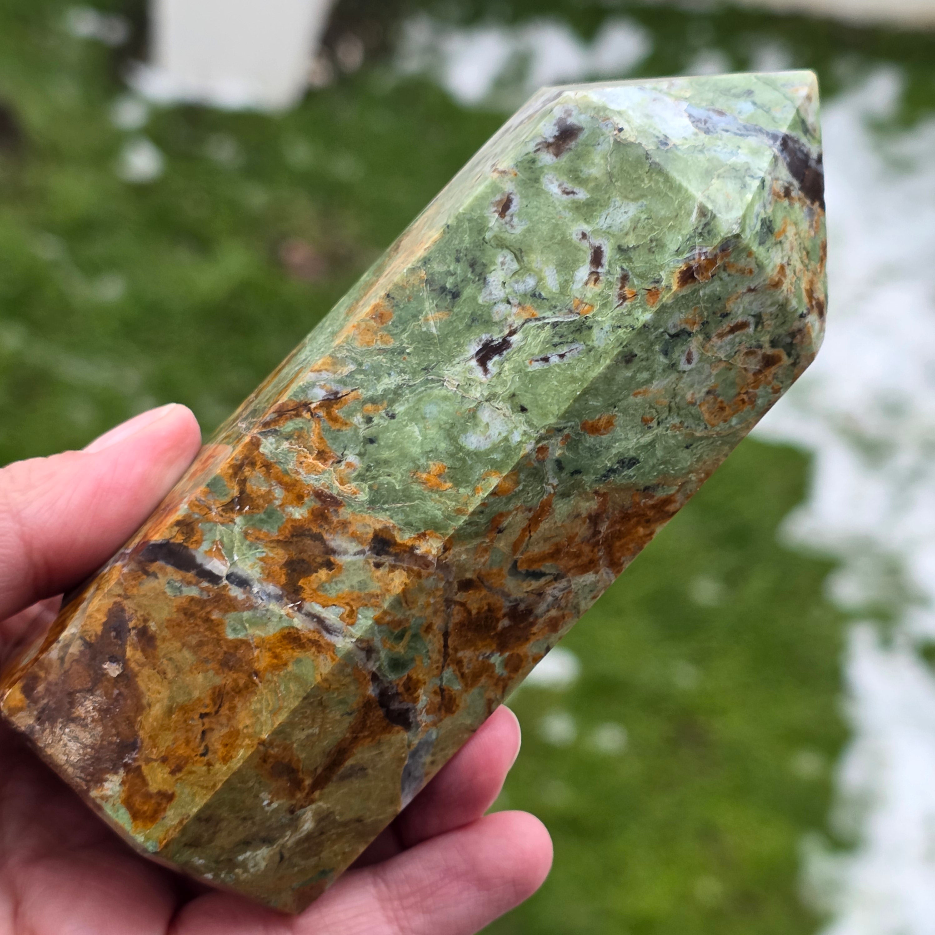 Acest obelisc din crisopraz natural, calitate A, impresionează prin nuanțele sale proaspete de verde și prin energia sa blândă, revitalizantă. Este o piesă potrivită pentru spații de meditație, birou sau colțuri dedicate echilibrului interior. Crisoprazul este asociat cu deschiderea inimii, regenerarea emoțională și susținerea în perioade de schimbare, fiind considerat un cristal al reînnoirii și al optimismului liniștit. Forma de obelisc ajută la direcționarea energiei într-un mod coerent, oferind claritate și susținere subtilă în procesele de introspecție și armonizare.