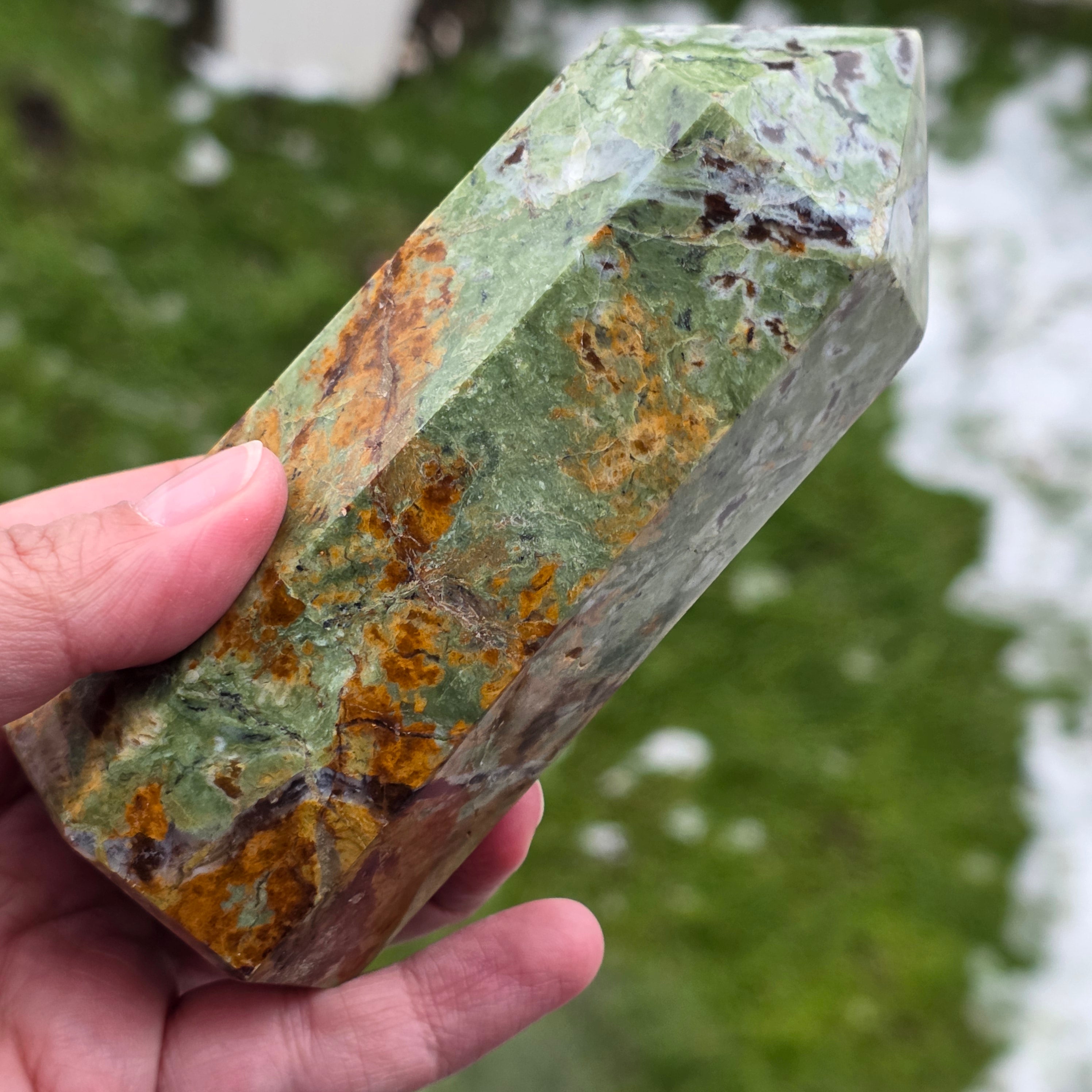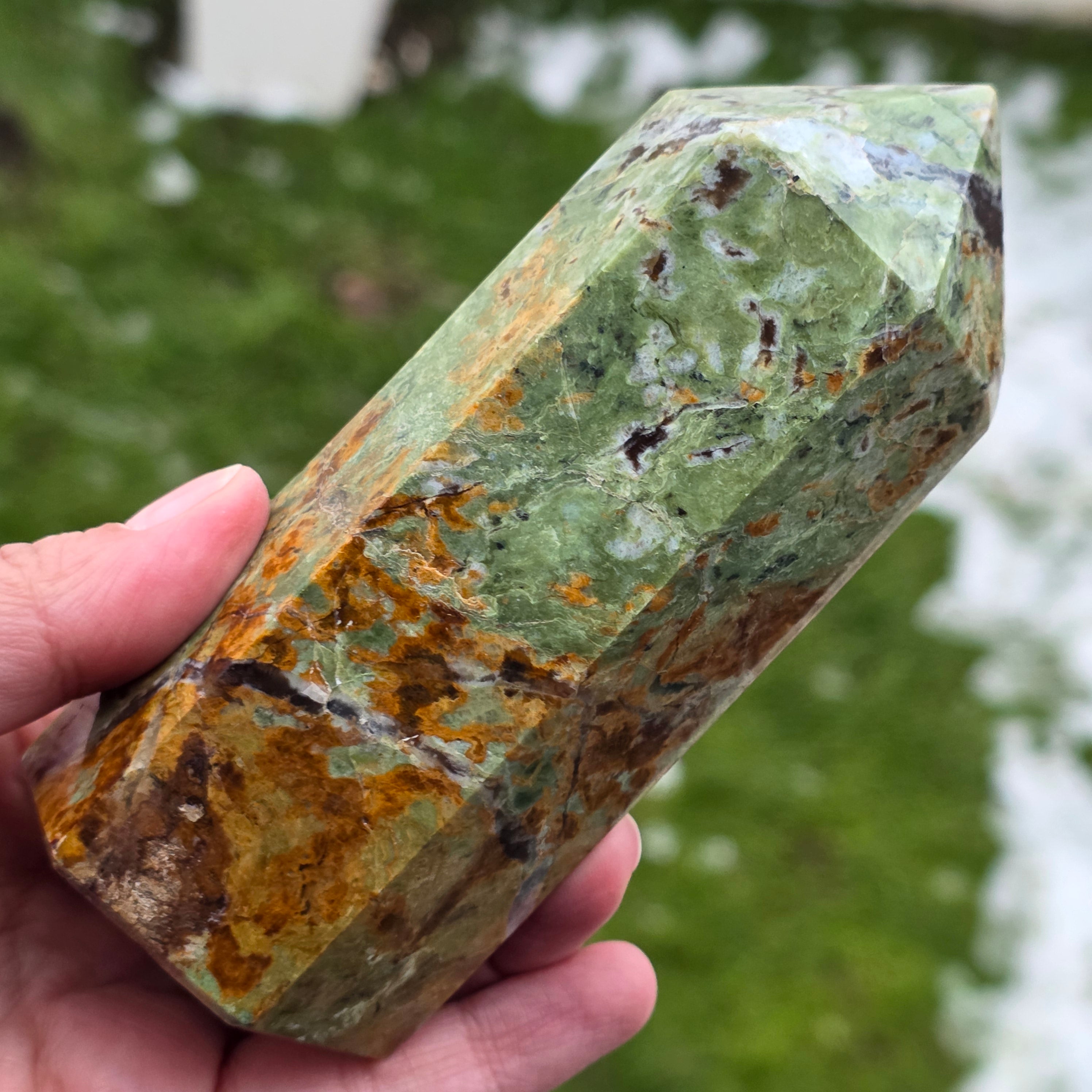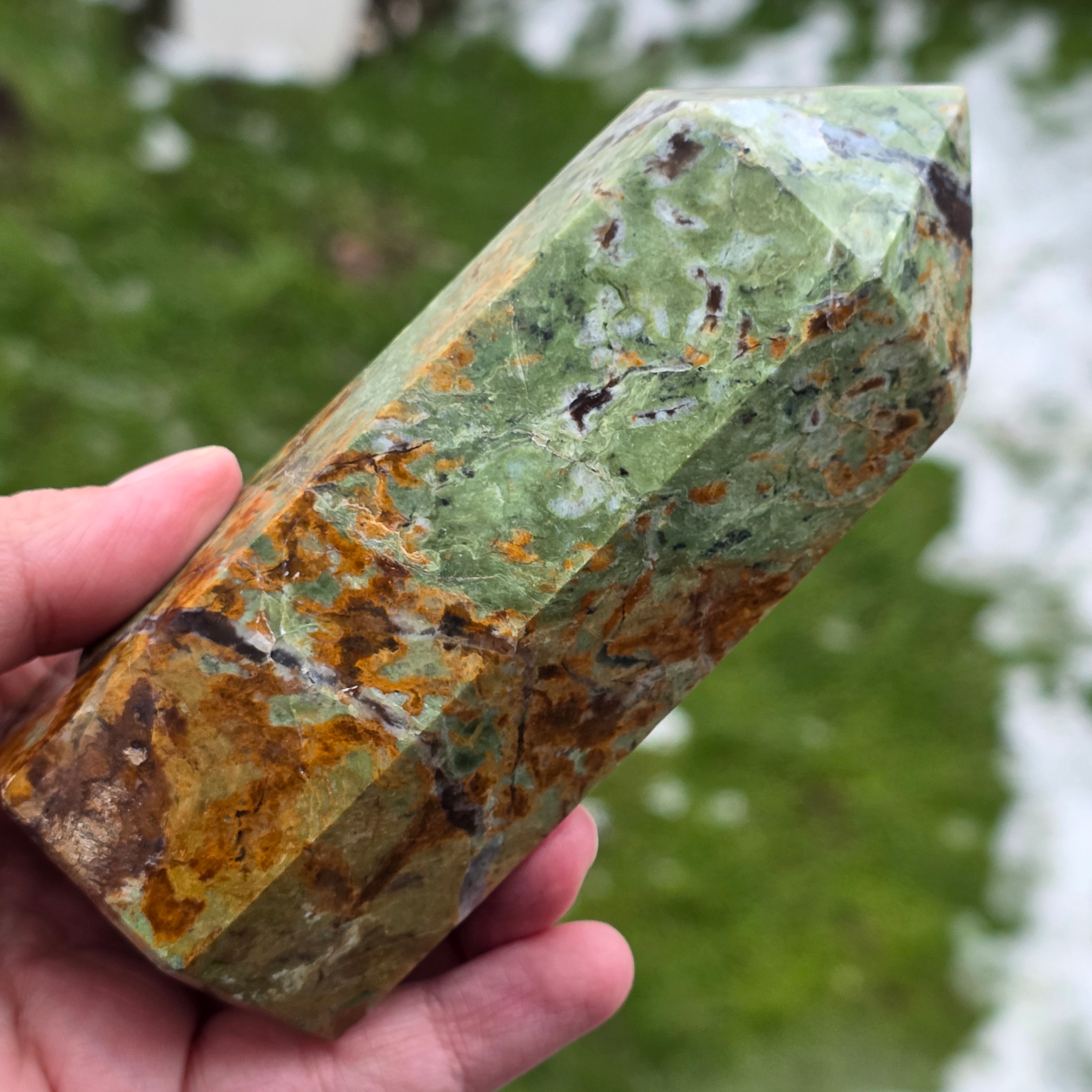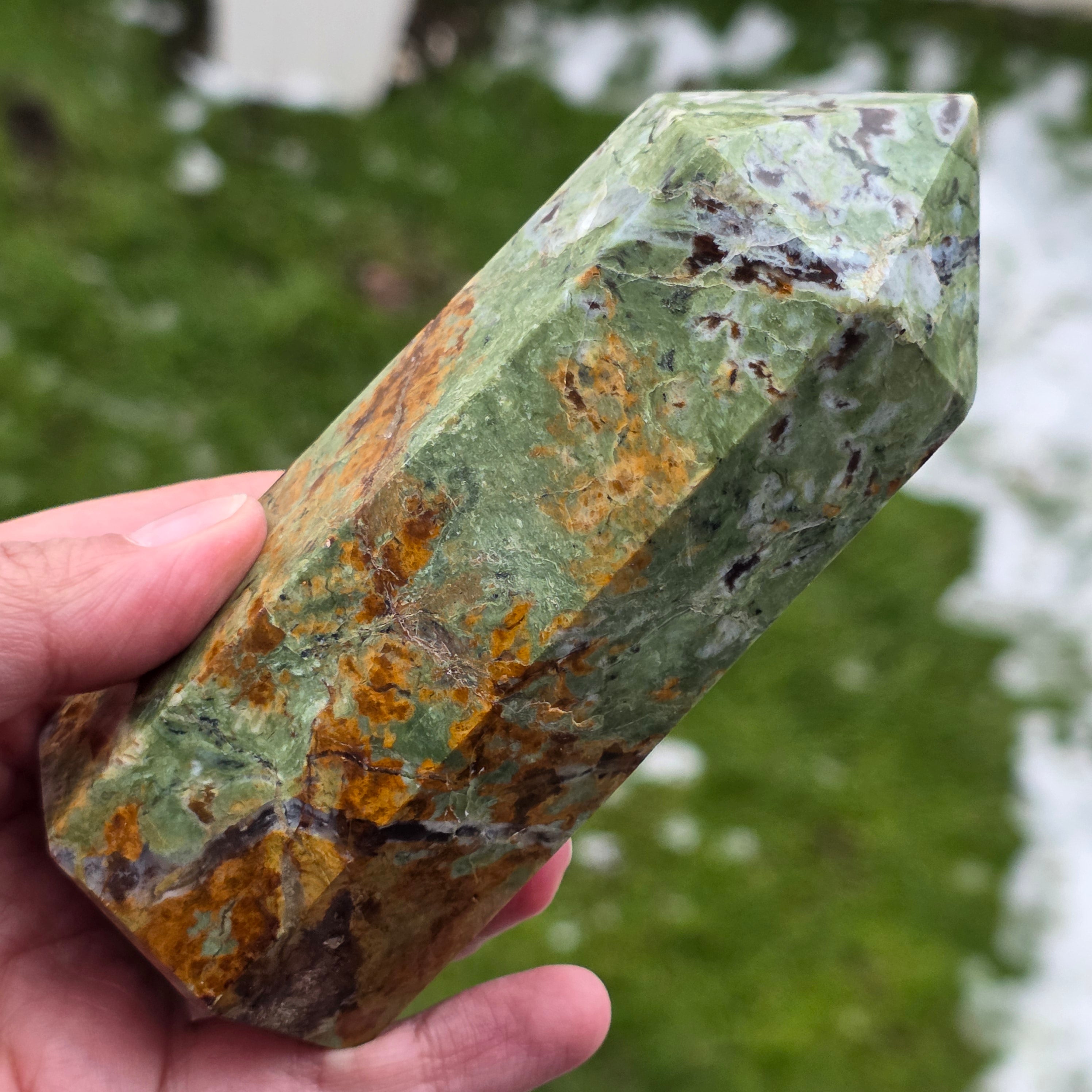 Acest obelisc din crisopraz natural, calitate A, impresionează prin nuanțele sale proaspete de verde și prin energia sa blândă, revitalizantă. Este o piesă potrivită pentru spații de meditație, birou sau colțuri dedicate echilibrului interior. Crisoprazul este asociat cu deschiderea inimii, regenerarea emoțională și susținerea în perioade de schimbare, fiind considerat un cristal al reînnoirii și al optimismului liniștit. Forma de obelisc ajută la direcționarea energiei într-un mod coerent, oferind claritate și susținere subtilă în procesele de introspecție și armonizare.