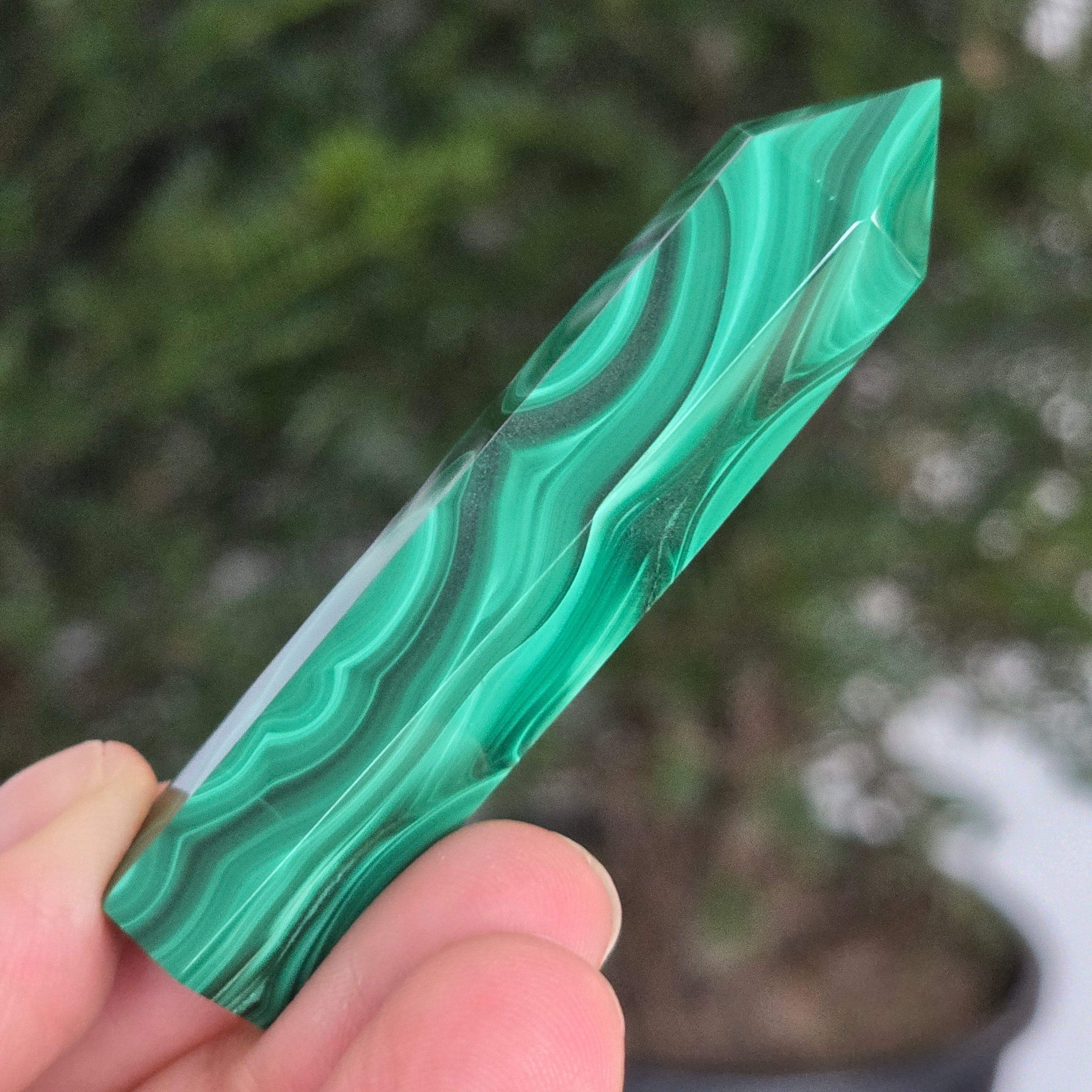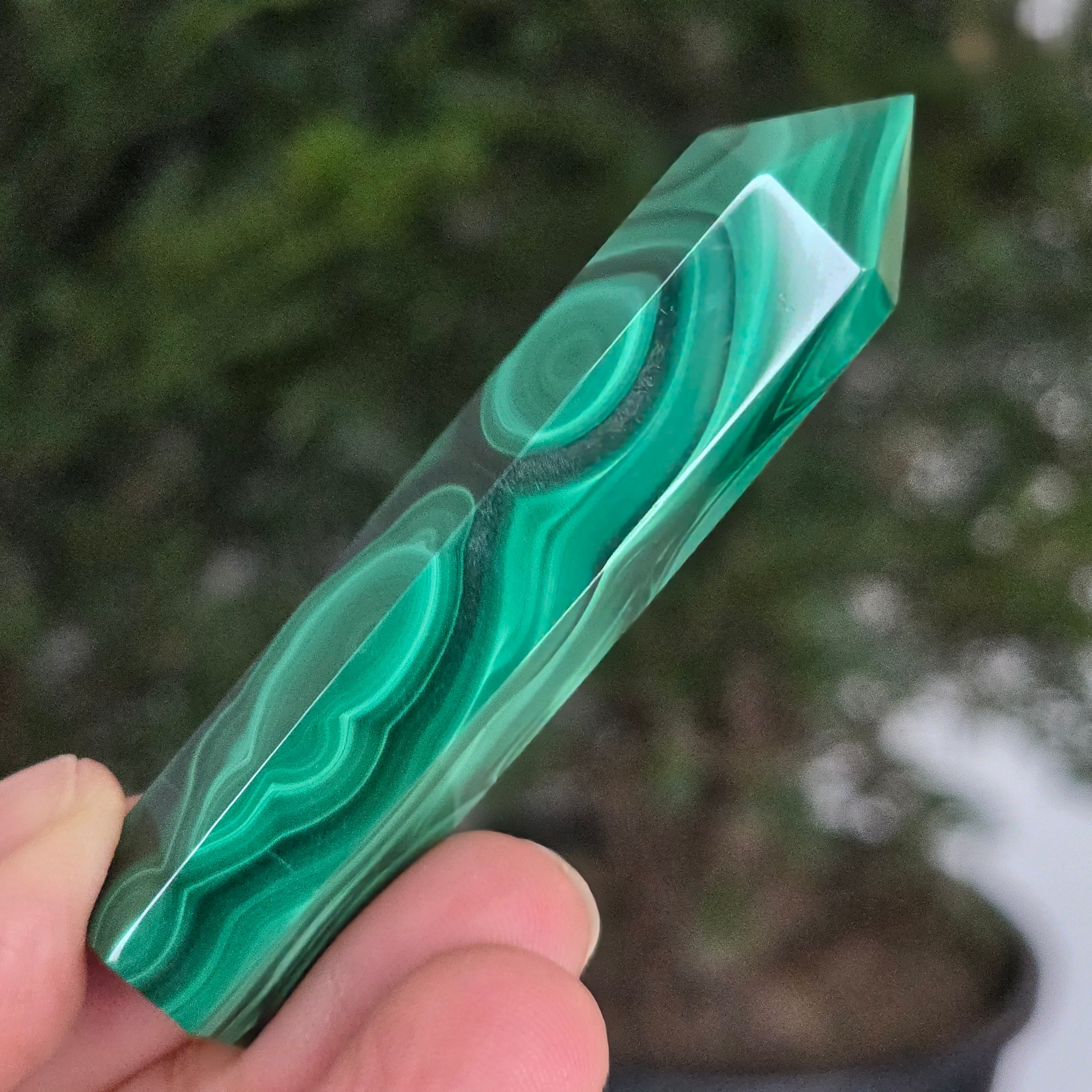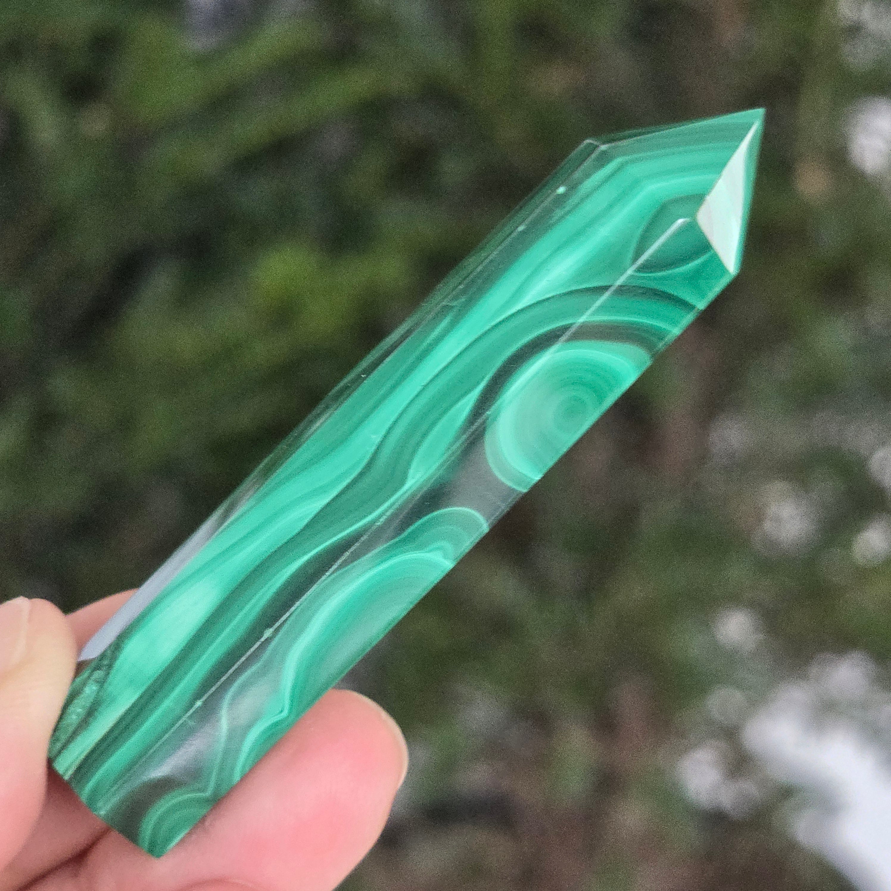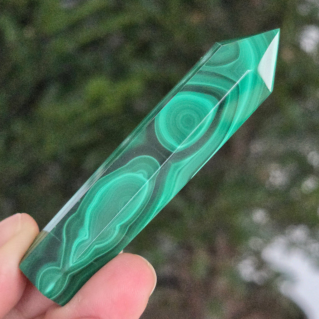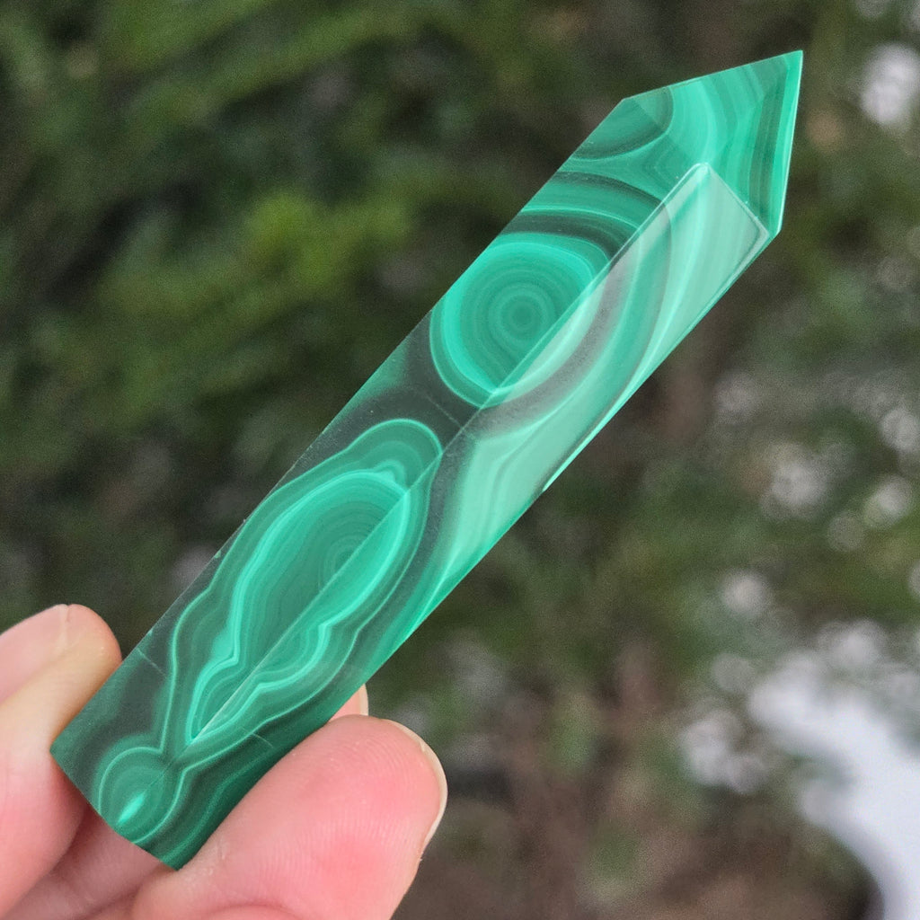Un obelisc ce pare să fi prins viață din adâncurile verzi ale planetei. Această piesă unicat din malachit natural, dezvăluie straturi fascinante de verde smarald, verde închis și nuanțe mătăsoase de jad, dispuse în modele concentrice unice, ca niște hărți ale energiilor interioare. Polişat manual până la o strălucire catifelată, obeliscul emană o eleganță minerală profundă.