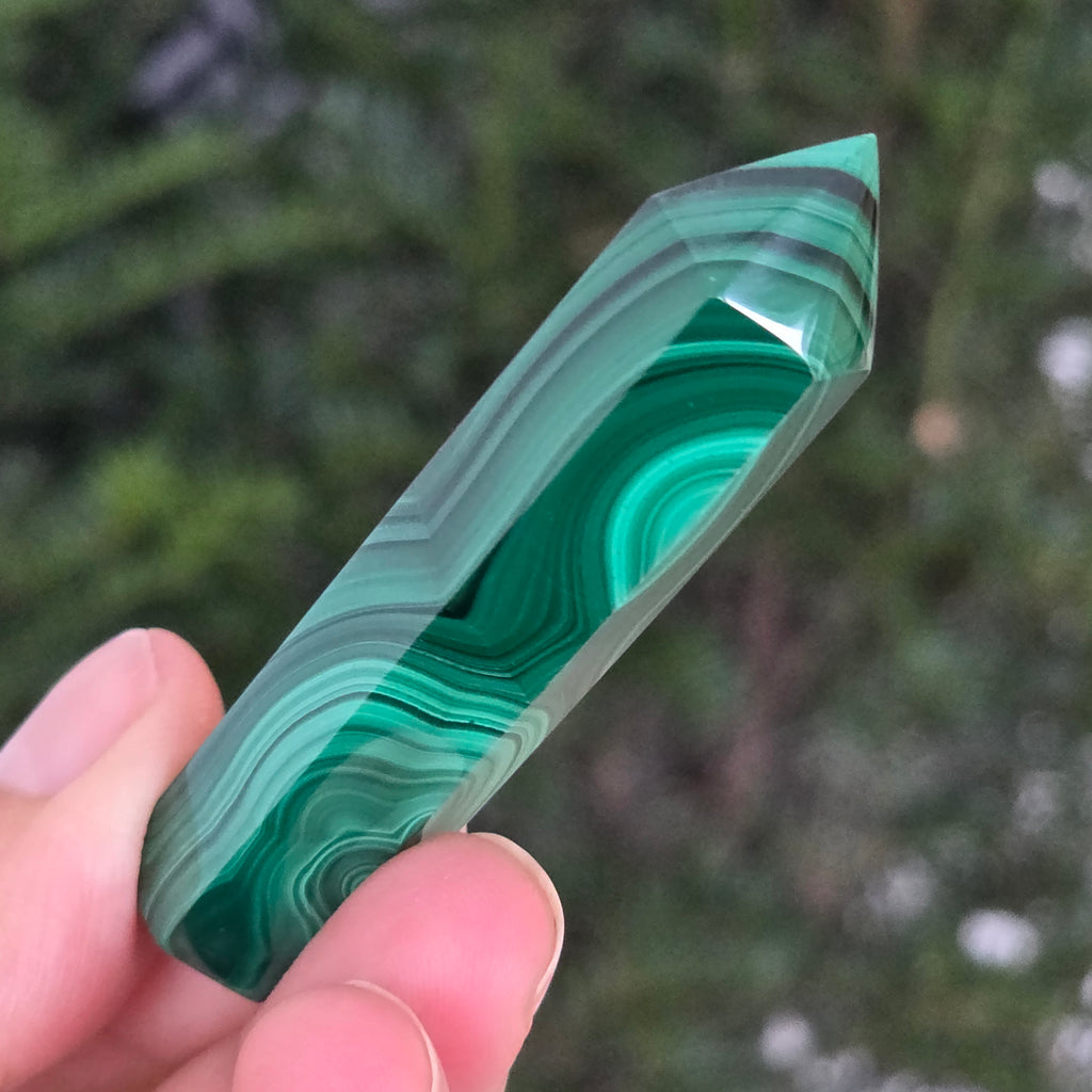 Un obelisc ce pare să fi prins viață din adâncurile verzi ale planetei. Această piesă unicat din malachit natural, dezvăluie straturi fascinante de verde smarald, verde închis și nuanțe mătăsoase de jad, dispuse în modele concentrice unice, ca niște hărți ale energiilor interioare. Polişat manual până la o strălucire catifelată, obeliscul emană o eleganță minerală profundă.