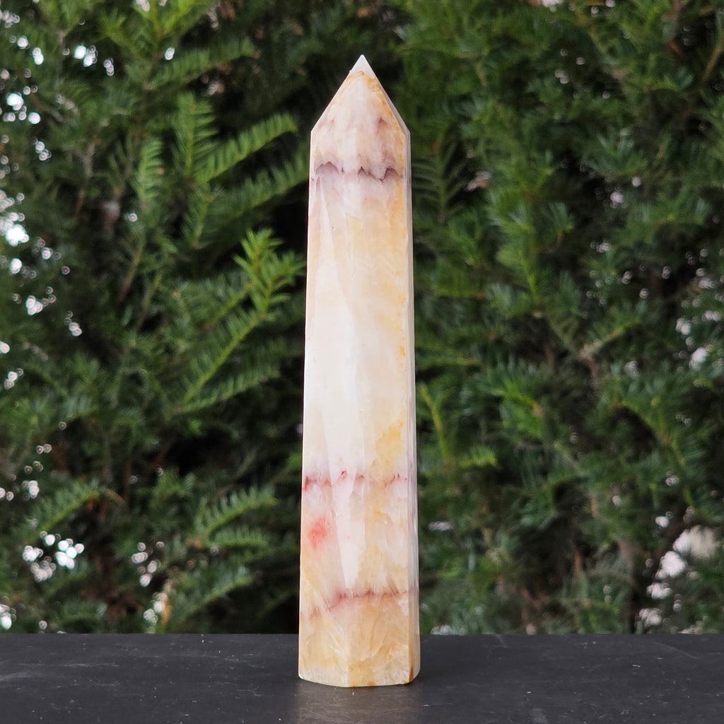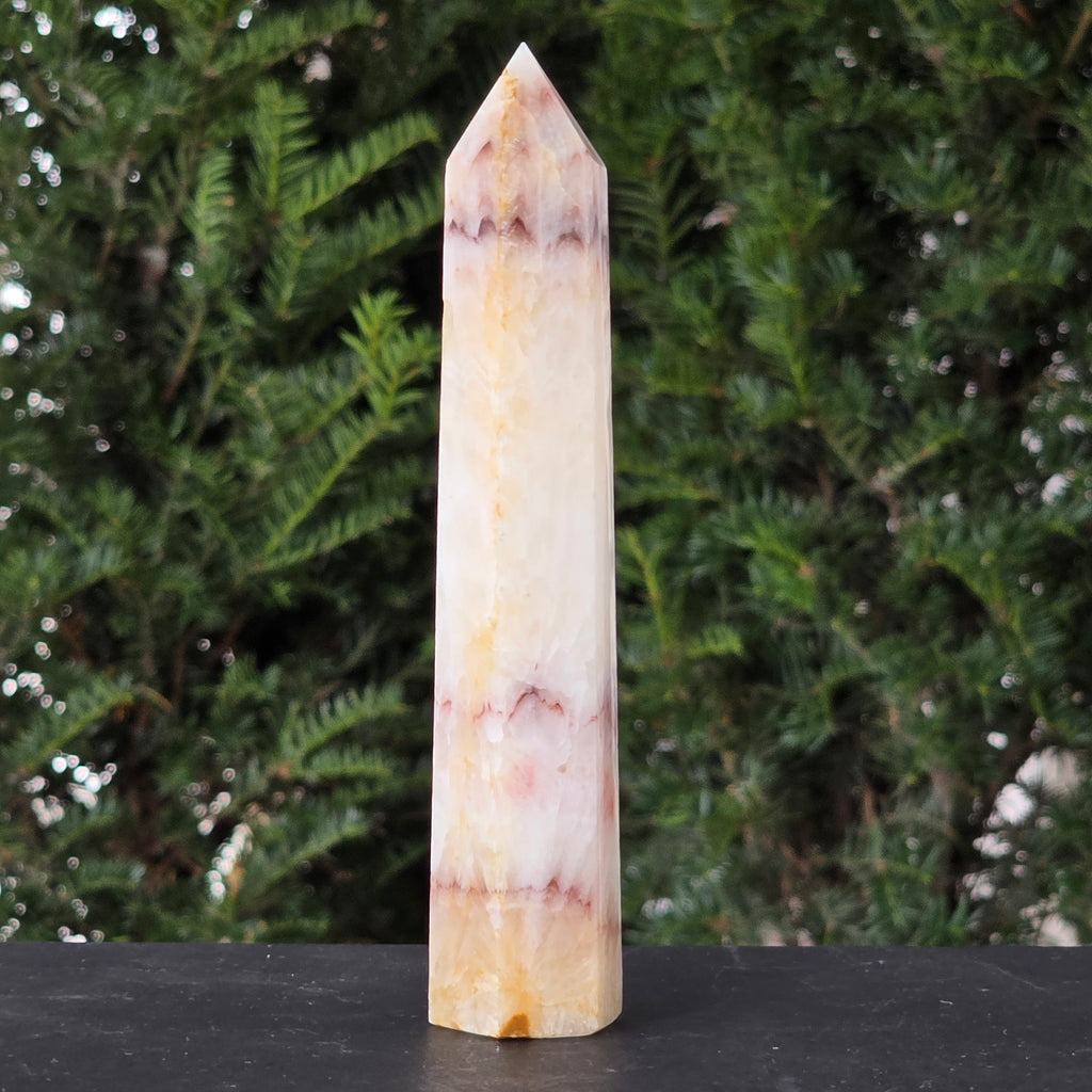 Această piatră fascinantă îmbină onixul portocaliu cu vene delicate de calcit, în straturi care par pictate de timp. Nuanțele vibrante de portocaliu, miere și chihlimbar pulsează cu energia vieții și aduc o notă de vitalitate oricărui spațiu. Este o piesă care trezește simțurile și inspiră creativitatea, dar păstrează în același timp un echilibru profund, ancorat în energia pământului.