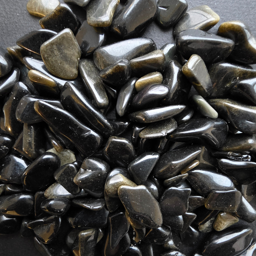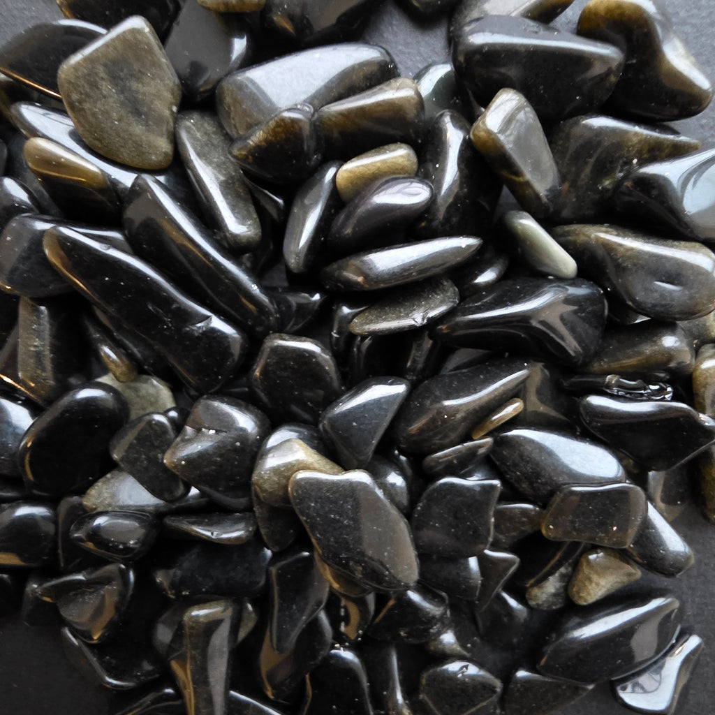 Obsidianul, sticla vulcanică formată din foc și răcire bruscă, își păstrează în aceste chipsuri esența intensă și misterioasă. Nuanțele sale predominant negre, uneori cu reflexe sticloase sau pete fumurii, creează un amestec vizual profund și compact, exact așa cum ne-am aștepta de la o piatră născută direct din energia Pământului.